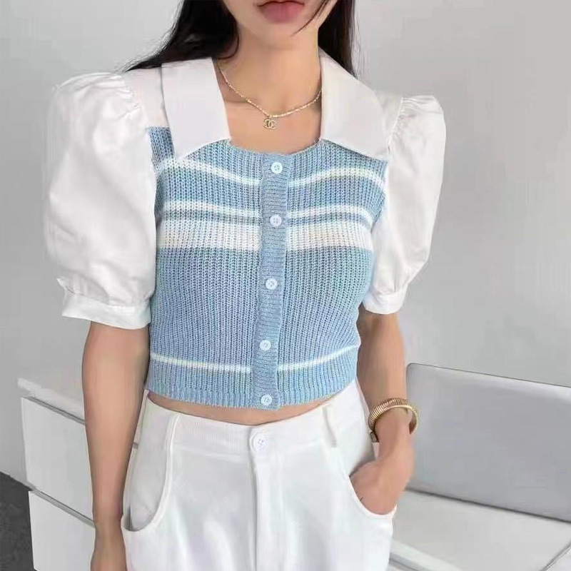 대비 스트라이프 퍼프 슬리브 니트 여성의 여름 새로운 순수한 욕망 스타일 섹시한 짧은 모든 매치 달콤한 스파이스 걸 탑