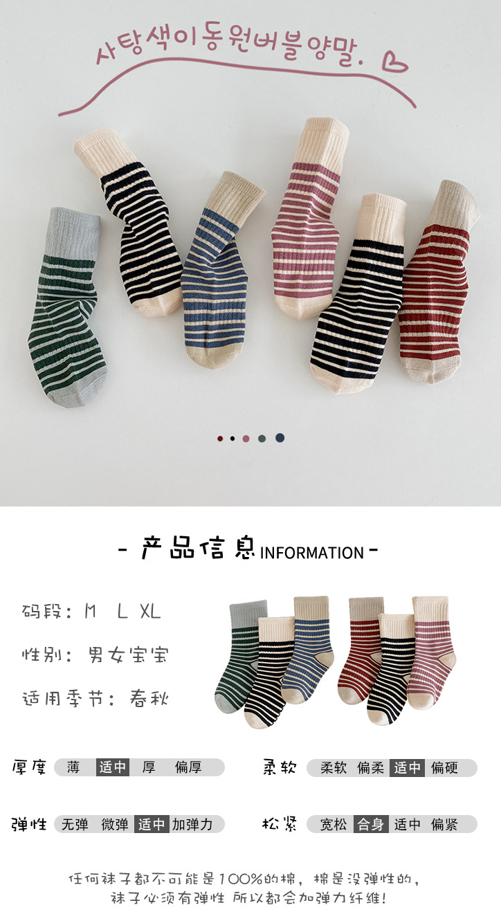 1511 아동용 양말 도매 25 봄 가을 신상 심플 스트라이프 아기 중목 양말 면 무봉제 남아 여아 양말스토어 가기
