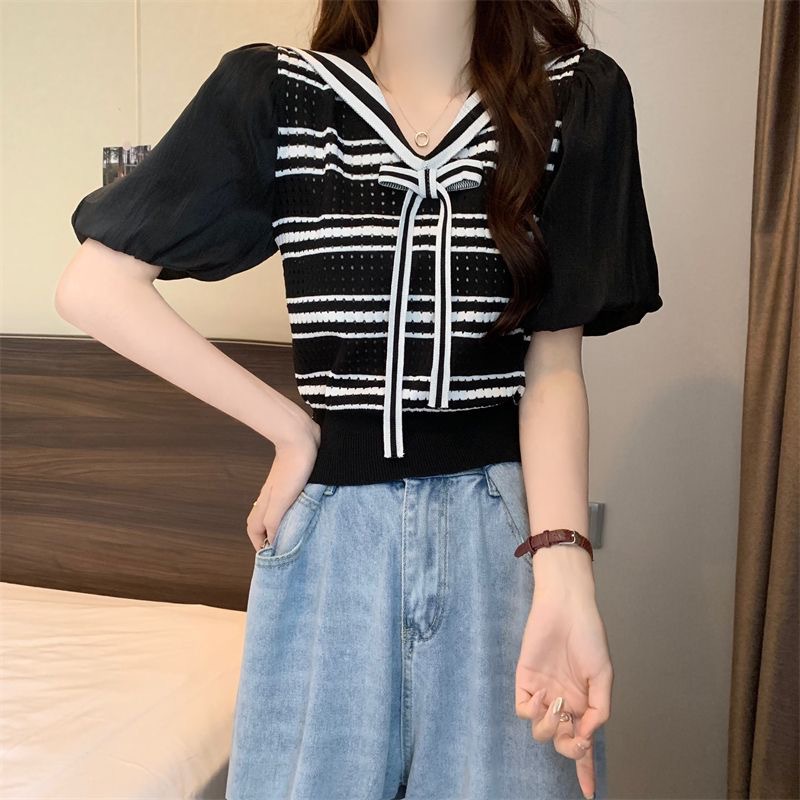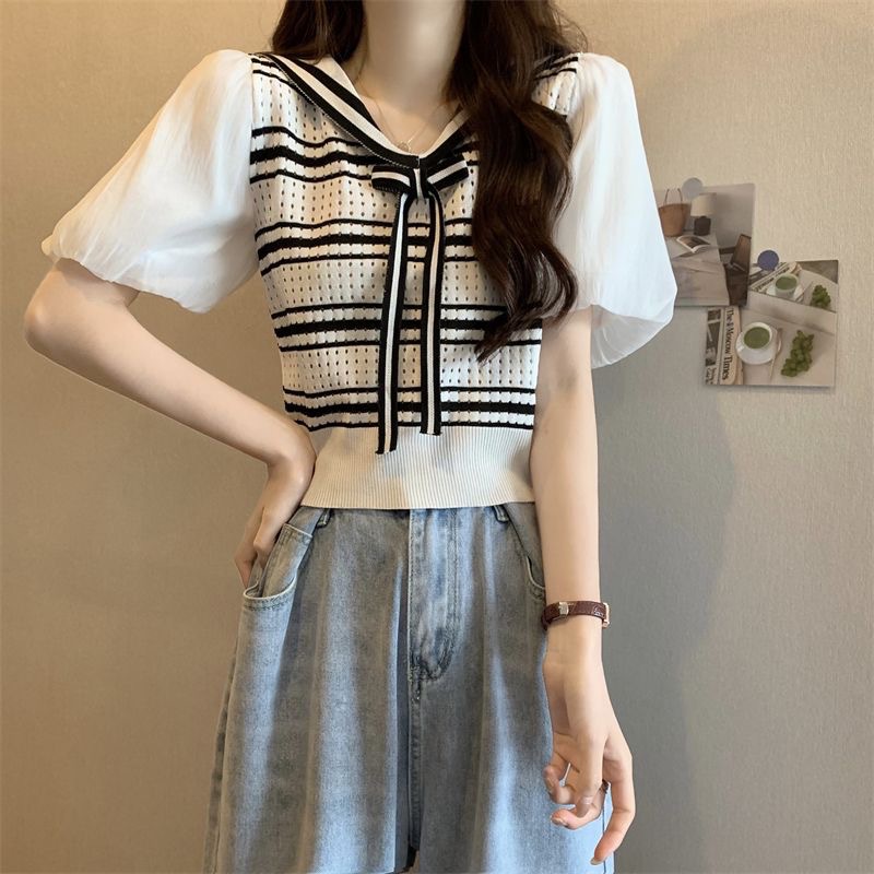 2023 여름 새로운 한국 스타일 아카데미 스타일 우아한 네이비 칼라 버블 여성용 반팔 슬림핏 스트라이프 스웨터 탑
