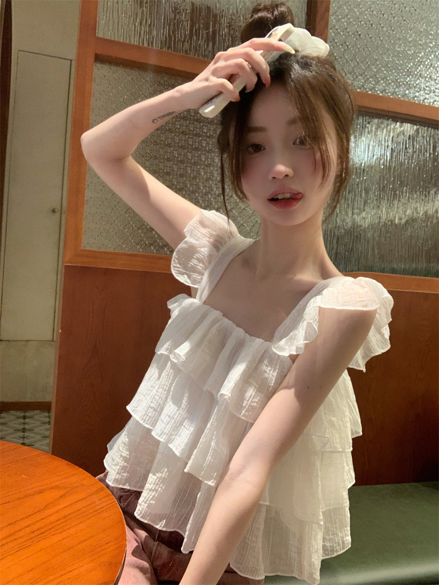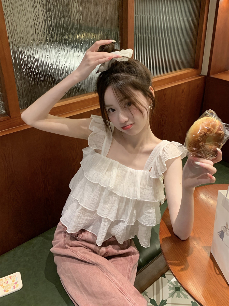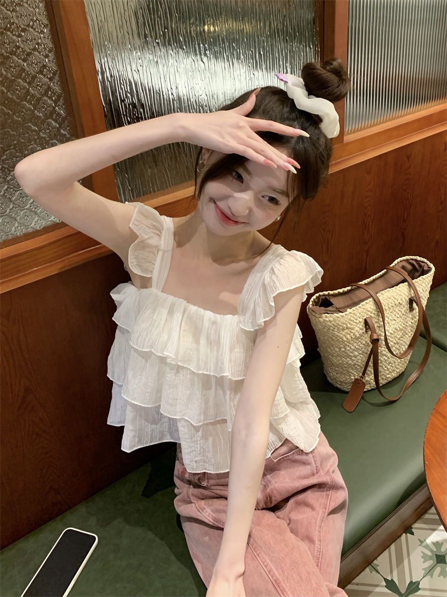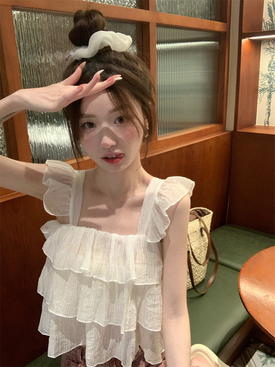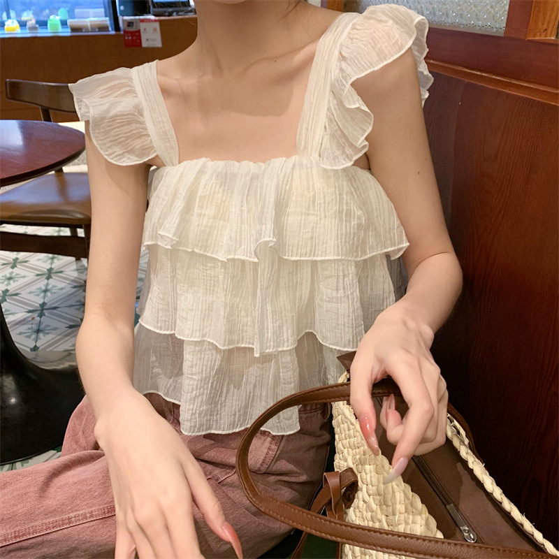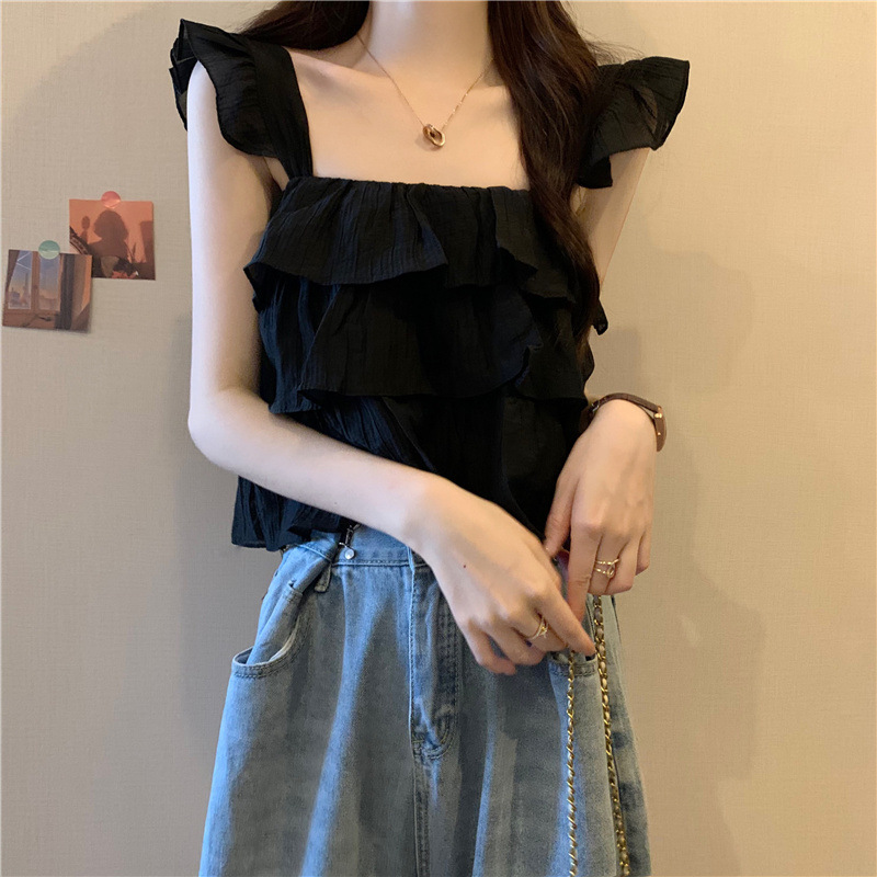 프랑스 스타일 달콤한 러플 캐미솔 여성의 여름 겉옷 달콤한 향신료 소녀 디자인 감각 작은 플라이 슬리브 민소매 짧은 탑