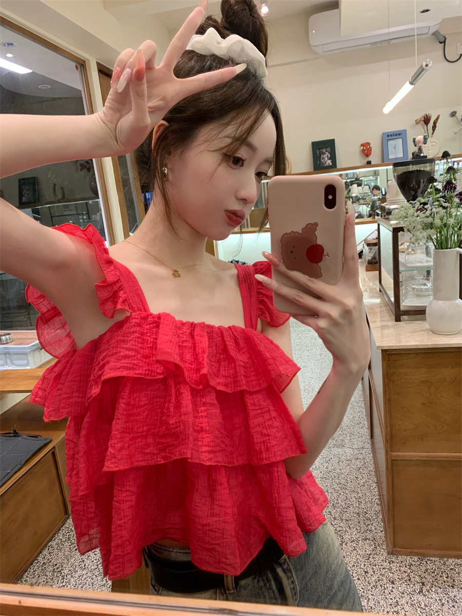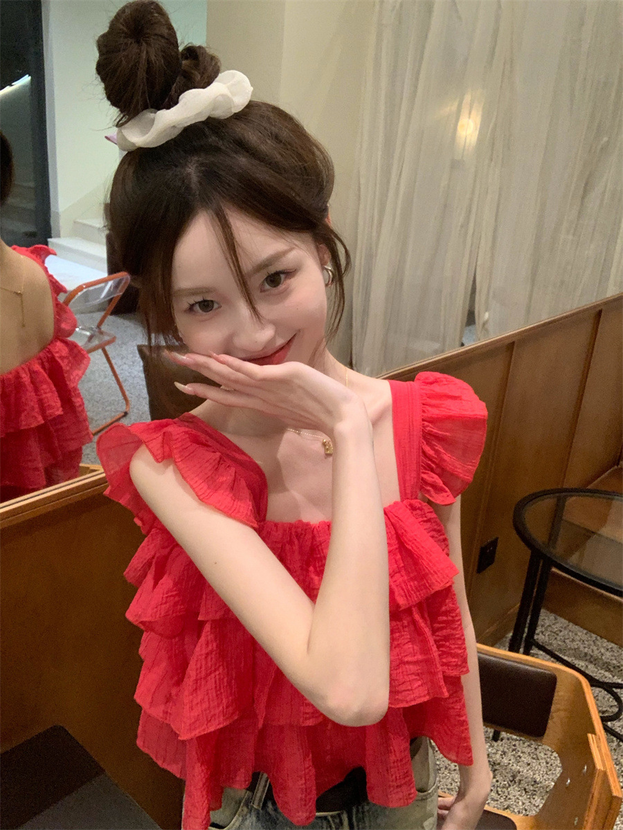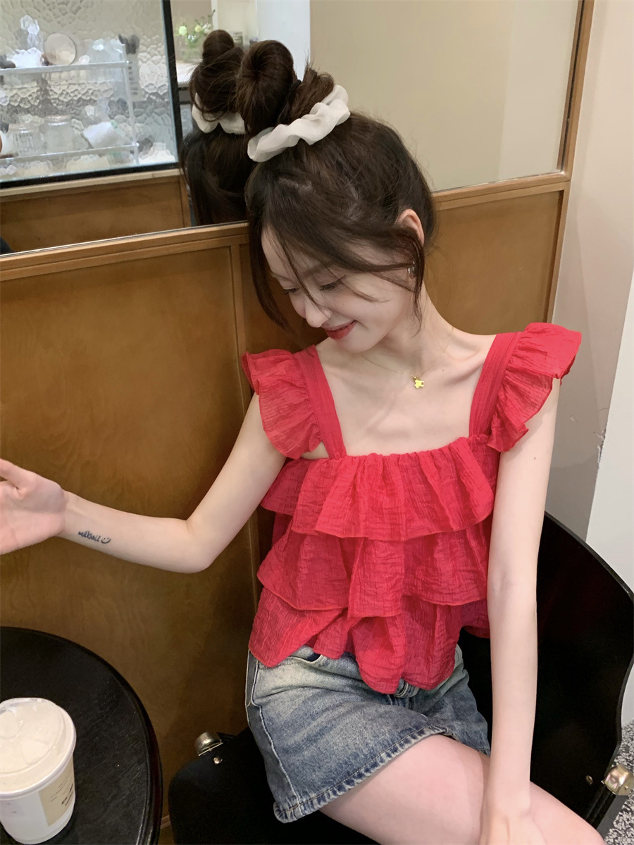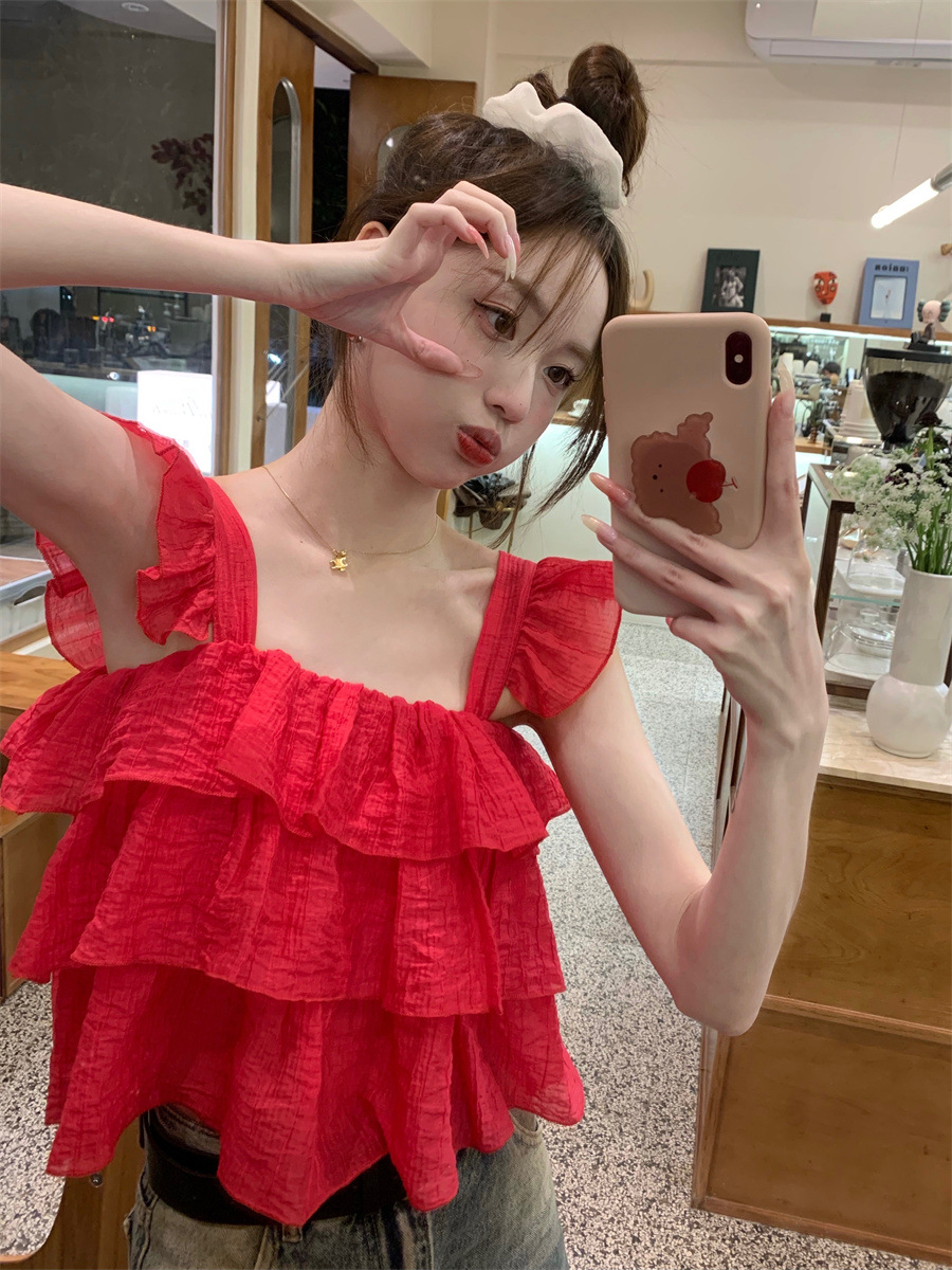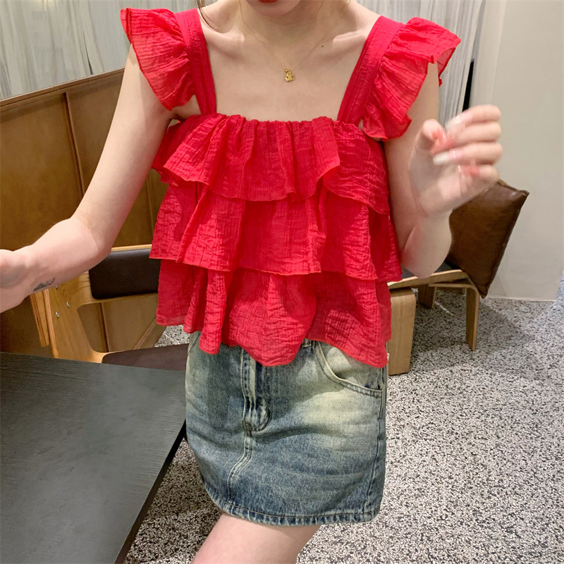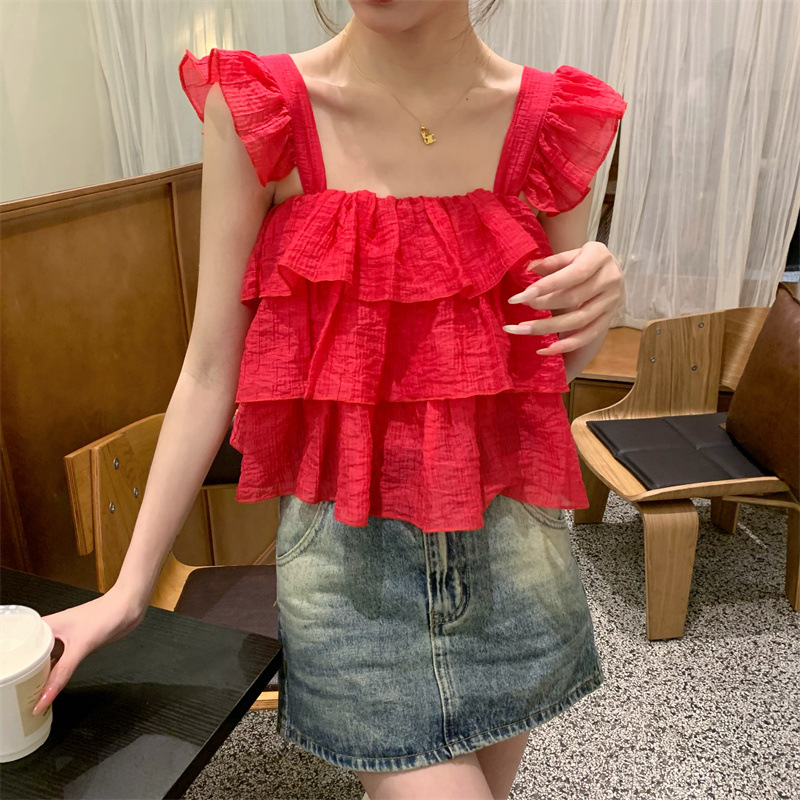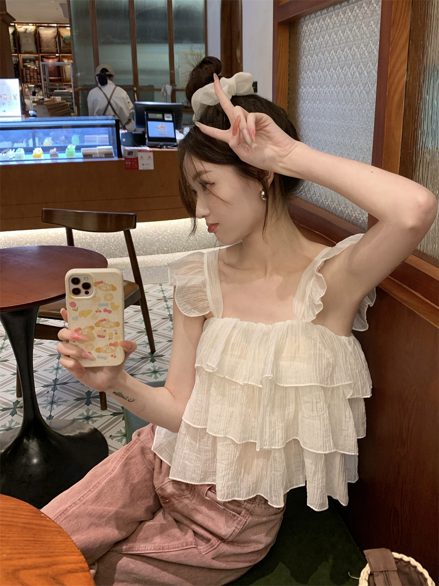 프랑스 스타일 달콤한 러플 캐미솔 여성의 여름 겉옷 달콤한 향신료 소녀 디자인 감각 작은 플라이 슬리브 민소매 짧은 탑