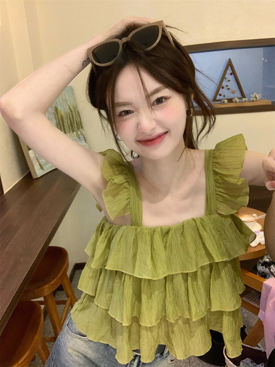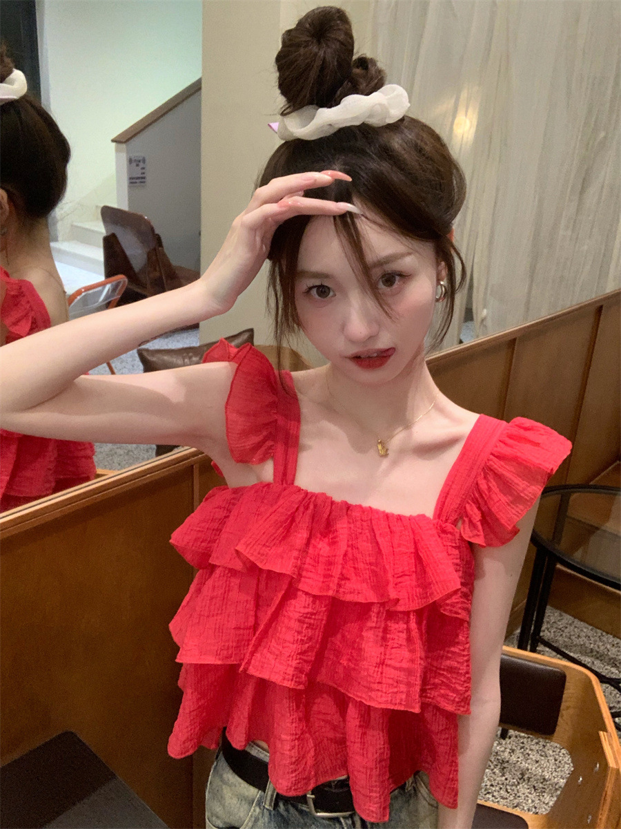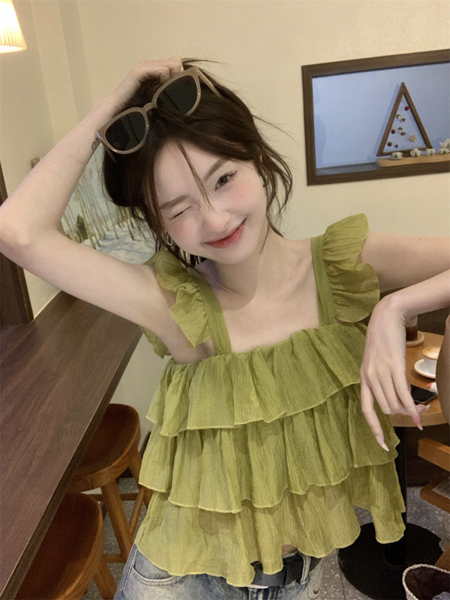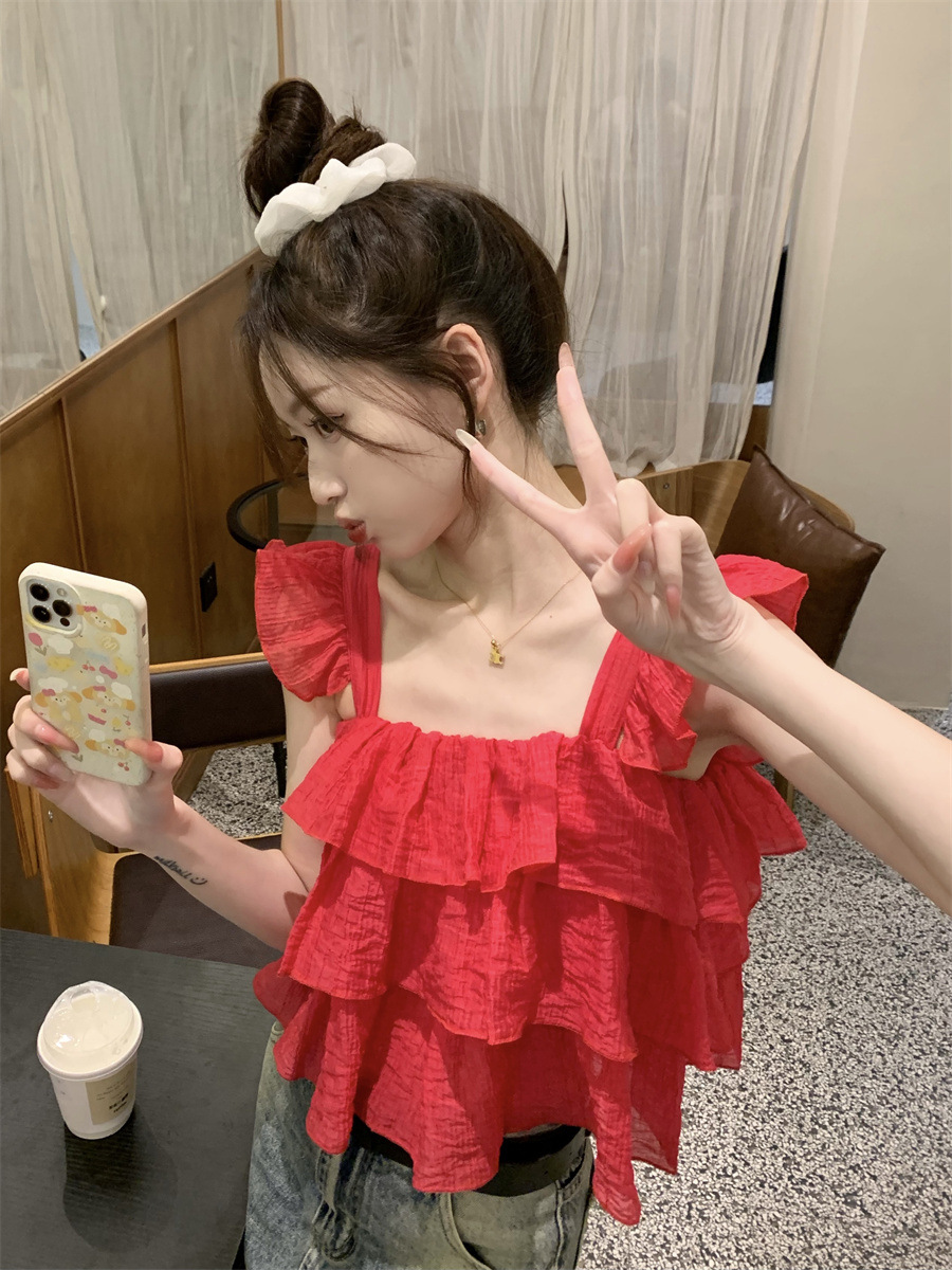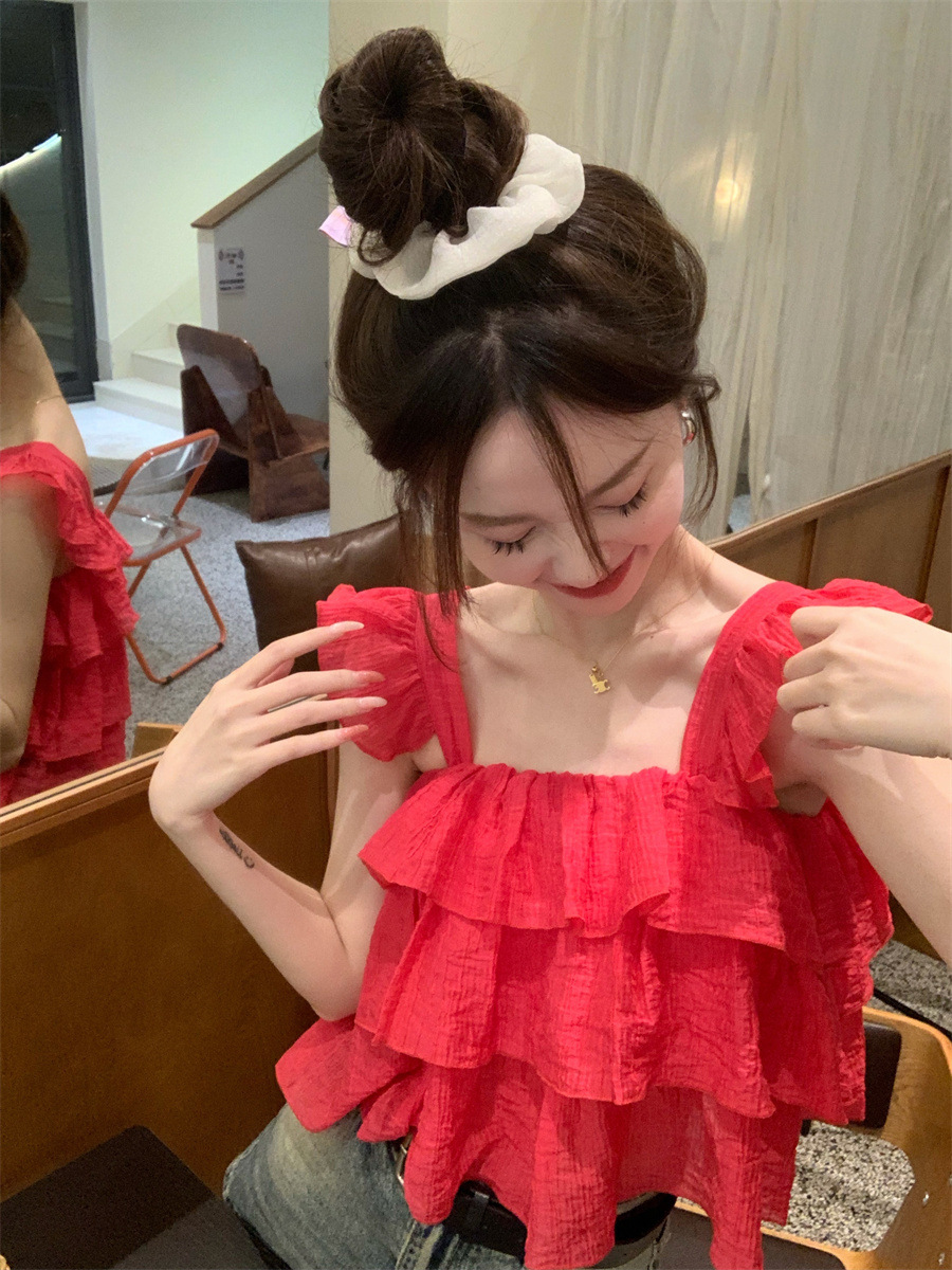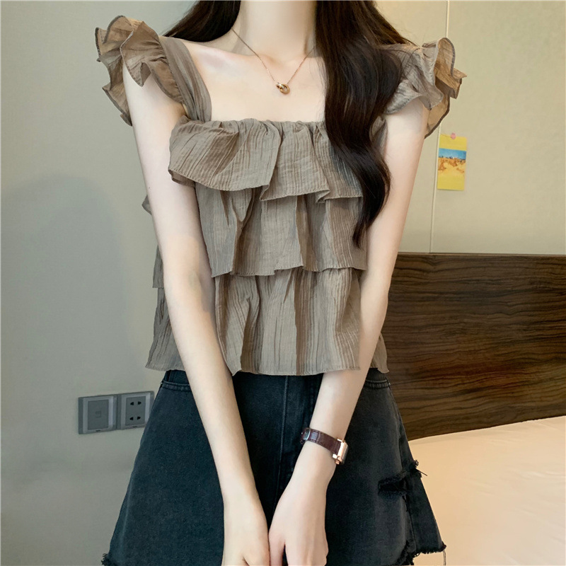 프랑스 스타일 달콤한 러플 캐미솔 여성의 여름 겉옷 달콤한 향신료 소녀 디자인 감각 작은 플라이 슬리브 민소매 짧은 탑