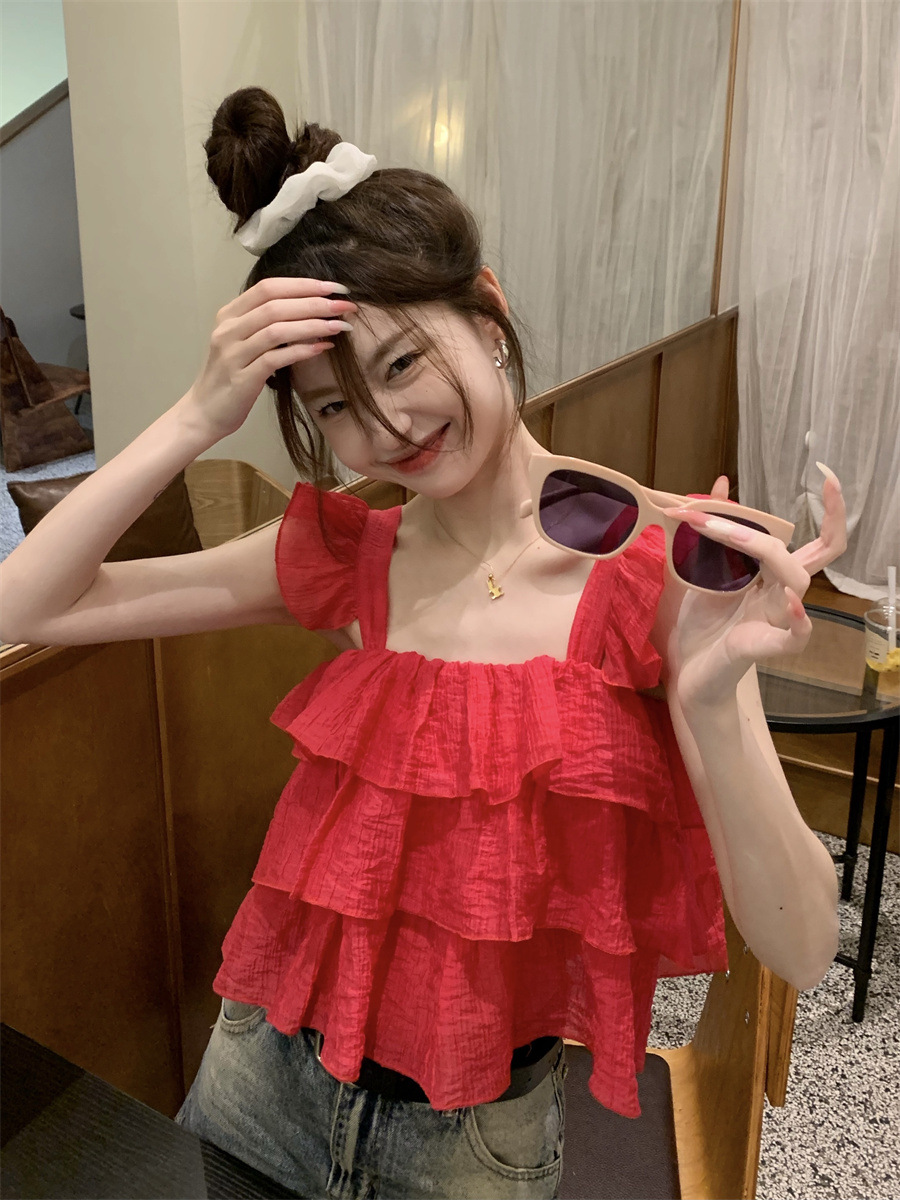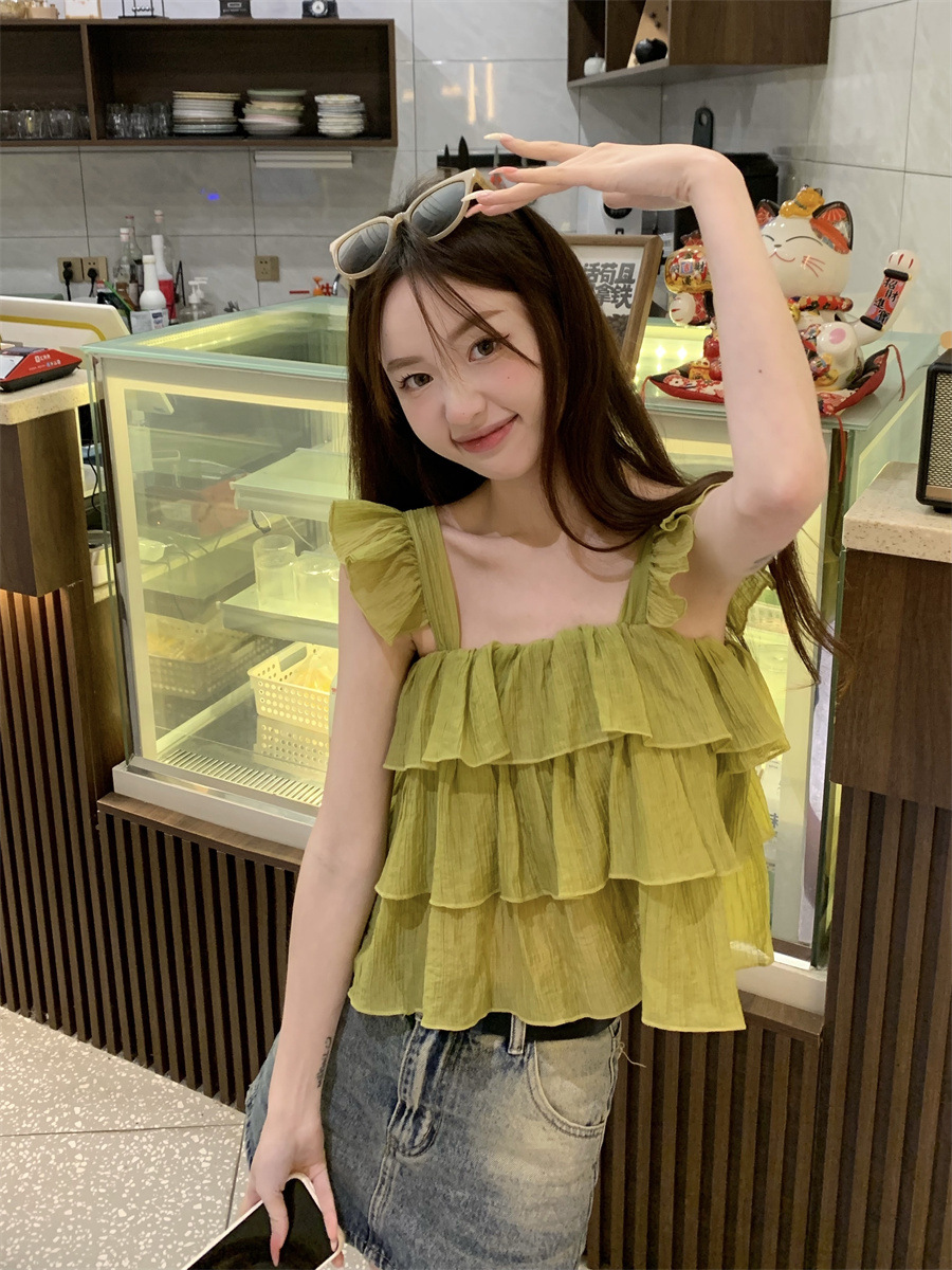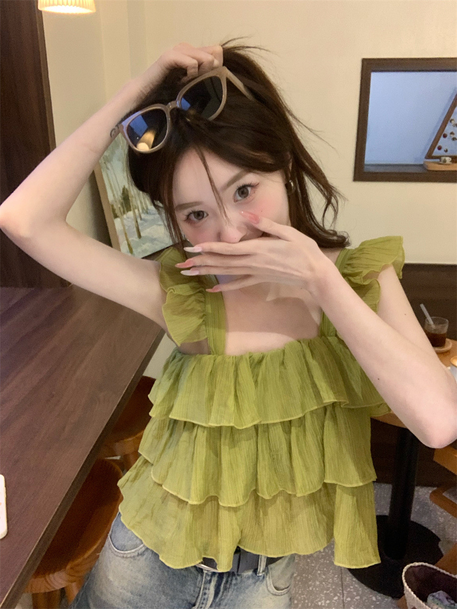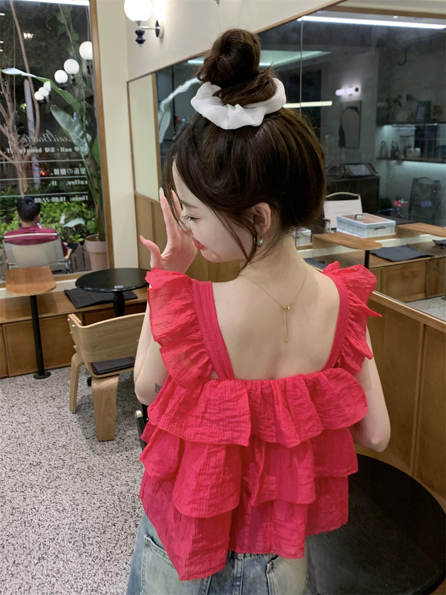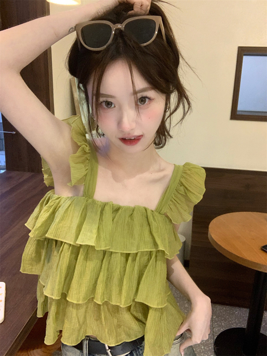 프랑스 스타일 달콤한 러플 캐미솔 여성의 여름 겉옷 달콤한 향신료 소녀 디자인 감각 작은 플라이 슬리브 민소매 짧은 탑
