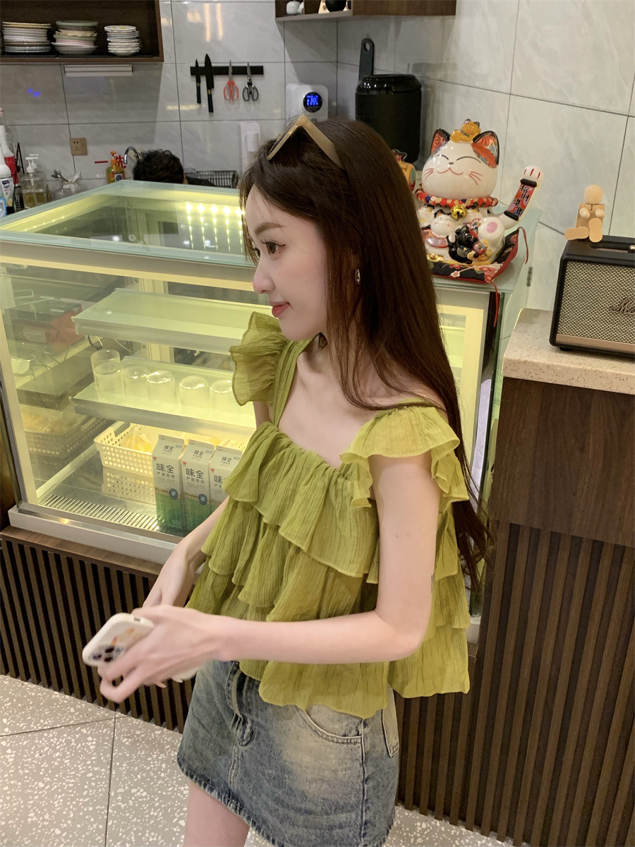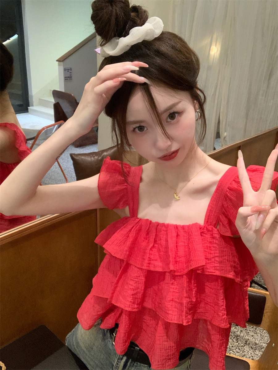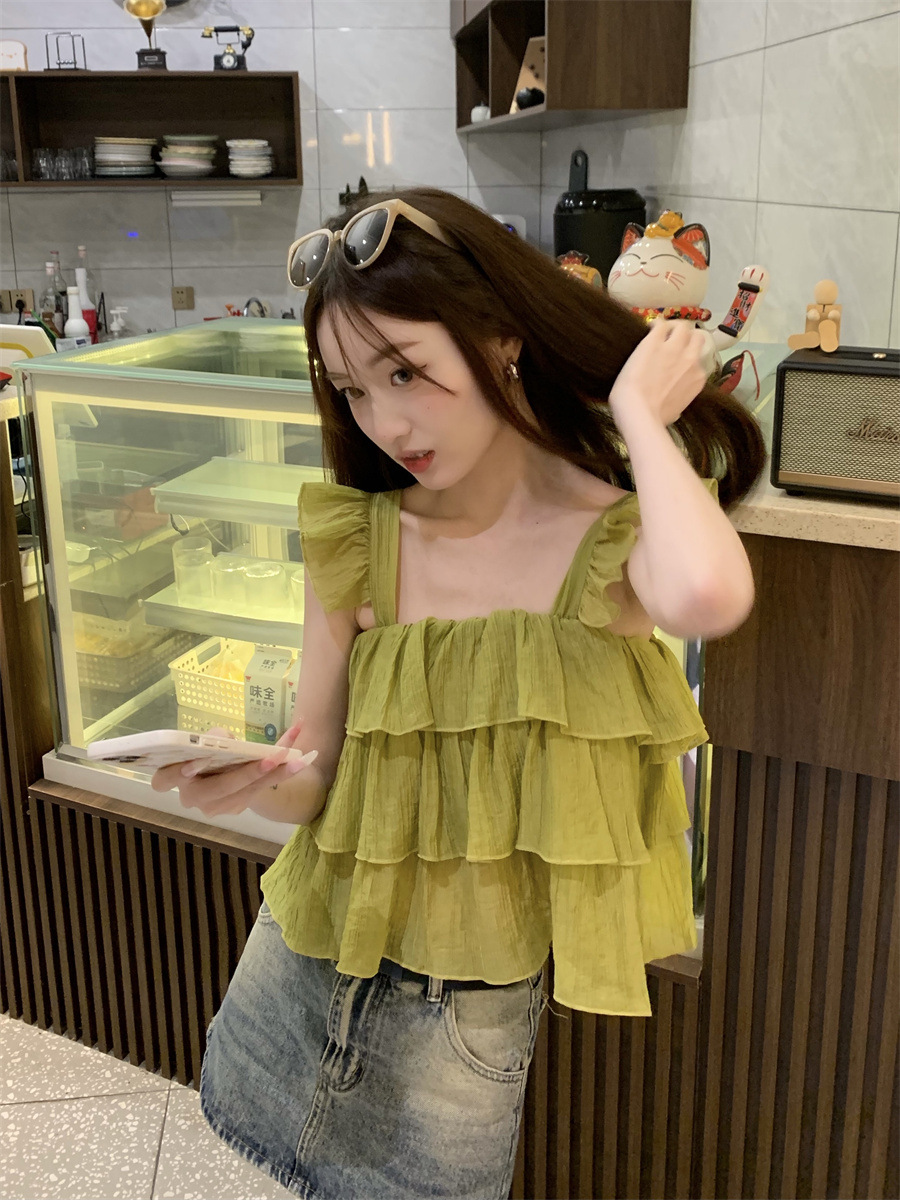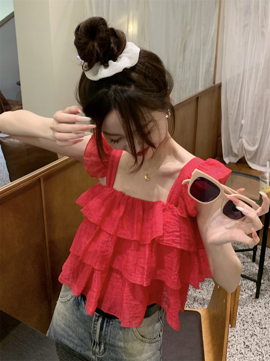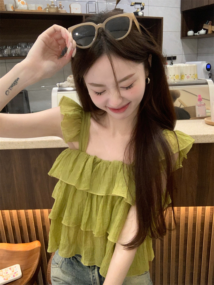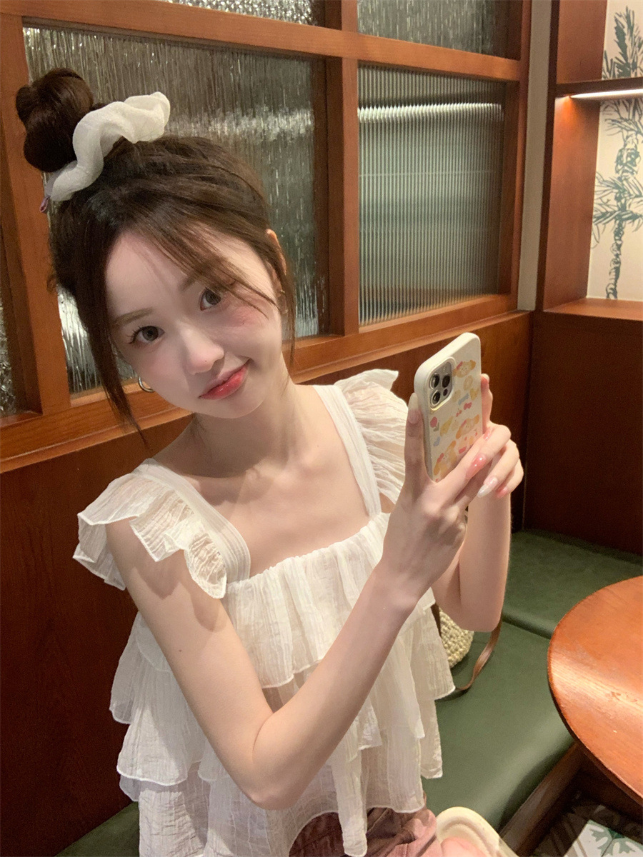 프랑스 스타일 달콤한 러플 캐미솔 여성의 여름 겉옷 달콤한 향신료 소녀 디자인 감각 작은 플라이 슬리브 민소매 짧은 탑
