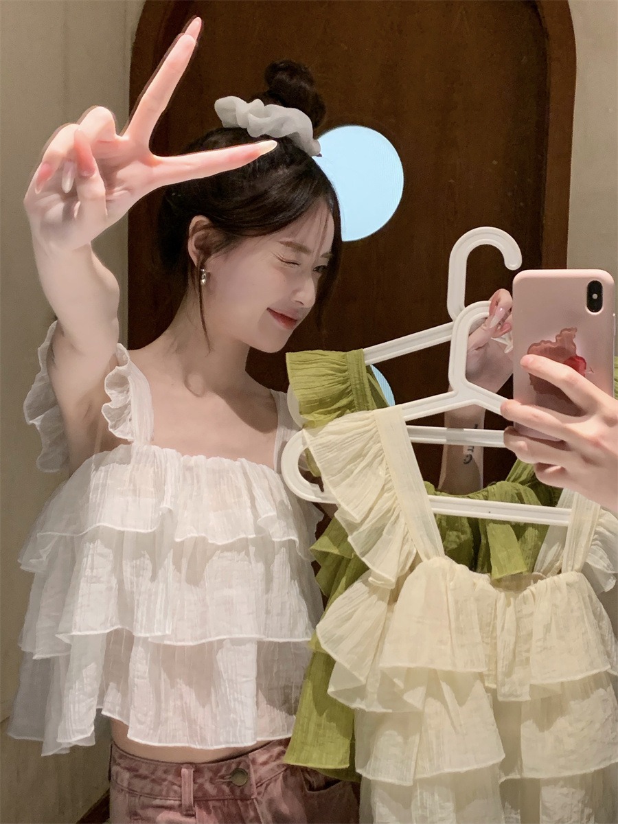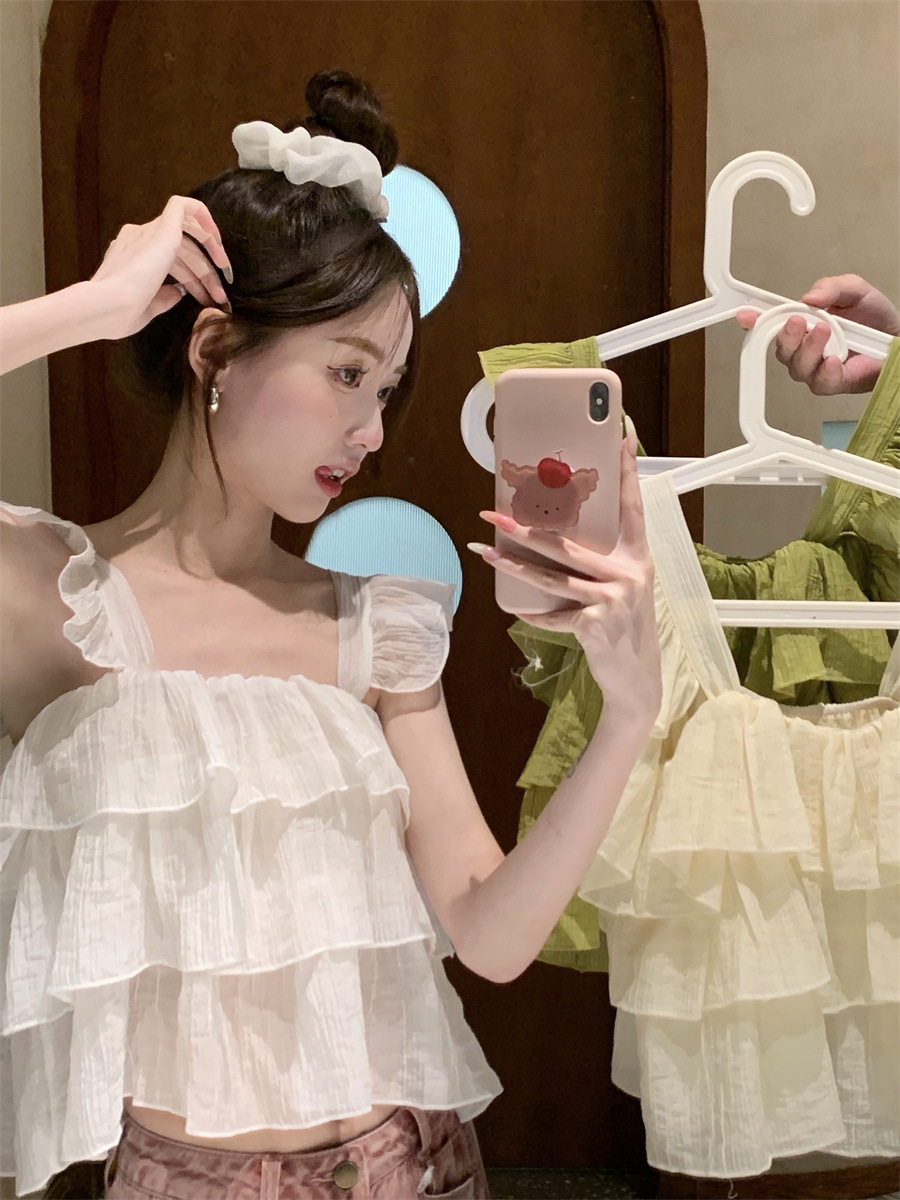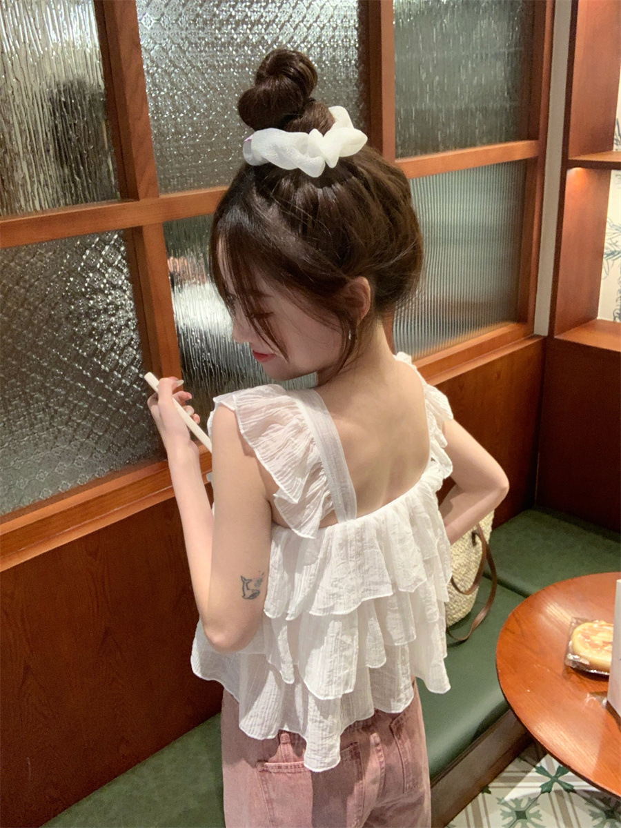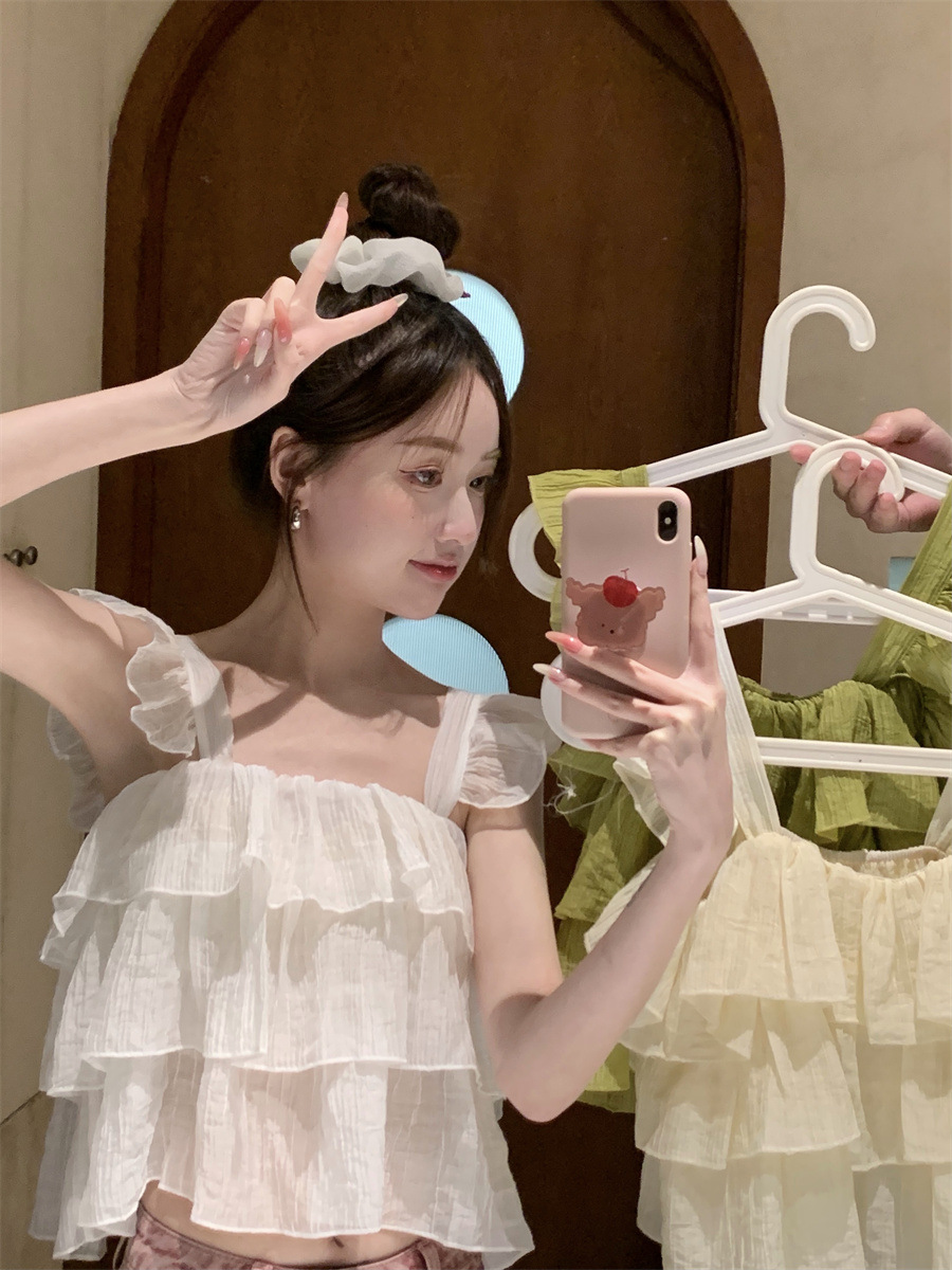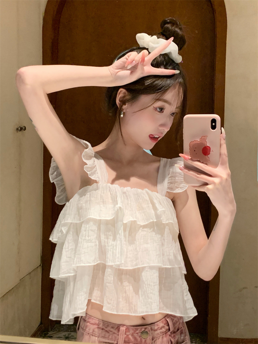 프랑스 스타일 달콤한 러플 캐미솔 여성의 여름 겉옷 달콤한 향신료 소녀 디자인 감각 작은 플라이 슬리브 민소매 짧은 탑스토어 가기