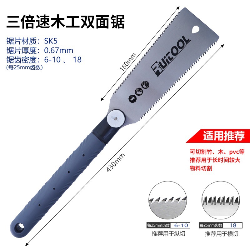 3.锯片可更换,替换安装操作快速简便。双面锯齿设计,适用不同工作场景,三倍速锯齿高频淬火,锯切顺畅省力。