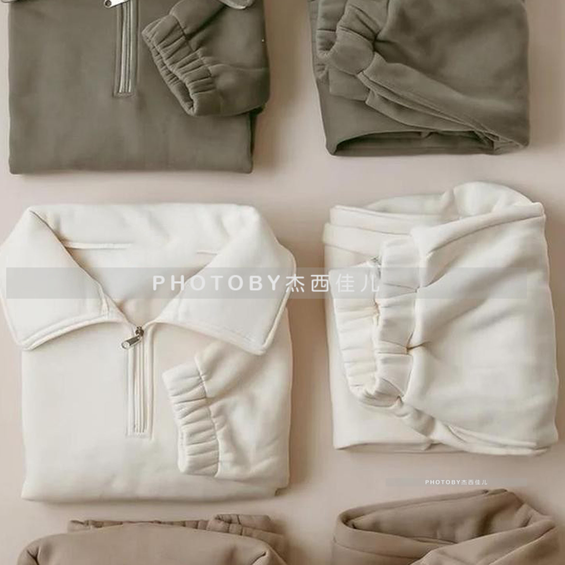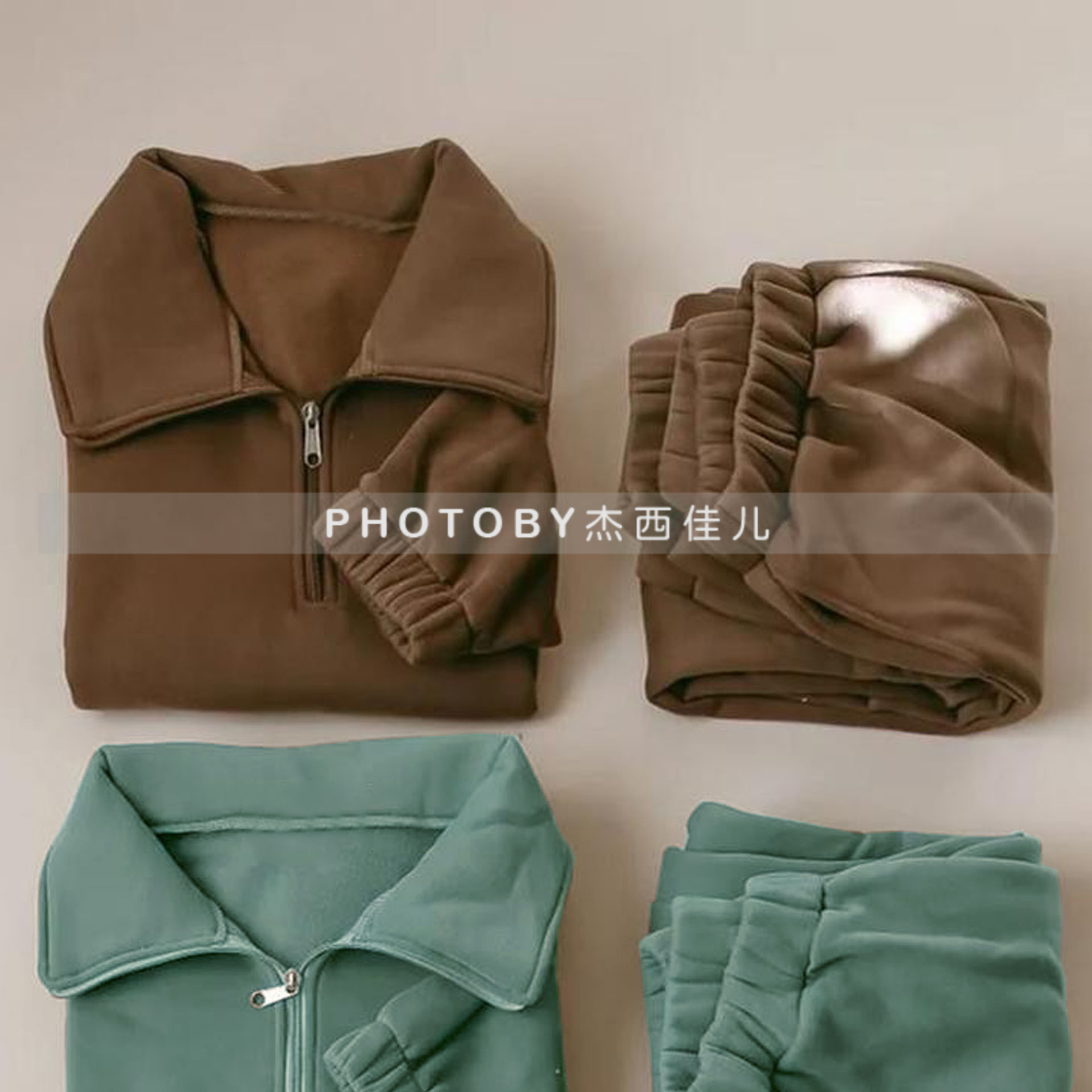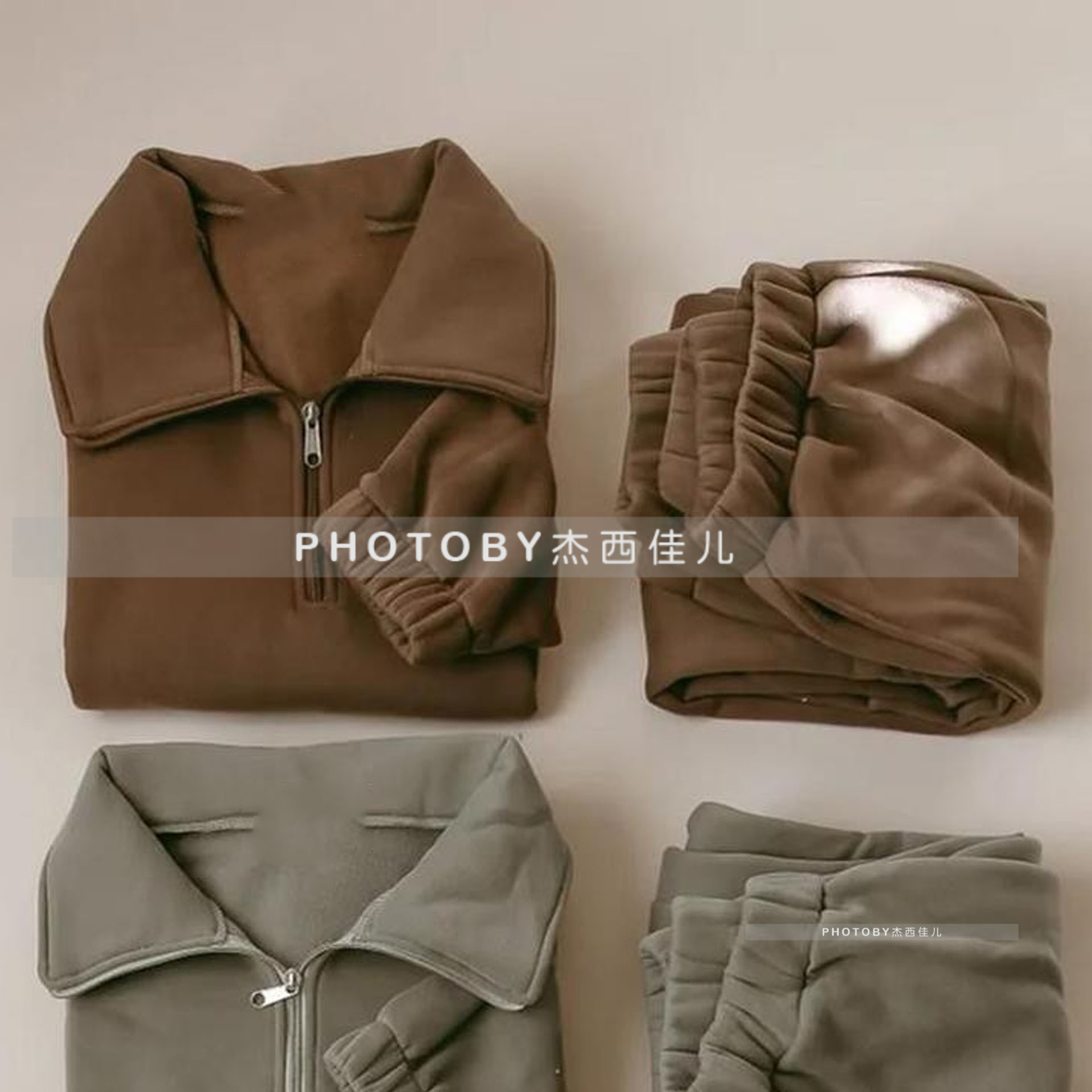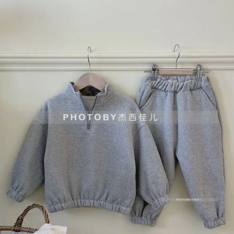 한국 스타일 소년 소녀 겨울 신상품 세트 유행 하이 넥 하프 지퍼 탑 앵클 바지 양털 캐주얼 세트스토어 가기
