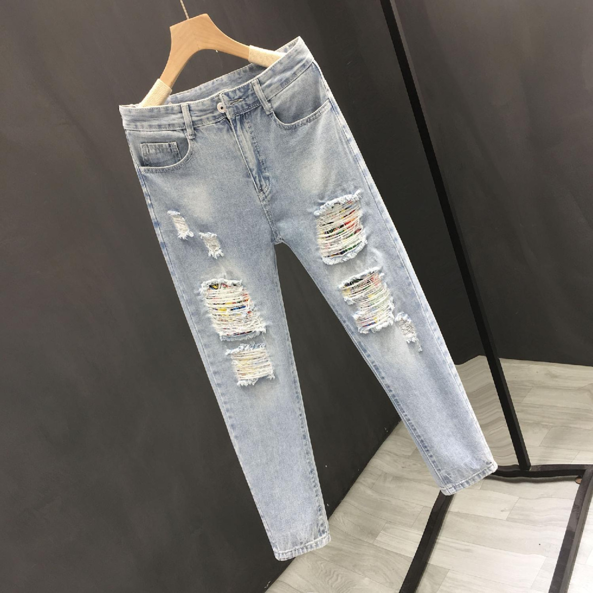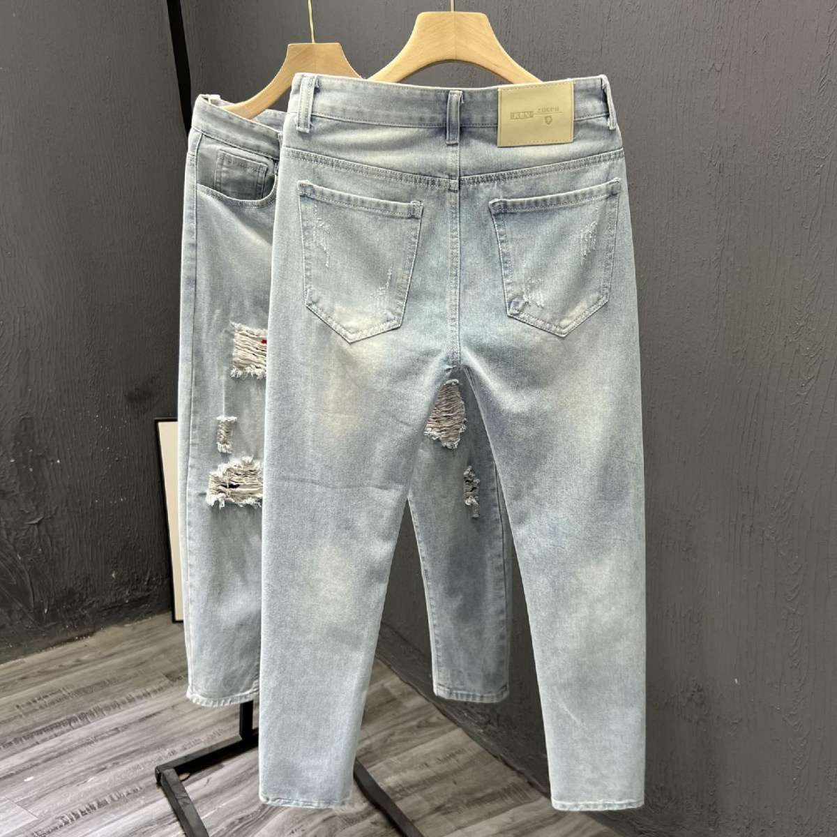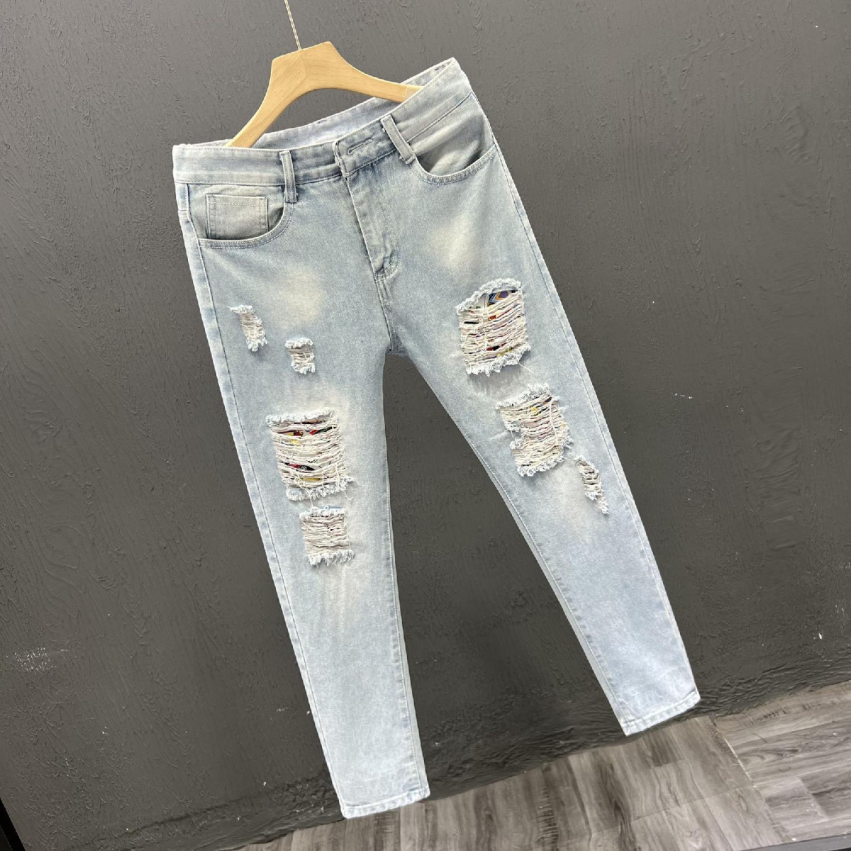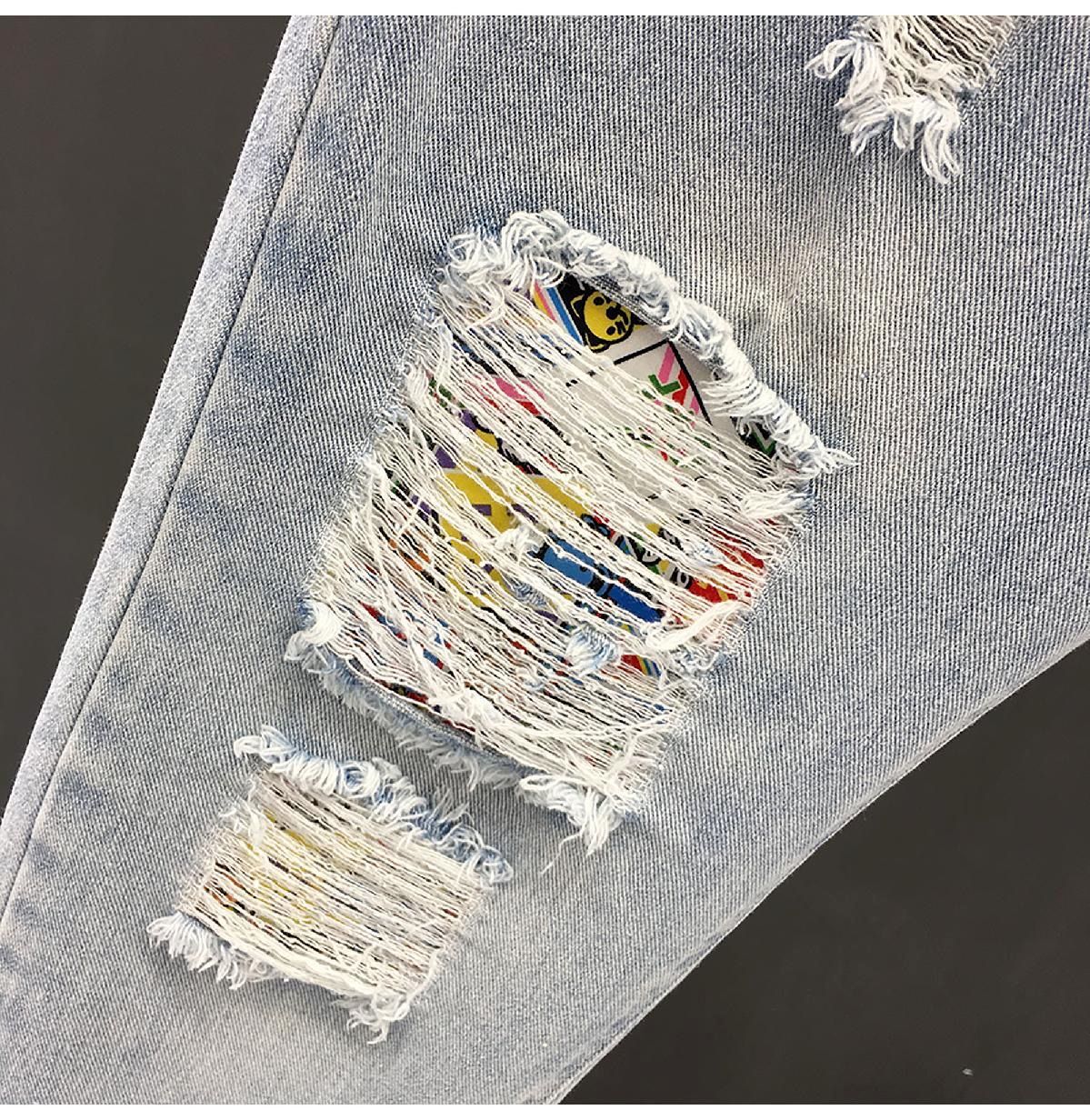 찢어진 청바지 남자의 2023 여름 새로운 유행 브랜드 얇은 슬림 핏 스키니 발 유행 컬 발목 캐주얼 바지스토어 가기