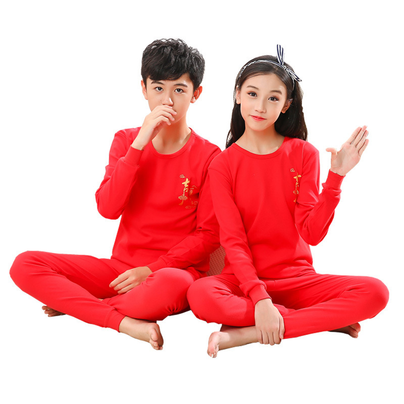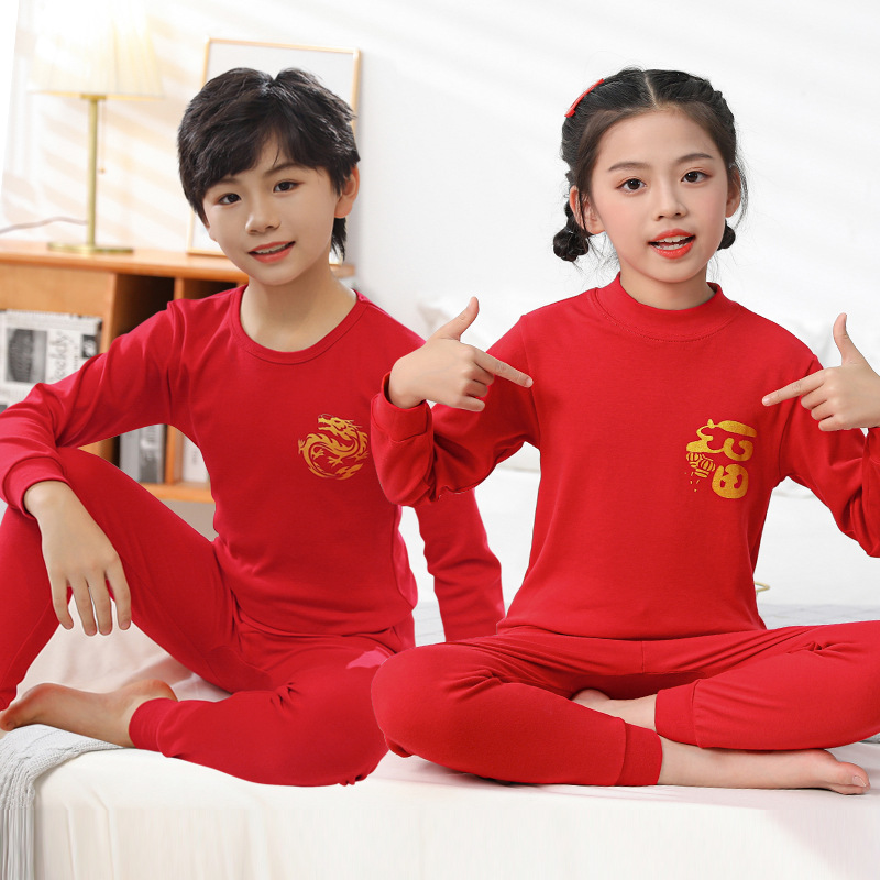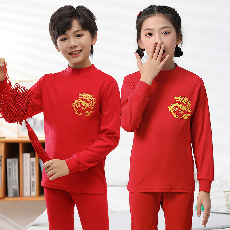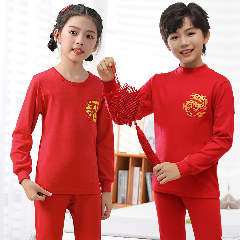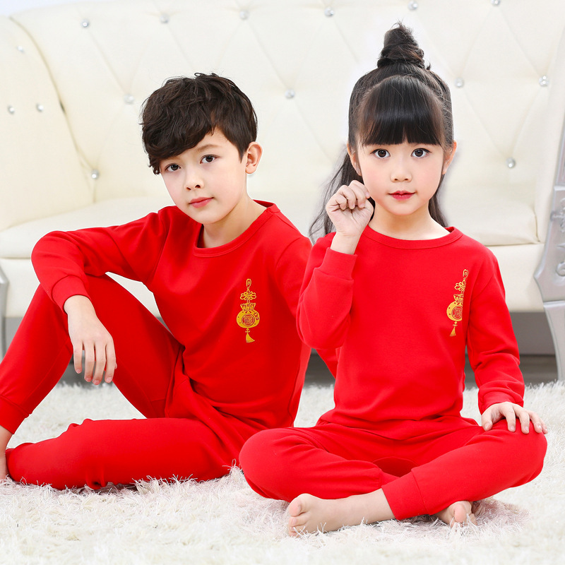 빨간 Benmingnian 어린이 가을 옷과 바지 속옷 세트 순면 중형 및 대형 어린이 소년 빨간 소녀 새해 빨강
