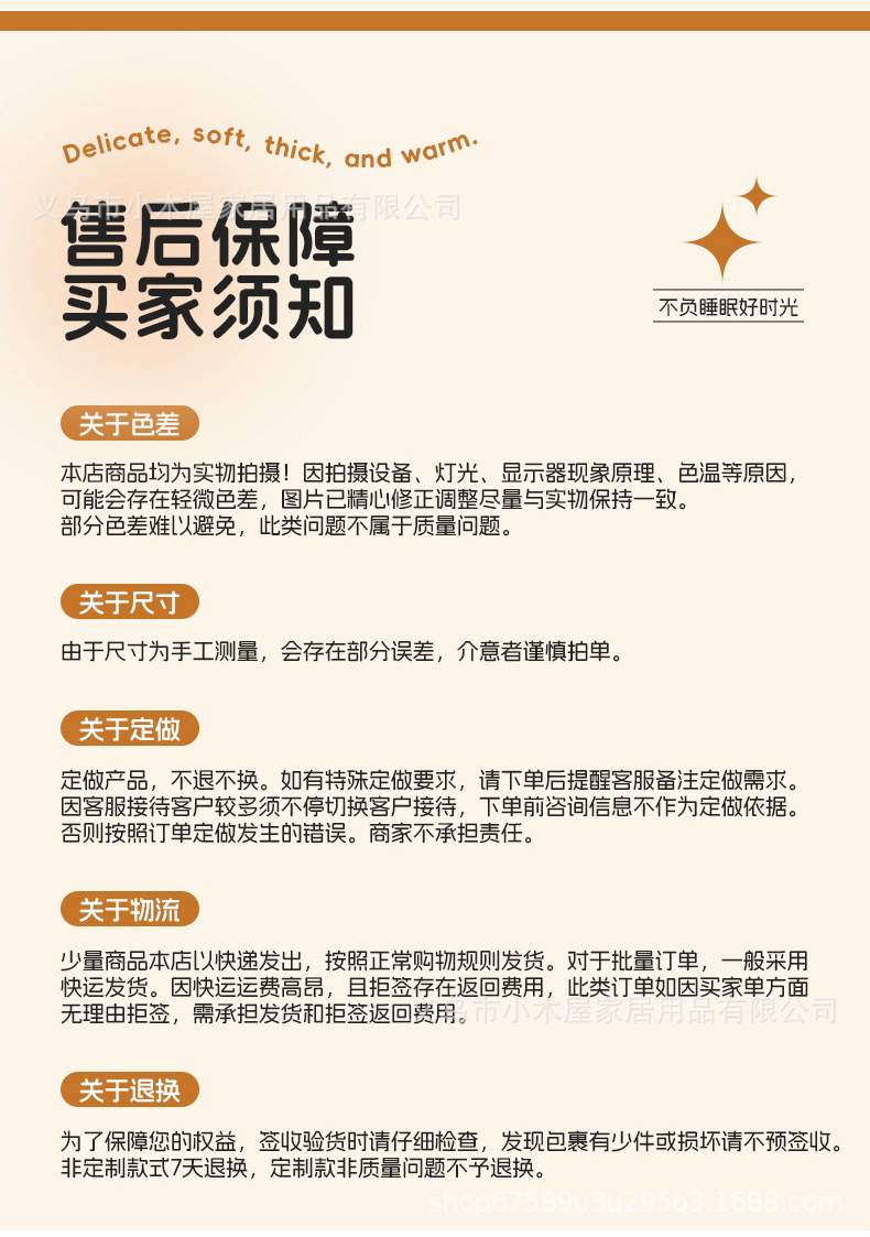 关于发货:订单数量少的一般是当天发货的,大货会按照谈好的时间发出的,数量少发快递、大货发快运物流可以送货上门,也可以发大型物流到付自提的 ,大货也可以把毛毯放入大的塑料薄膜袋内,然后用大型真空机抽真空,外用编织袋装起来发货的,这样是比较节省体积的方法。