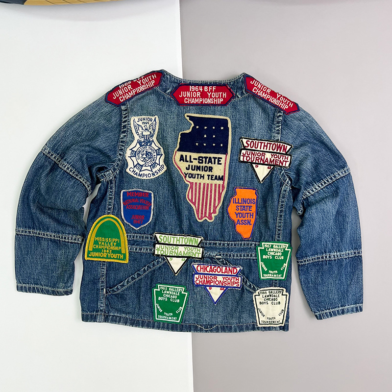 [재고] 23 가을과 겨울 타이드 브랜드 높은 설정 아동복 DD 불규칙 메달 소년 소녀 데님 코트스토어 가기