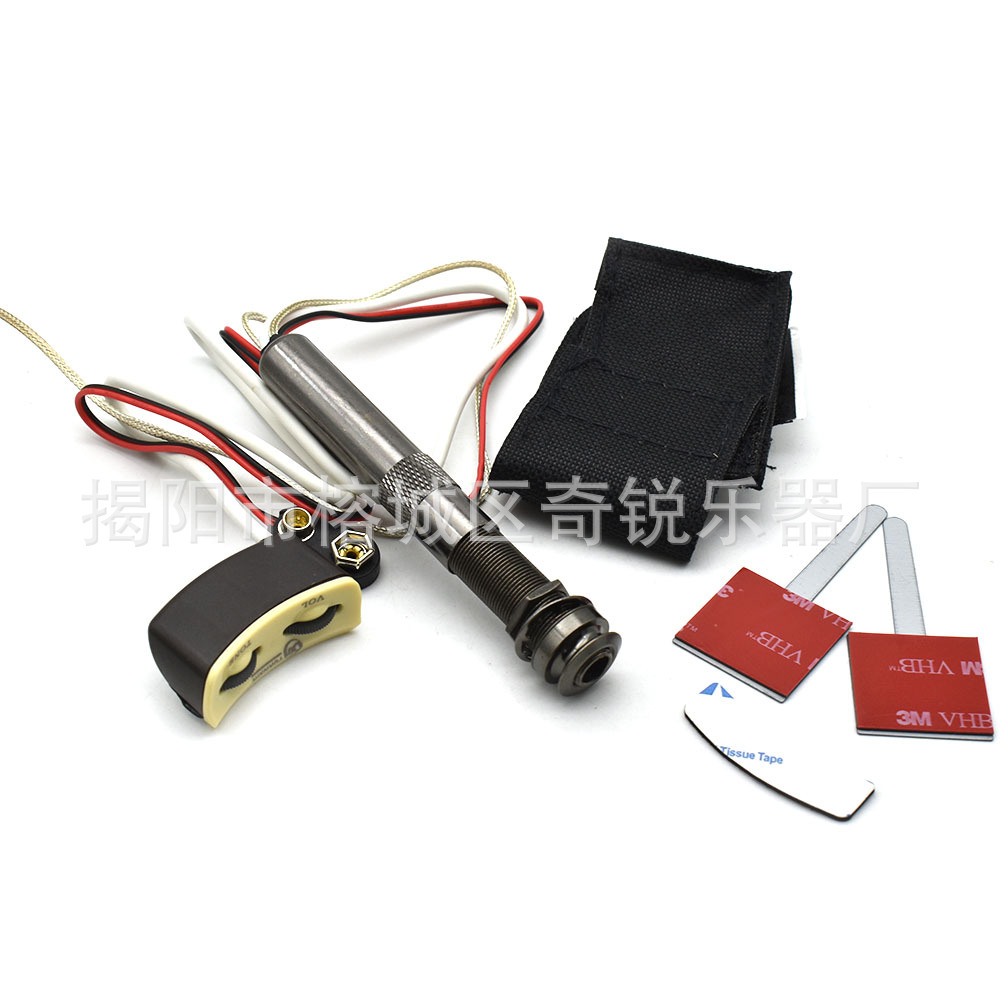 拾音器安装或者测试的时候,要是没有声音,拾音棒的那头或者吉他线的插头稍等拨出来一点点,就可以哦,拾音器没有开关,要是怕耗电,拔掉电池就可以哦!要是介意者慎拍。
