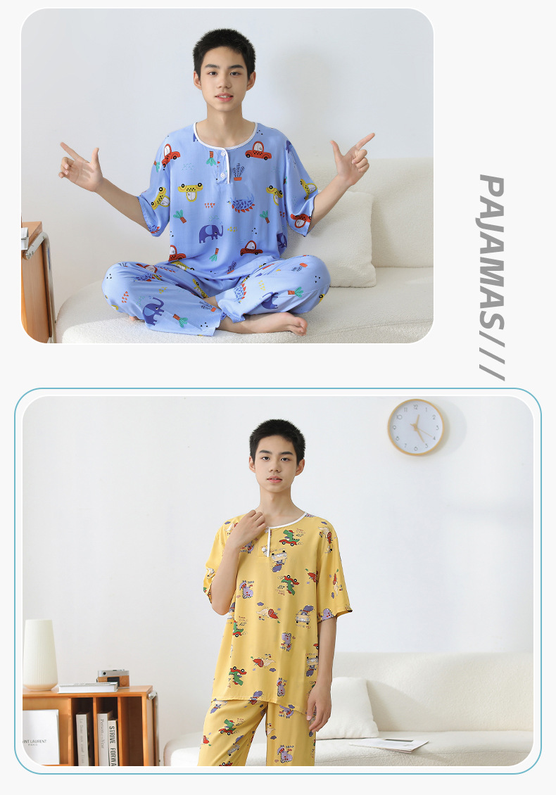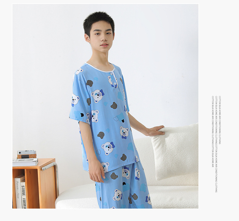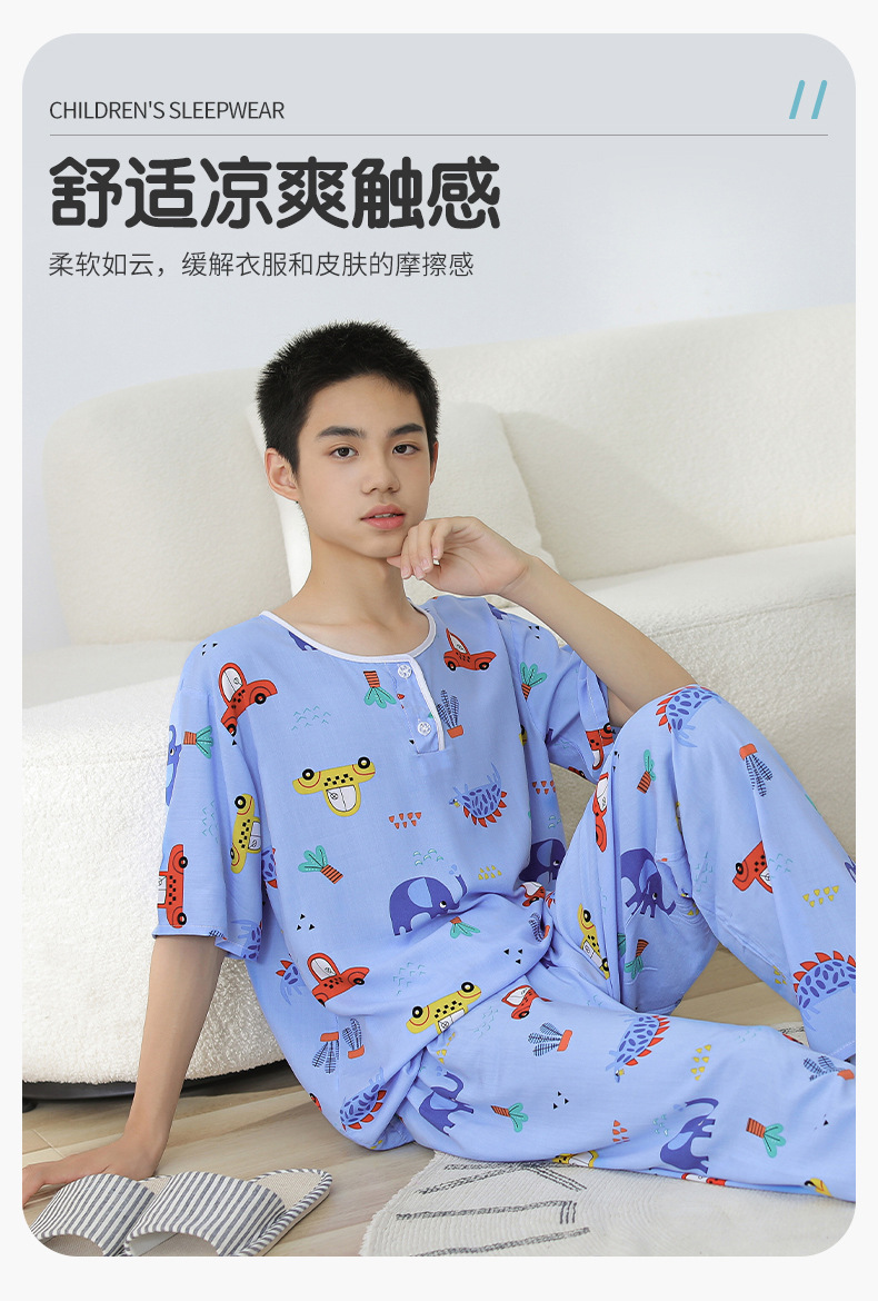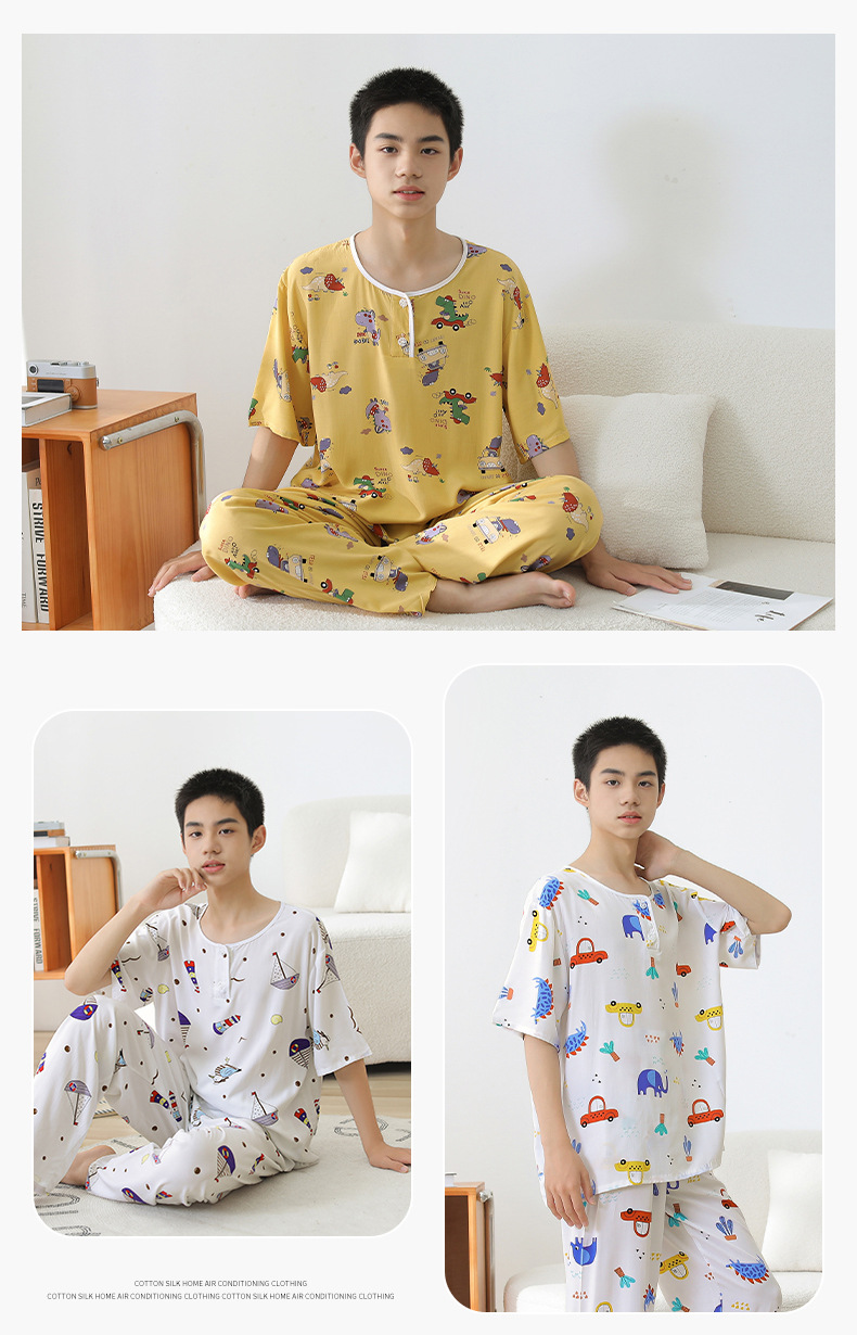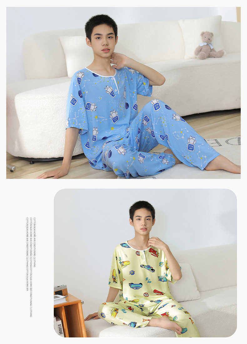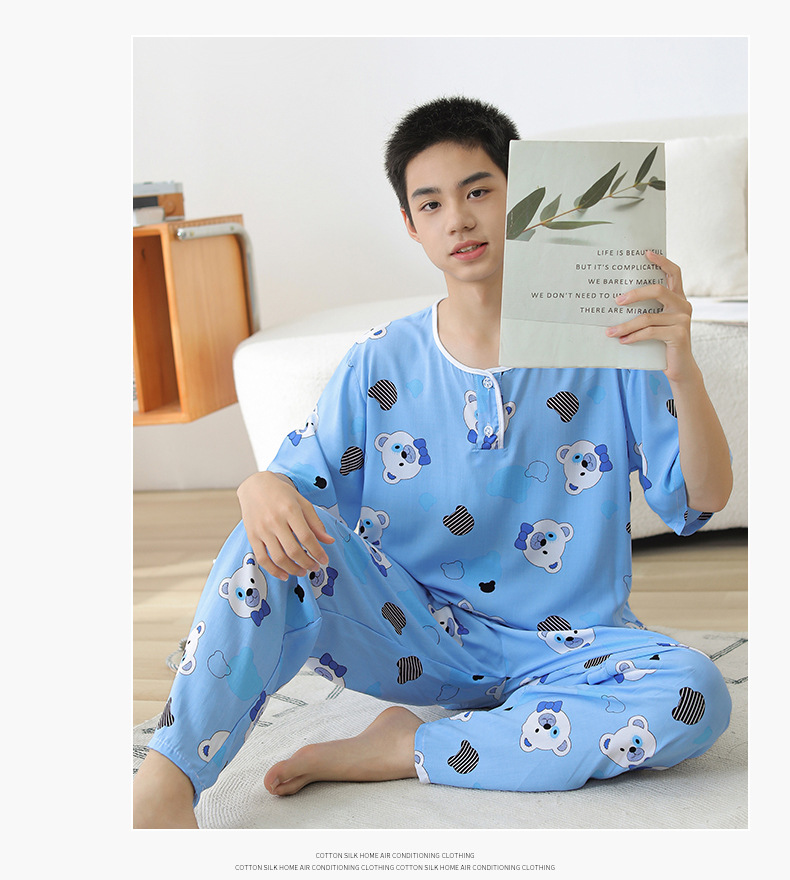 면 실크 잠옷 소년 여름 남자의 긴팔 면 실크 세트 중학생 청소년 남자의 가정복스토어 가기