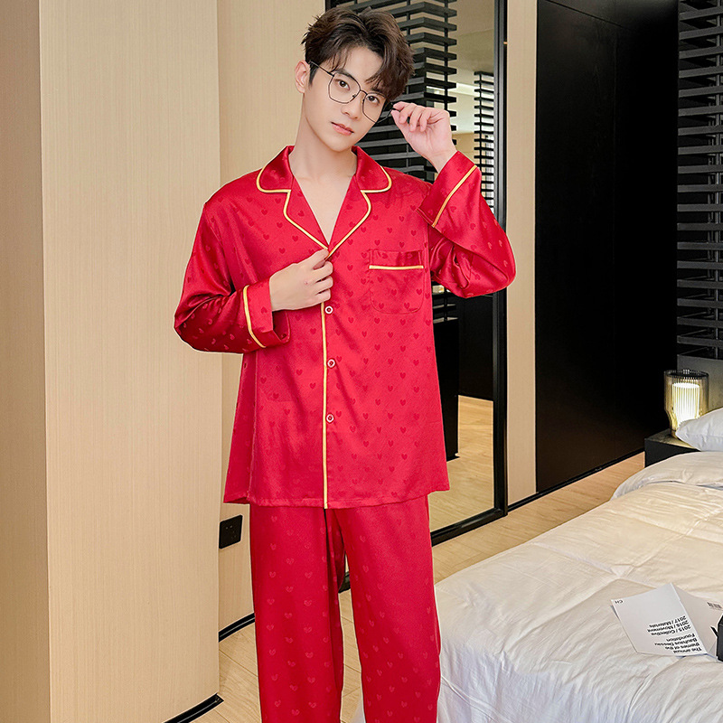 커플 잠옷 여자의 봄과 가을 얼음 실크 긴 소매 느슨한 플러스 사이즈 빨간 사랑 가정 옷 가을 레저 세트 남자의 1155