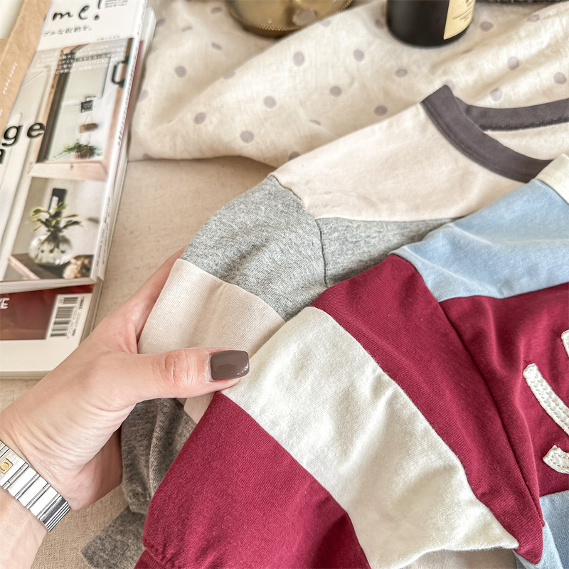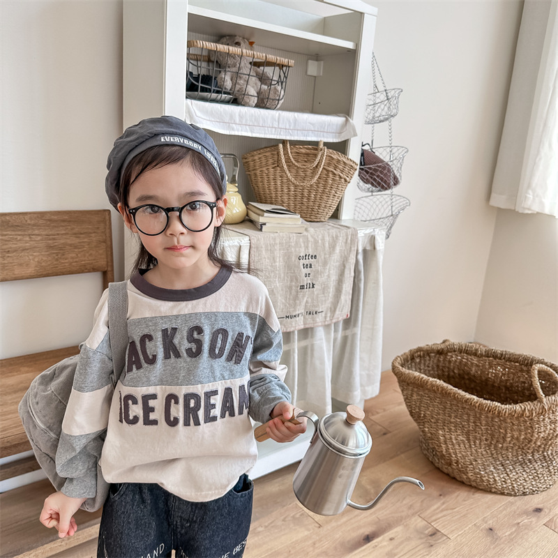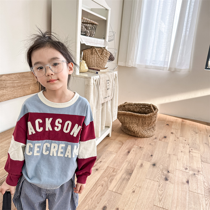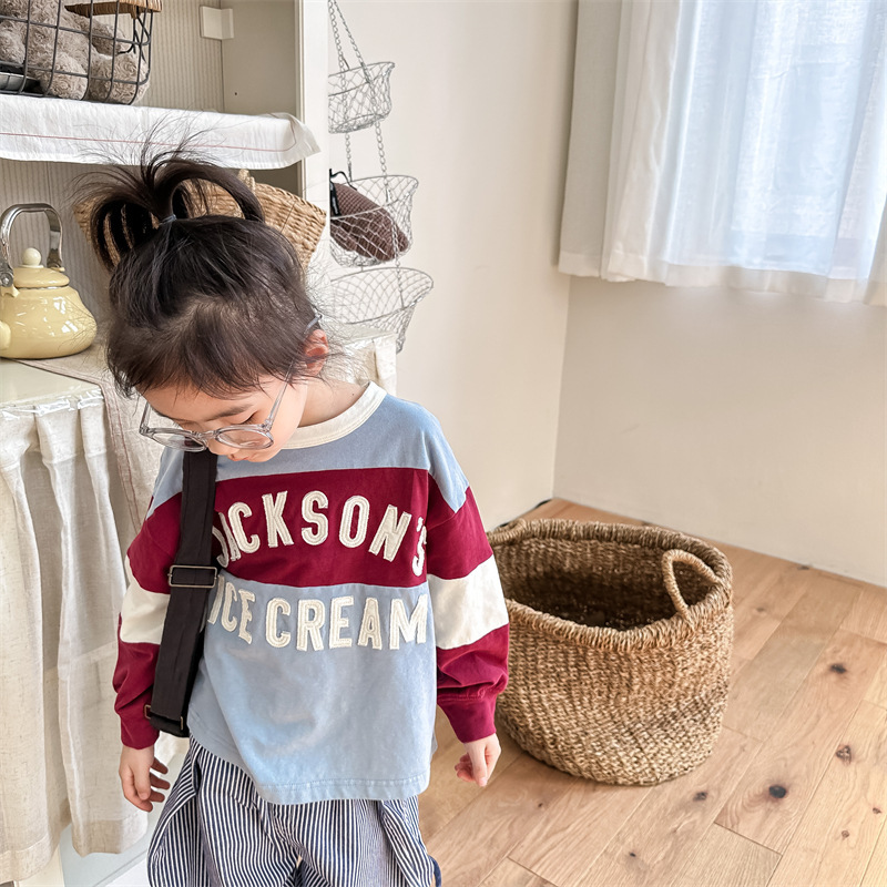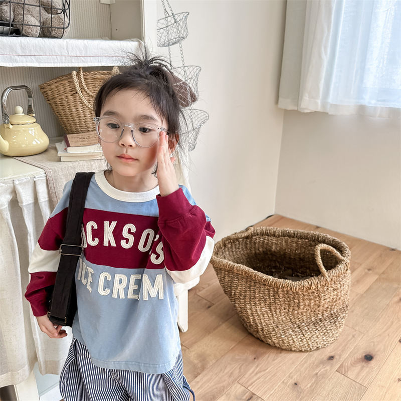 2024 년 가을 어린이 긴팔 티셔츠 소년 소녀 한국식 컬러 블록 그림 편지 자수 캐주얼 베이스 셔츠 탑