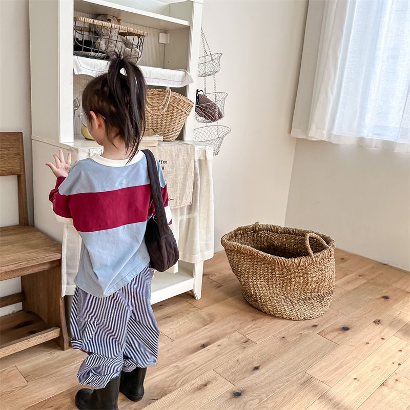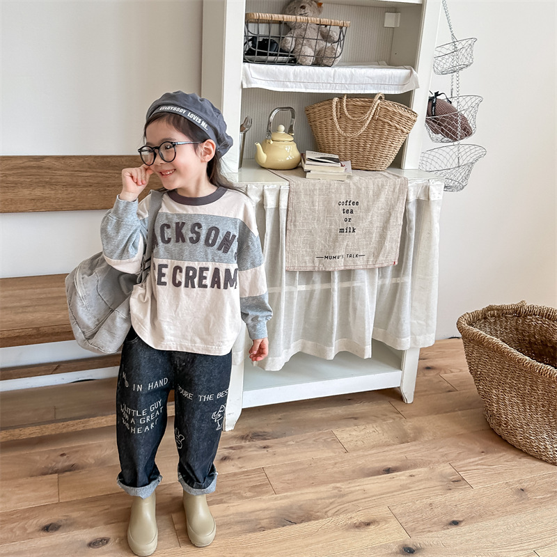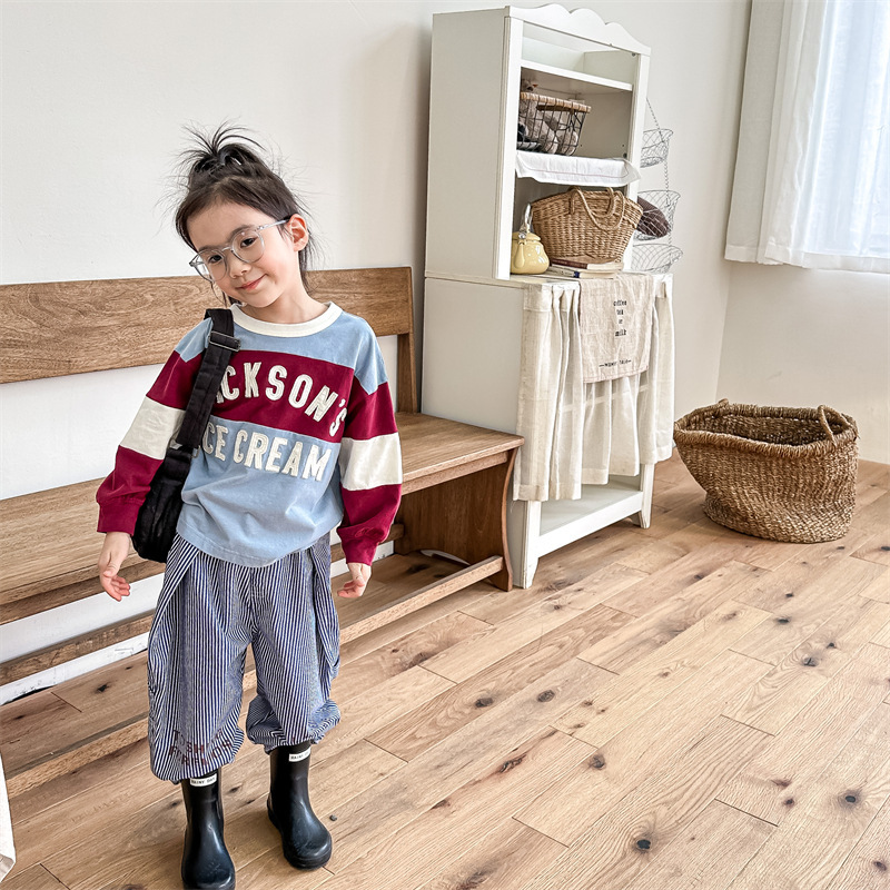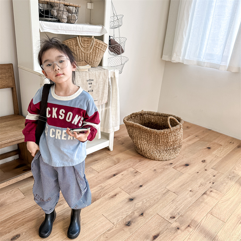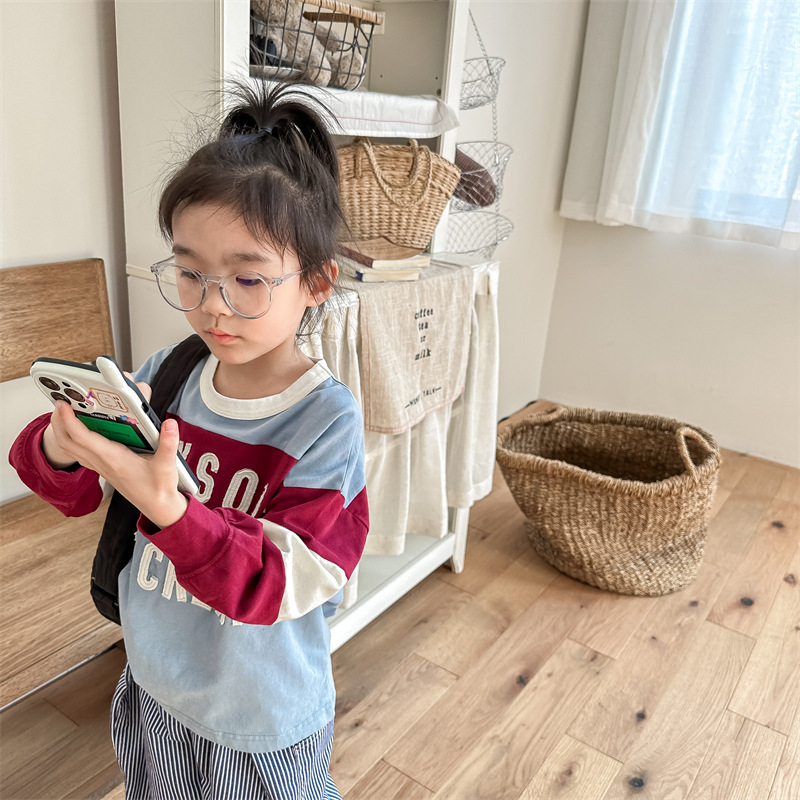 2024 년 가을 어린이 긴팔 티셔츠 소년 소녀 한국식 컬러 블록 그림 편지 자수 캐주얼 베이스 셔츠 탑스토어 가기