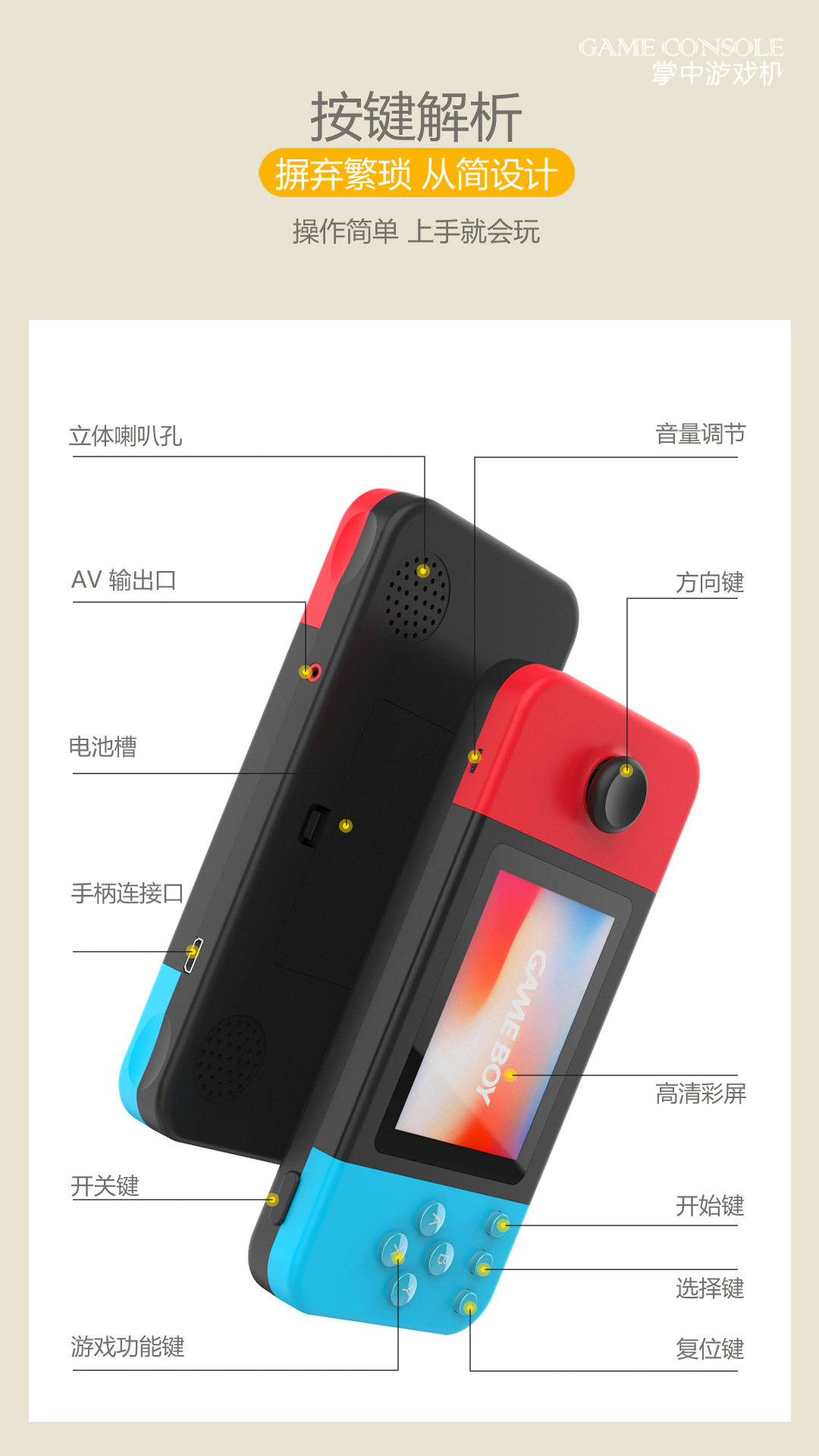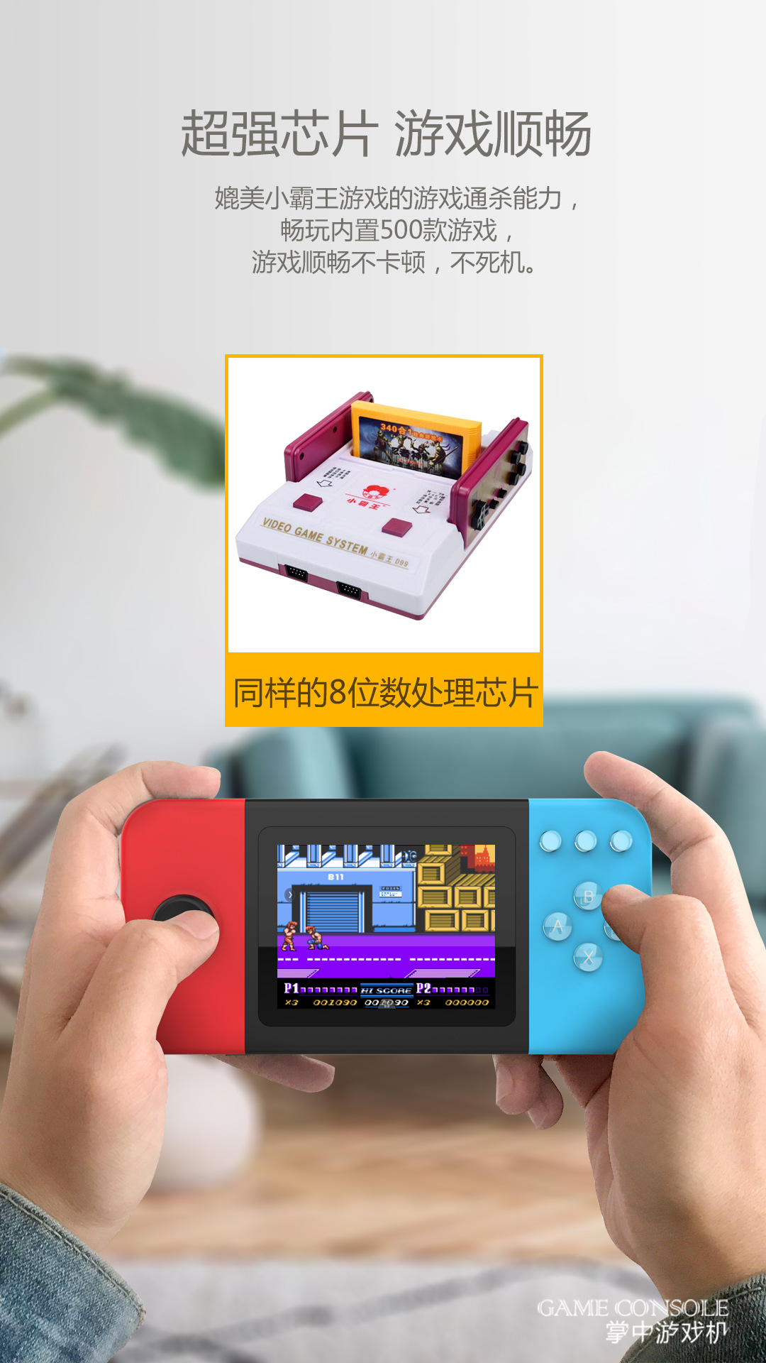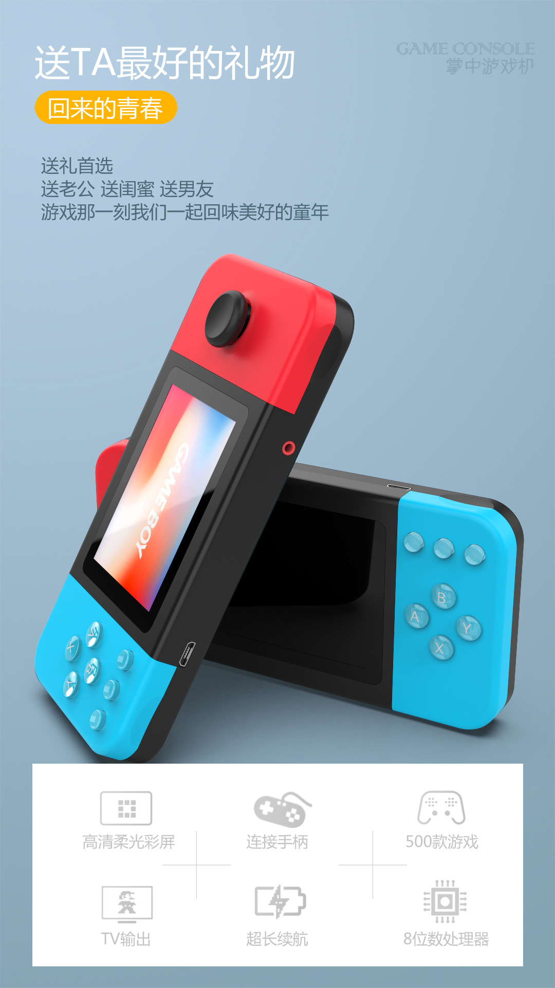 D-20 핸드 헬드 게임기 향수 복고풍 고화질 더블 조이스틱 미니 8 비트 머신 500