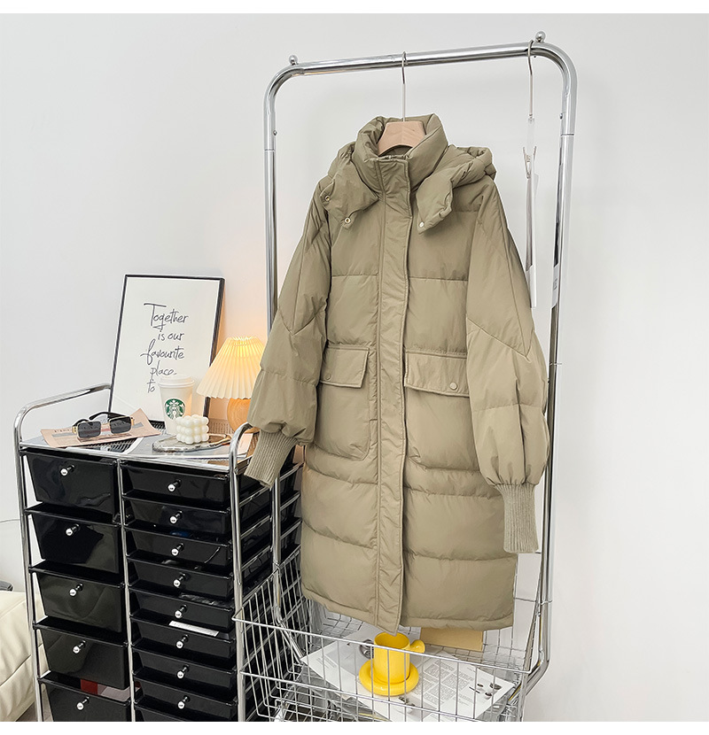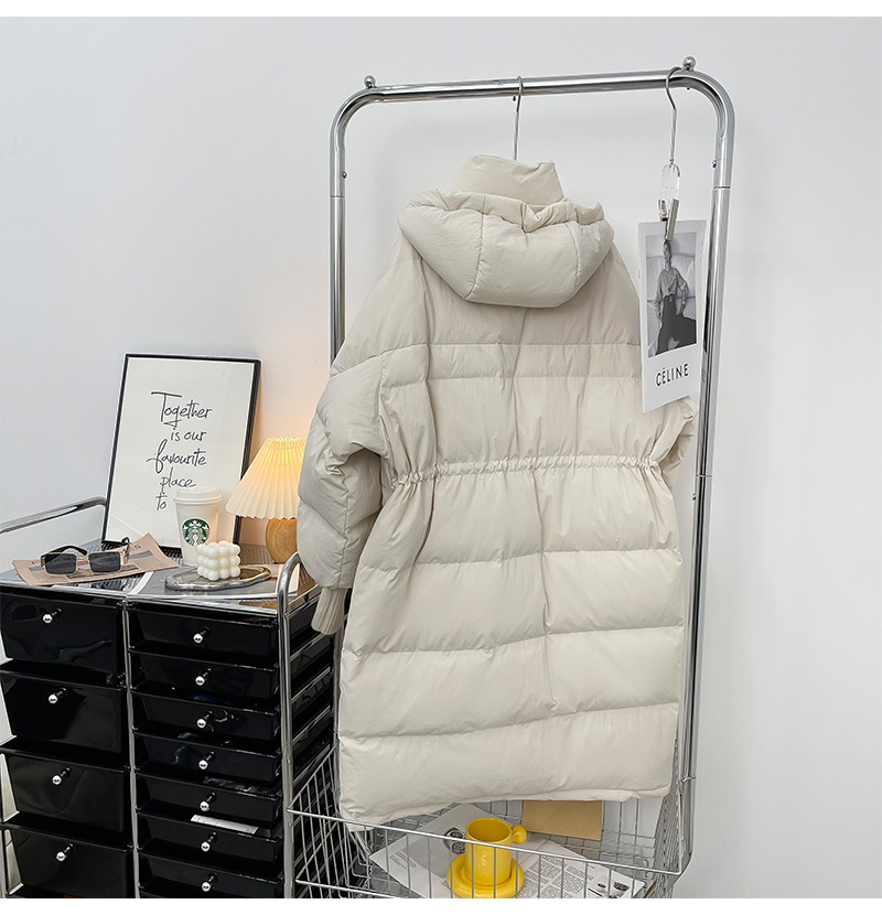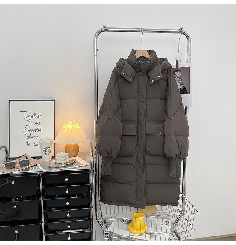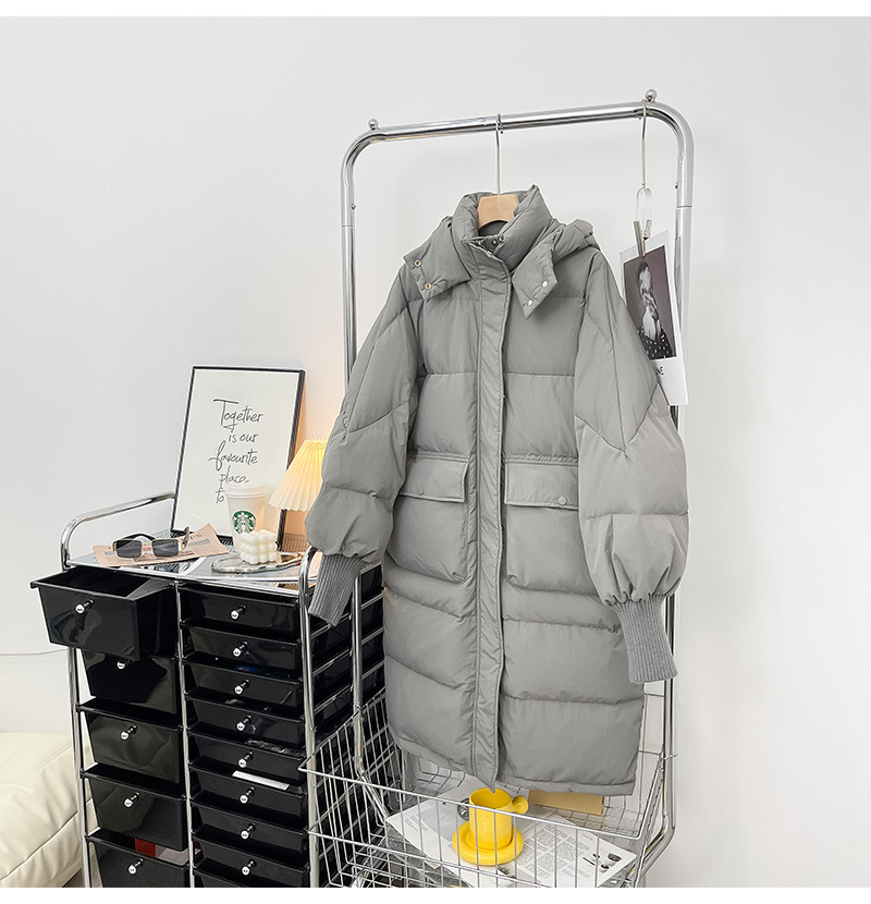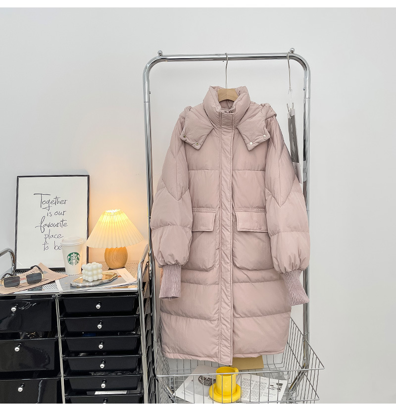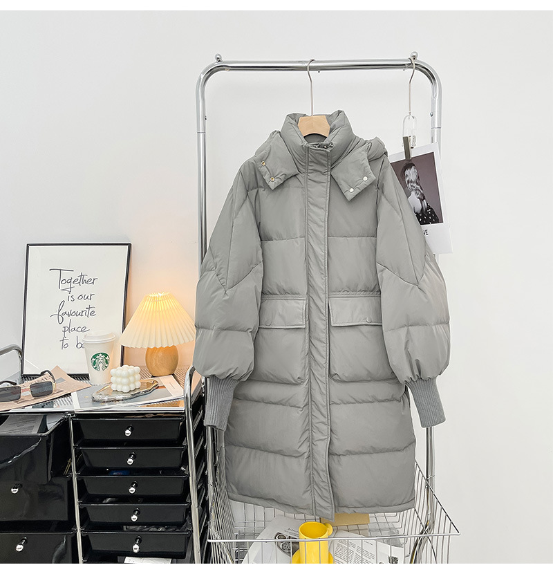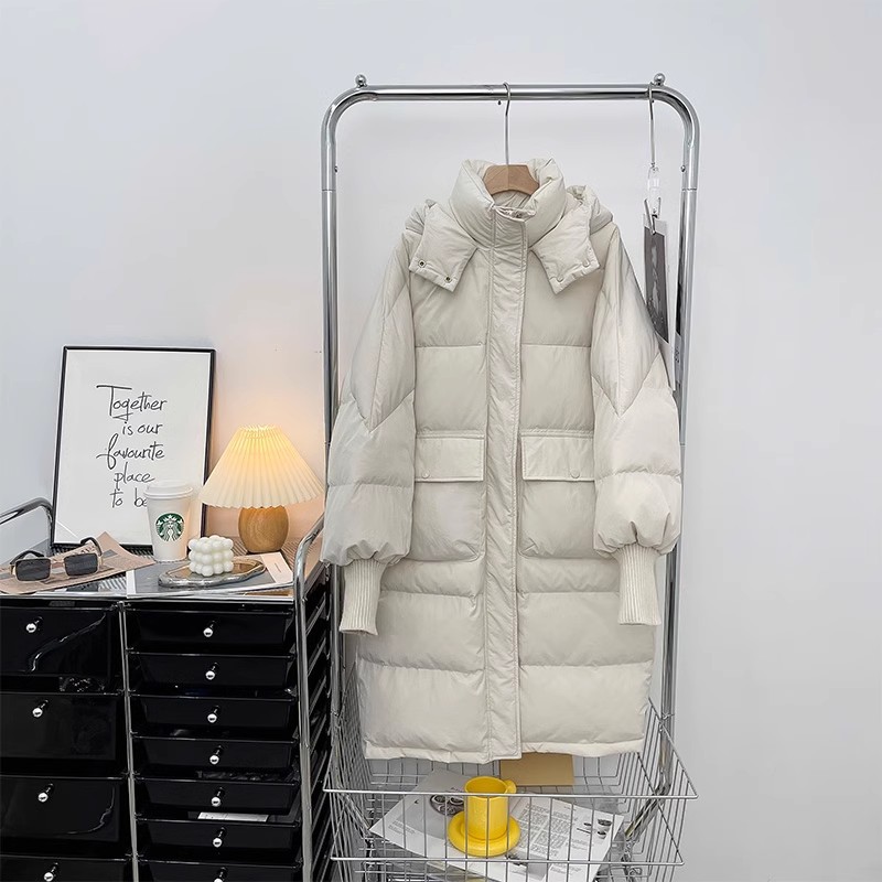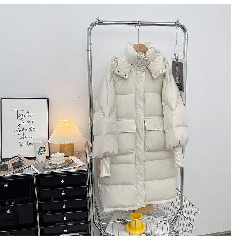 니트 슬리브 다운 재킷 여자의 긴 후드 두꺼운 흰색 오리 다운 재킷 겨울 2023 새로운 겨울 옷스토어 가기