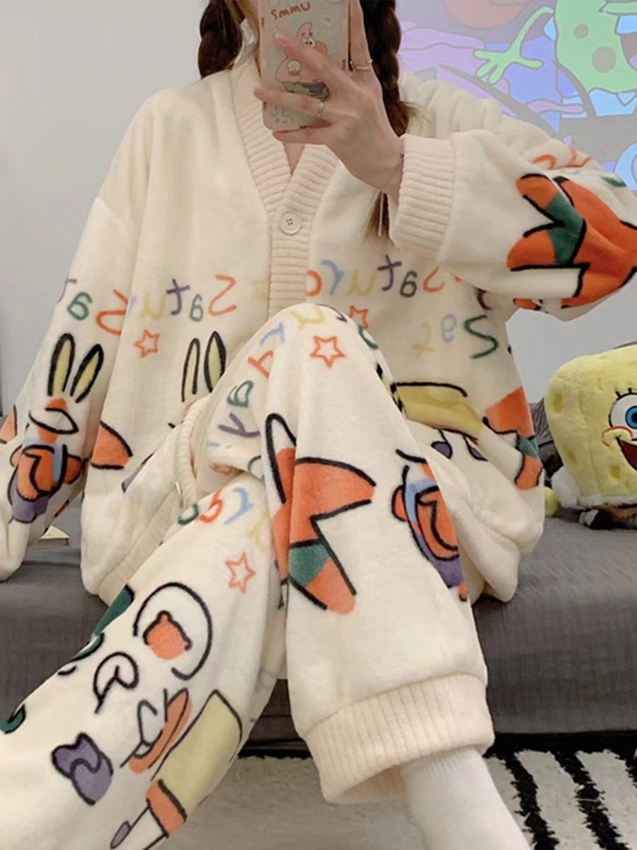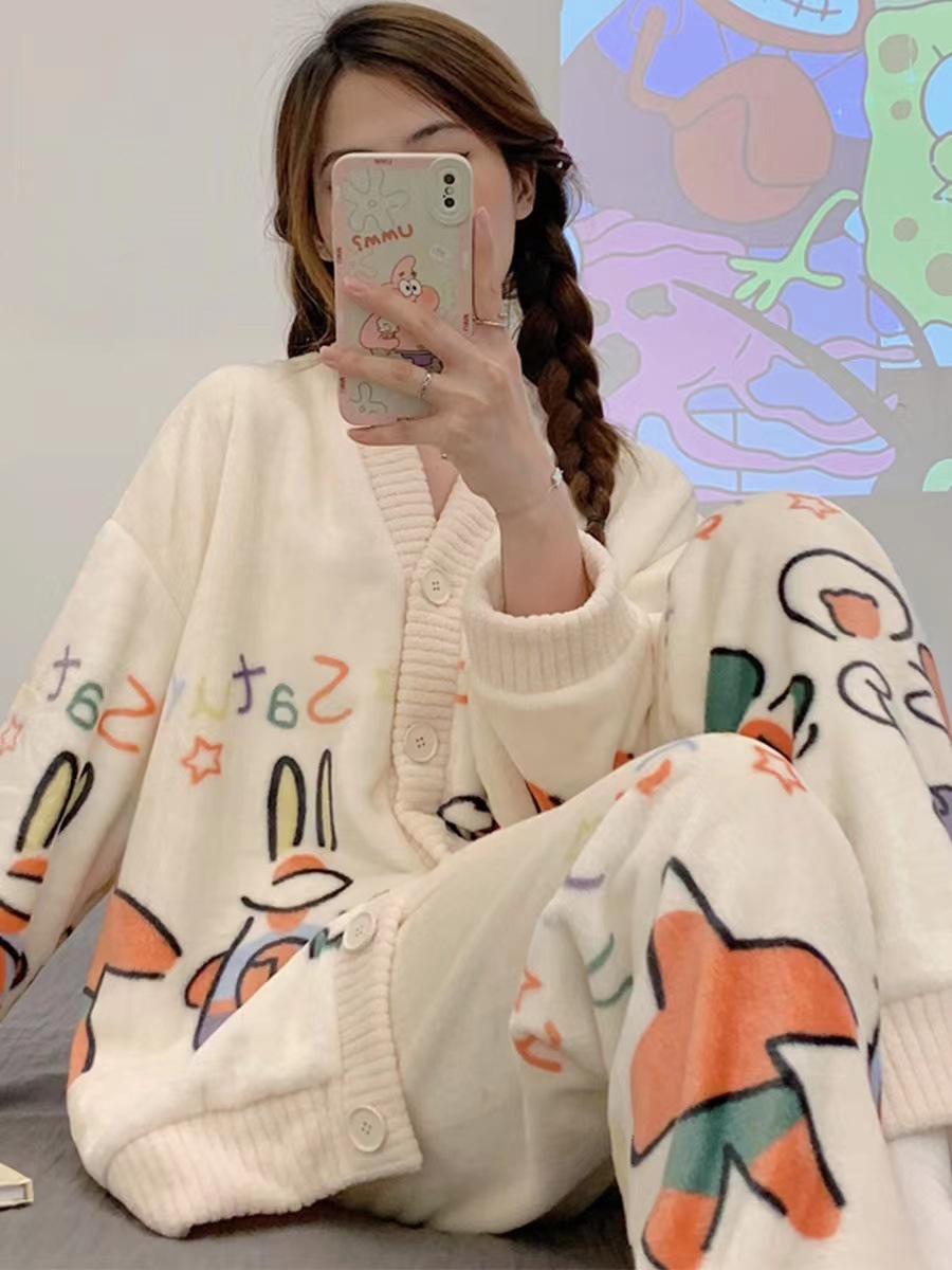 海绵宝宝珊瑚绒睡衣套装加厚保暖可爱甜美卡通网红爆款开衫居家服
