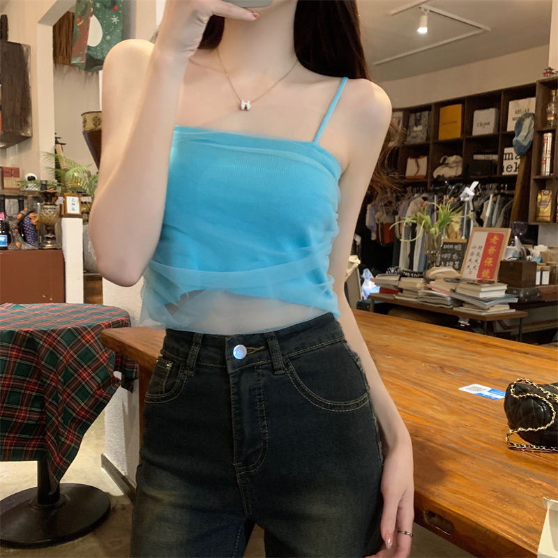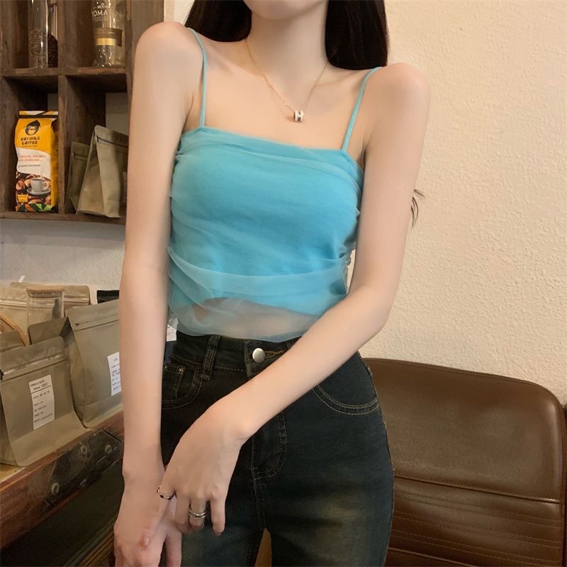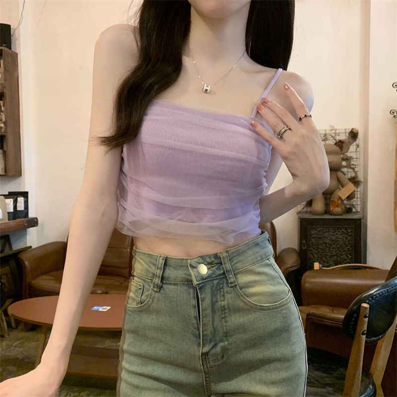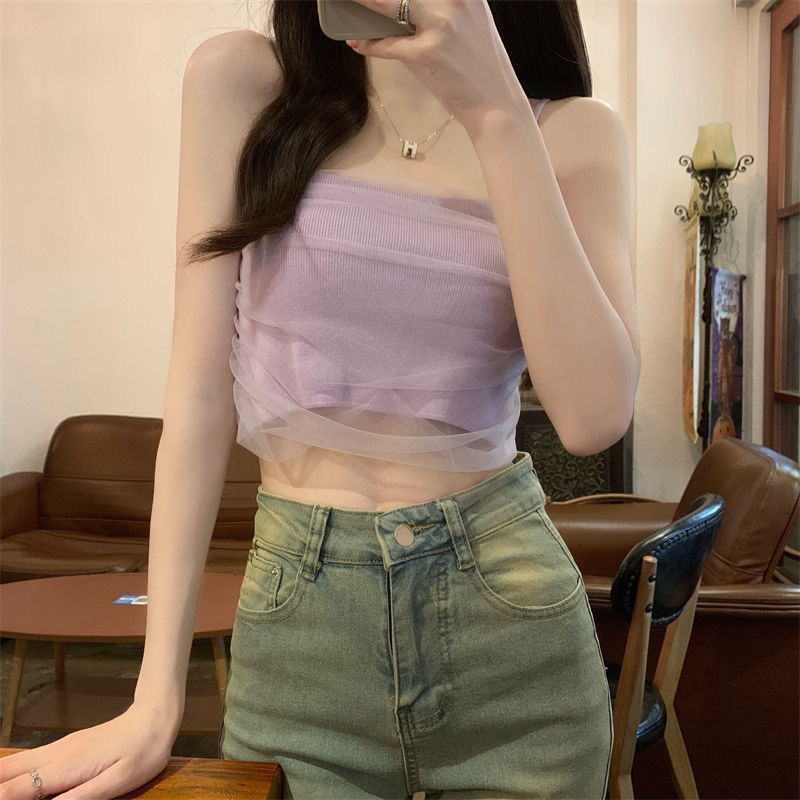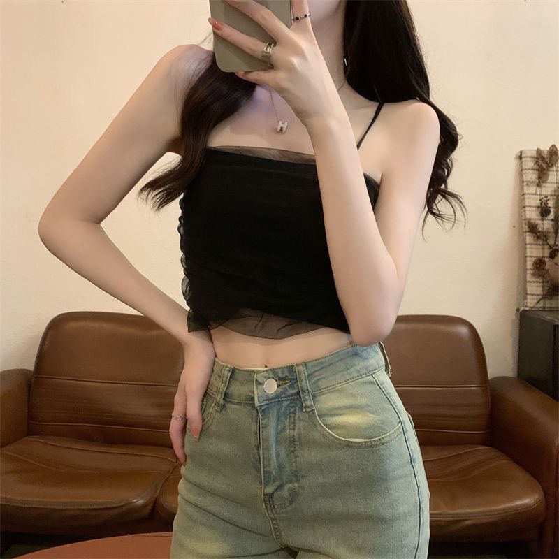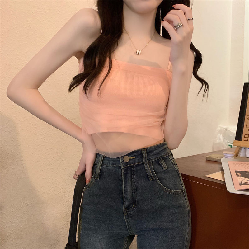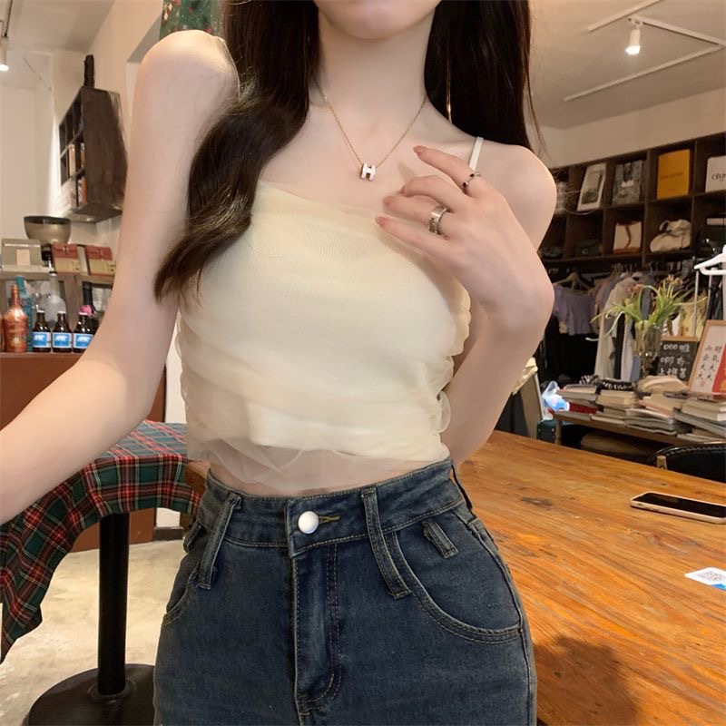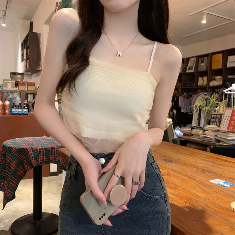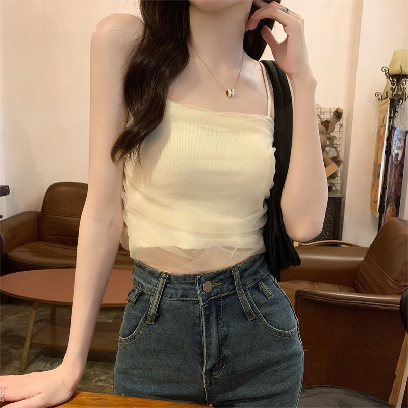 화이트 메쉬 디자인 센스 틈새 캐미솔 여성용 여름 달콤하고 뜨거운 스타일 유행 심플 모든 매치 쇼트 탑 트렌디스토어 가기