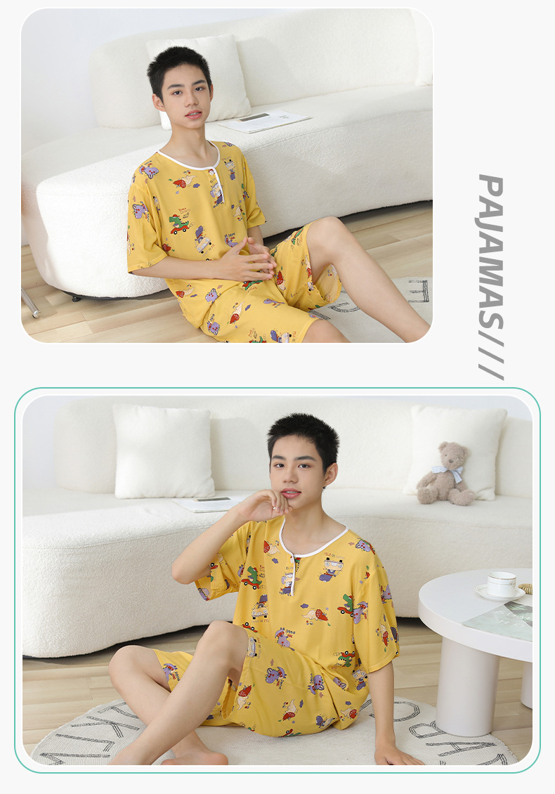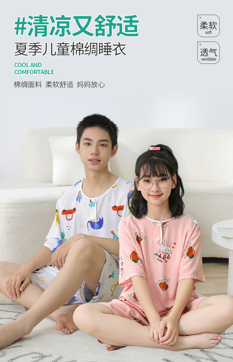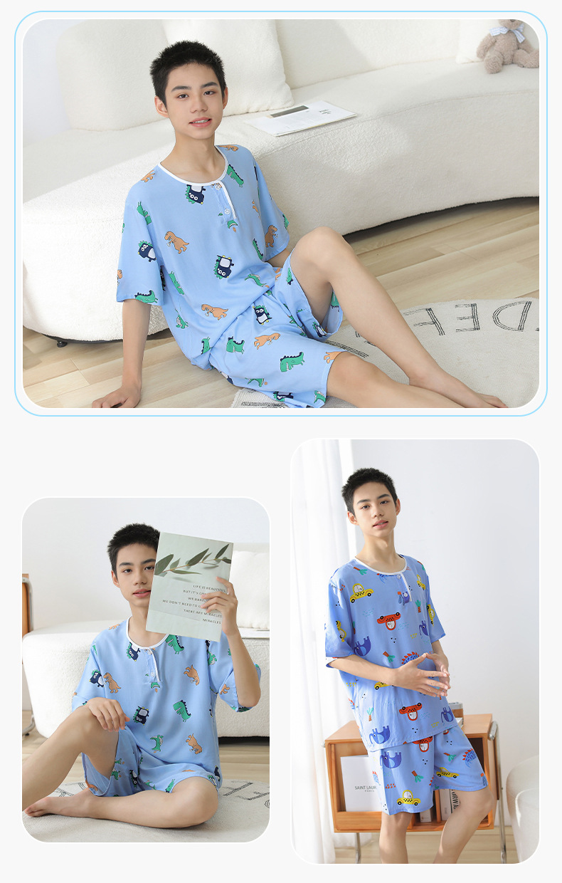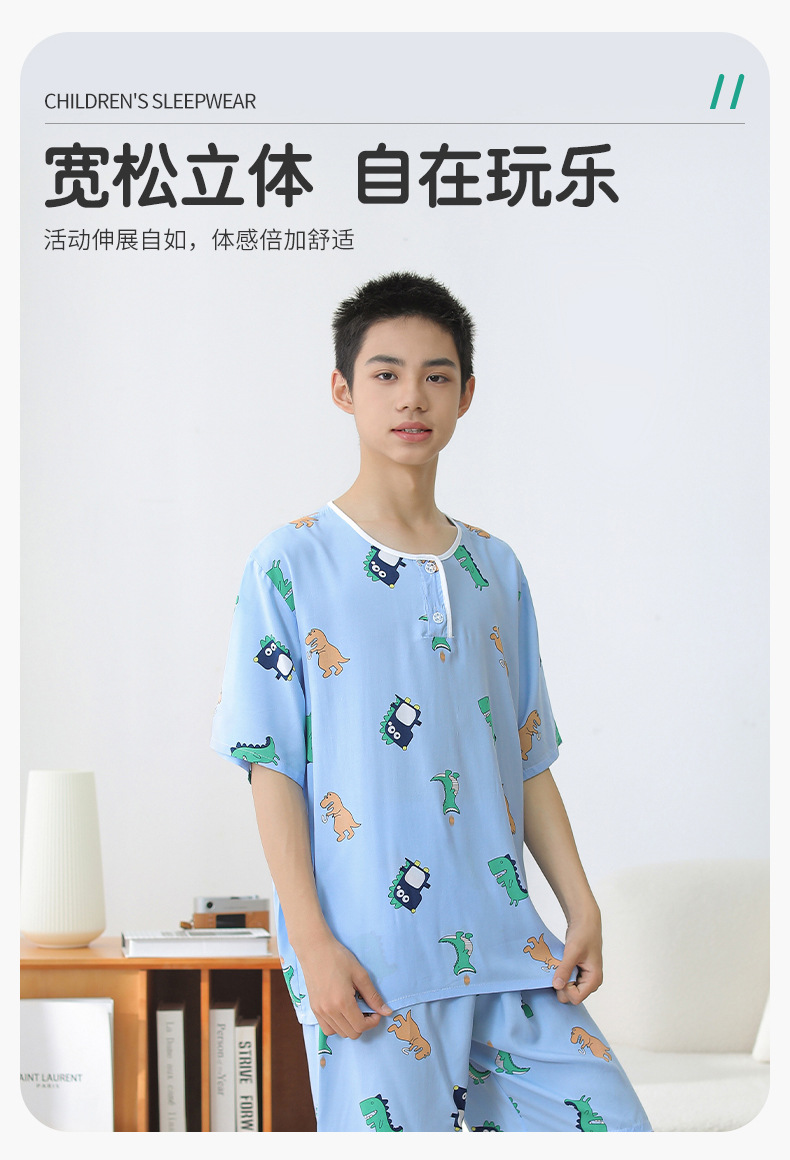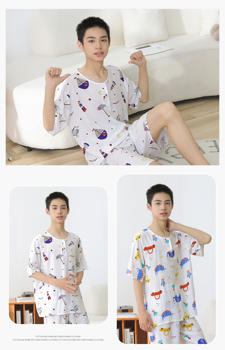 소년 잠옷 여름 얇은 반팔 반바지 청소년 느슨한 플러스 사이즈 큰 아이 인공 면 에어컨 가정 옷 세트스토어 가기