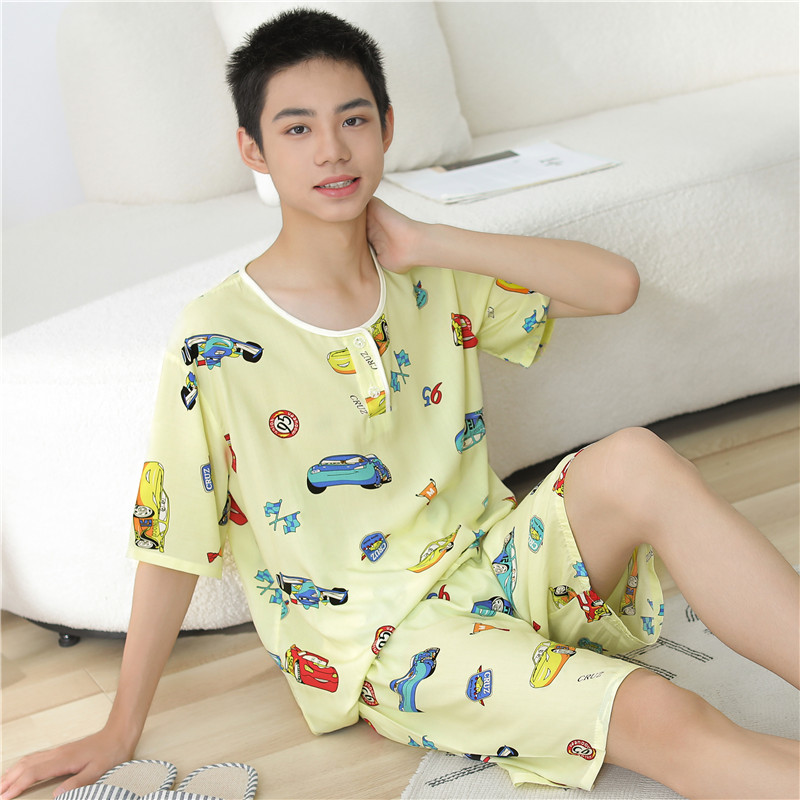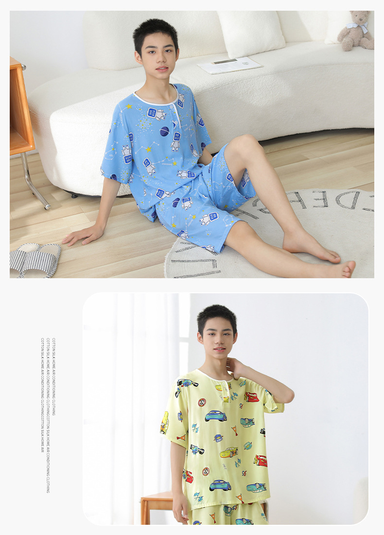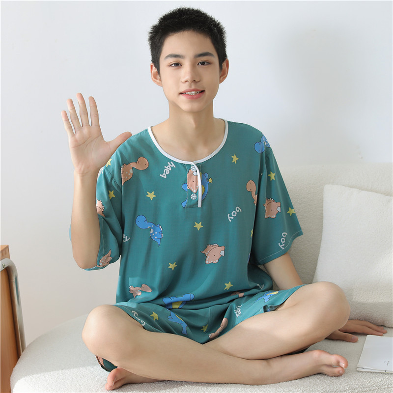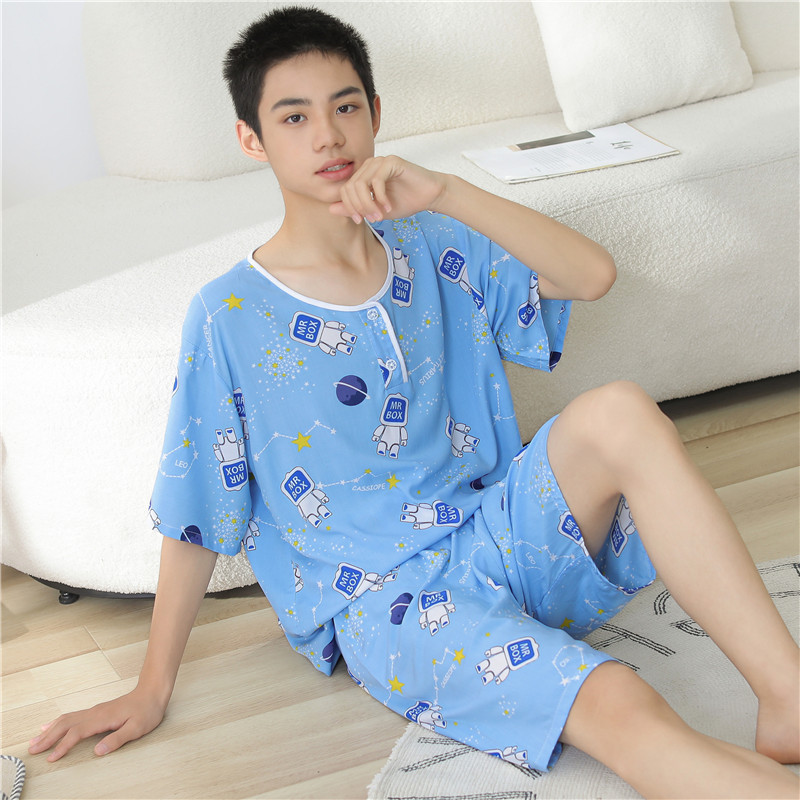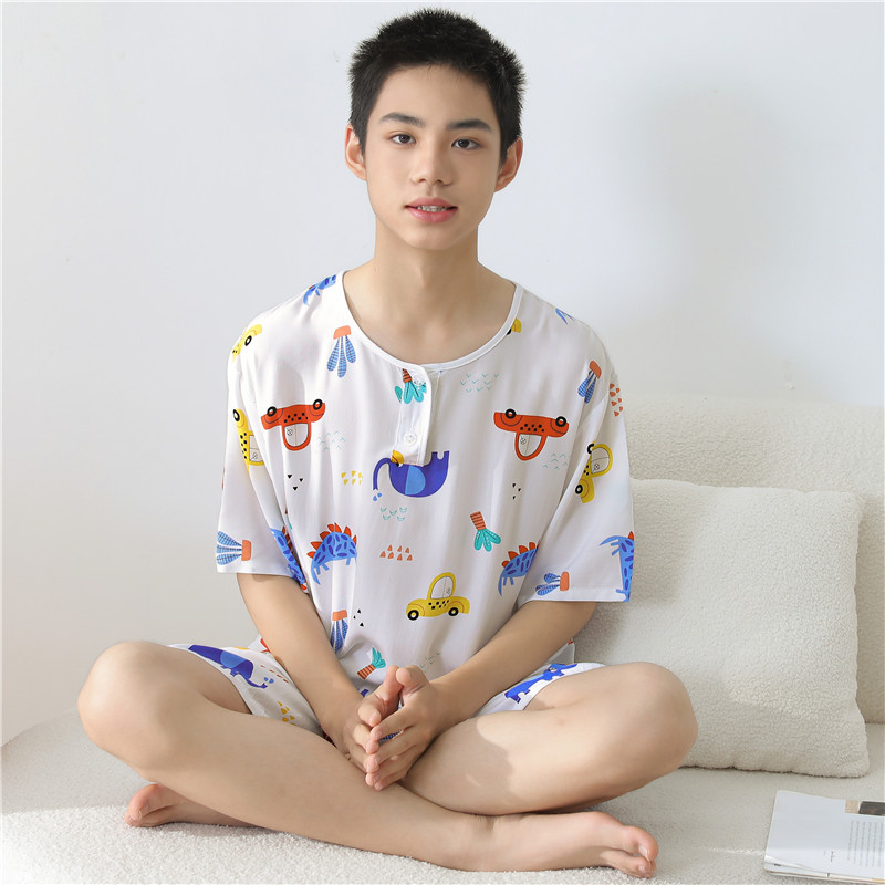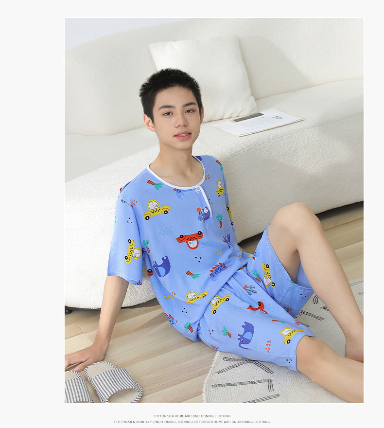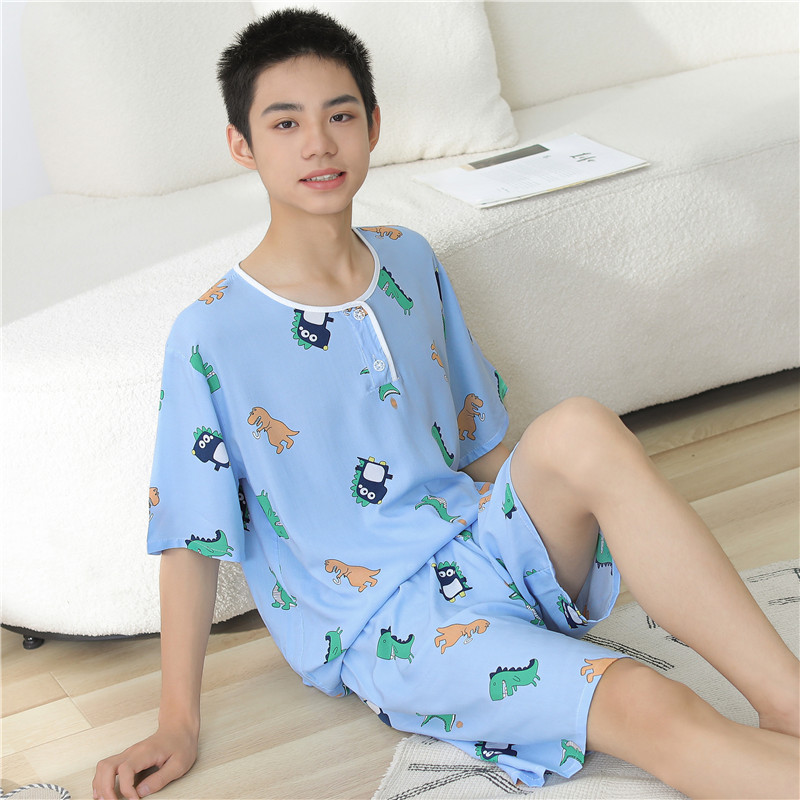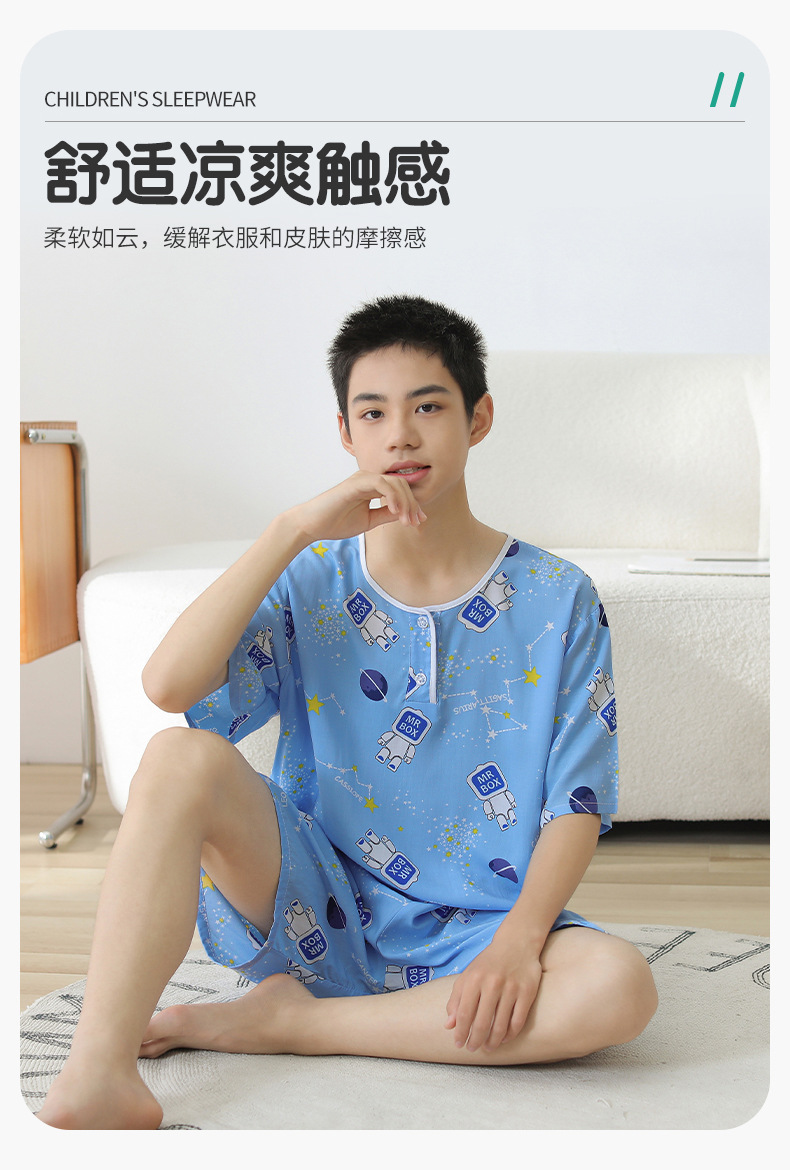 소년 잠옷 여름 얇은 반팔 반바지 청소년 느슨한 플러스 사이즈 큰 아이 인공 면 에어컨 가정 옷 세트