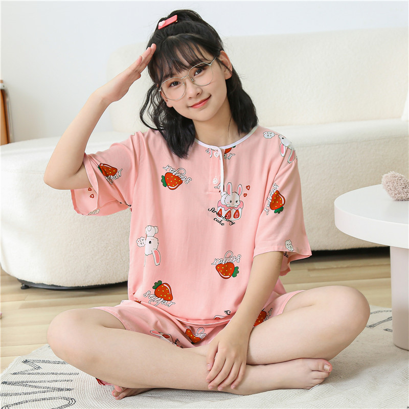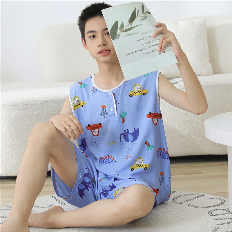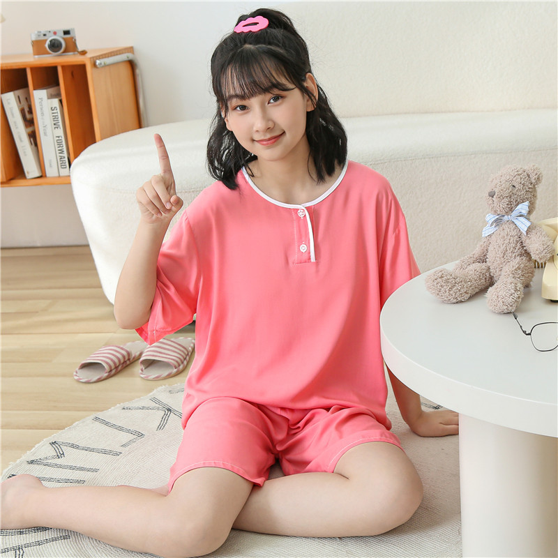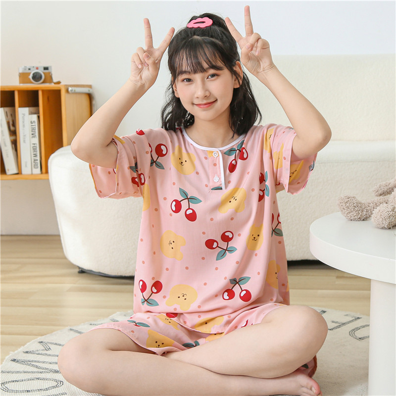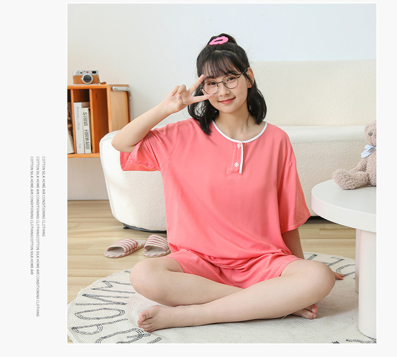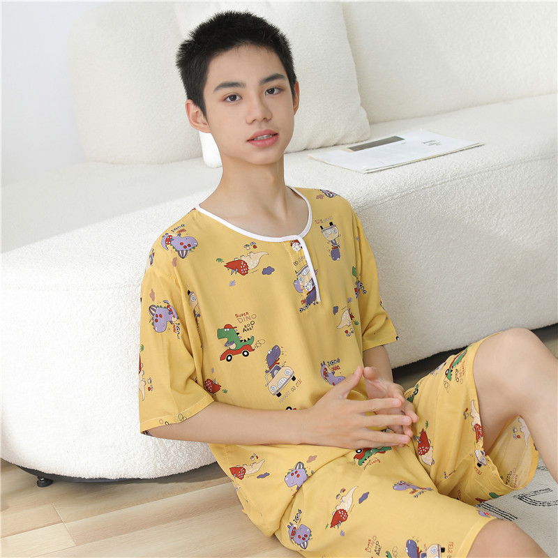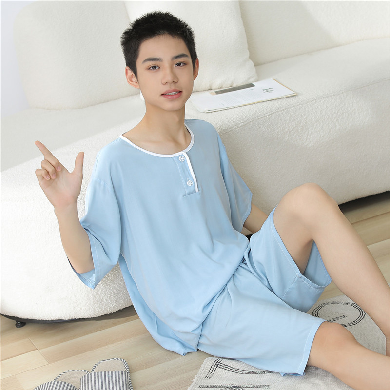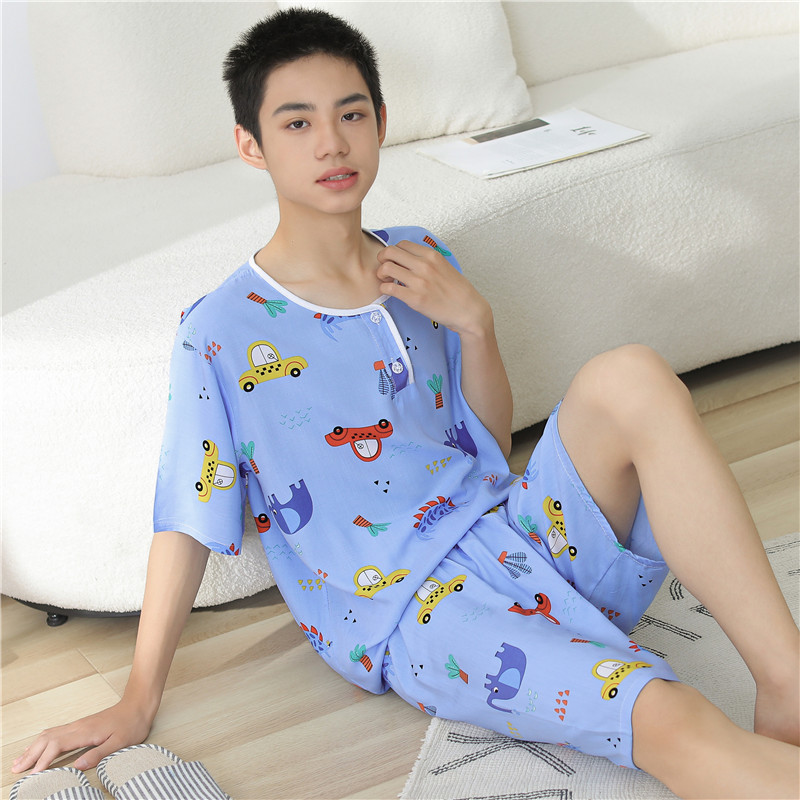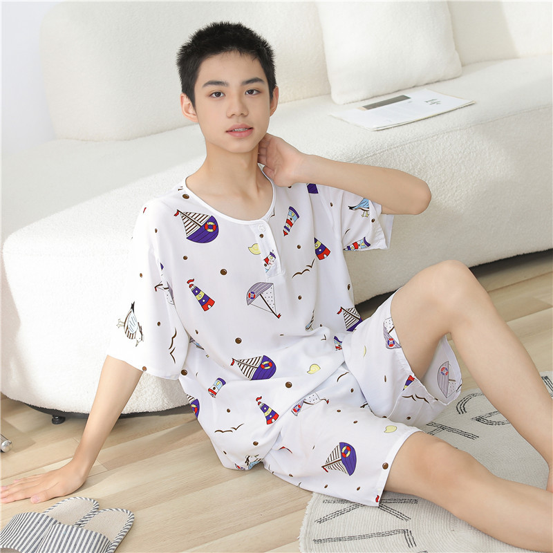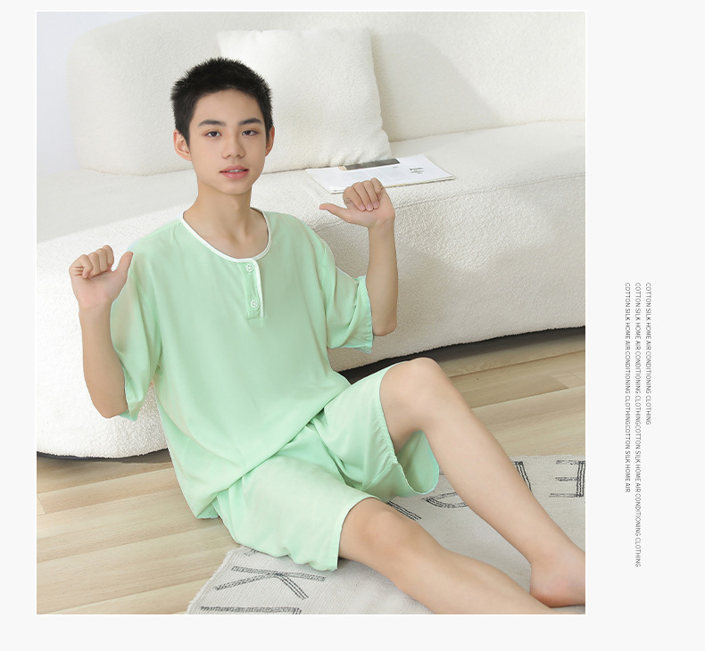 소년 잠옷 여름 얇은 반팔 반바지 청소년 느슨한 플러스 사이즈 큰 아이 인공 면 에어컨 가정 옷 세트