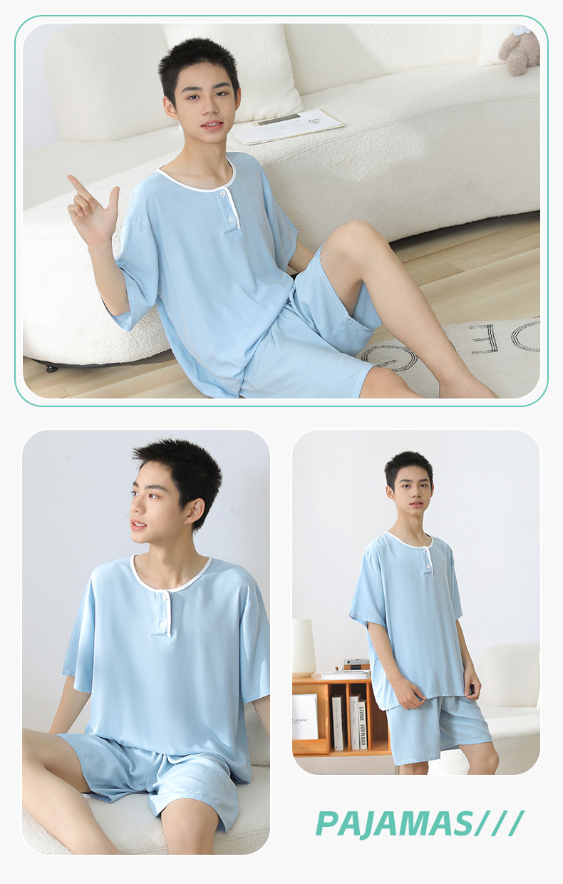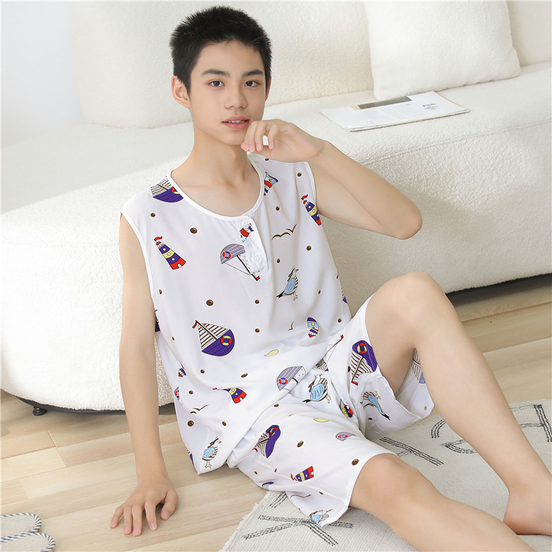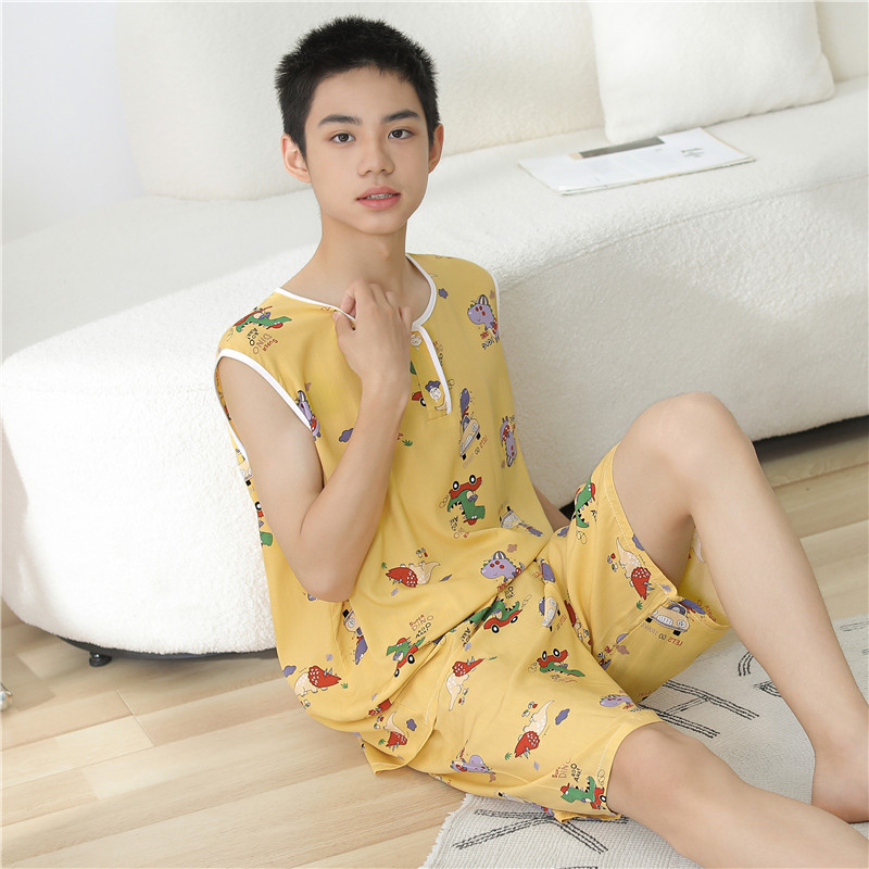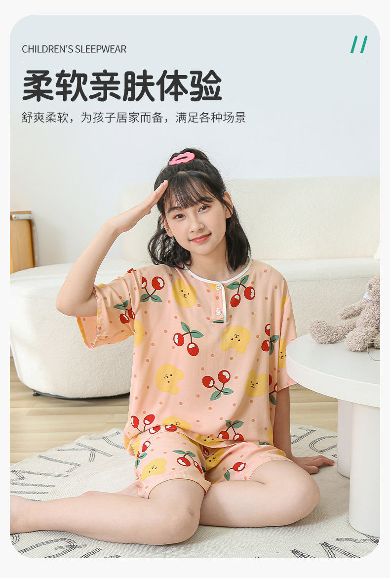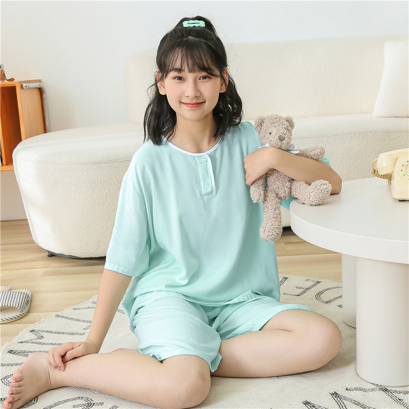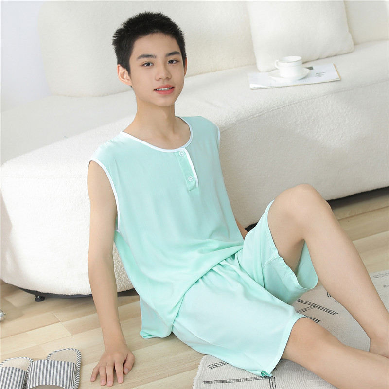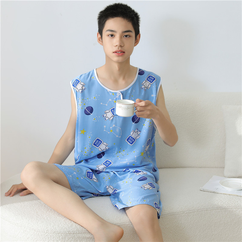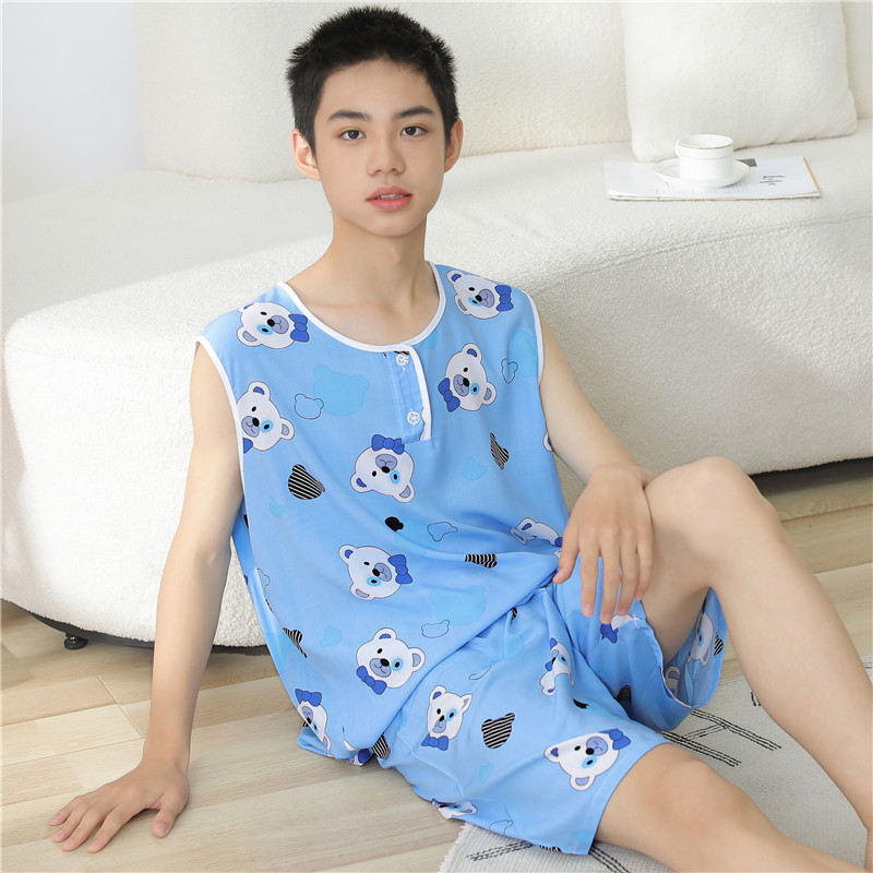 소년 잠옷 여름 얇은 반팔 반바지 청소년 느슨한 플러스 사이즈 큰 아이 인공 면 에어컨 가정 옷 세트