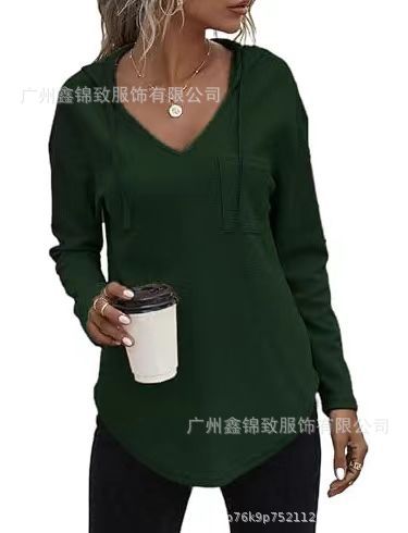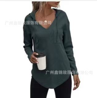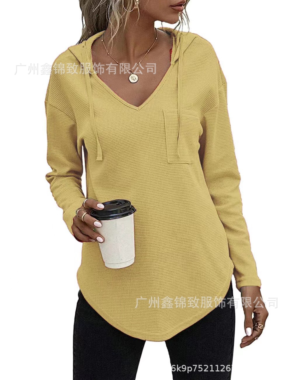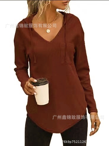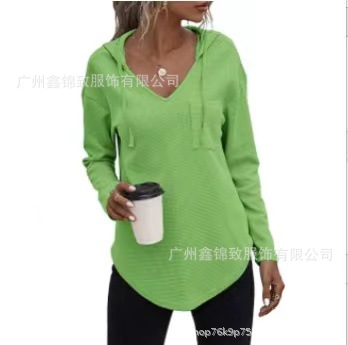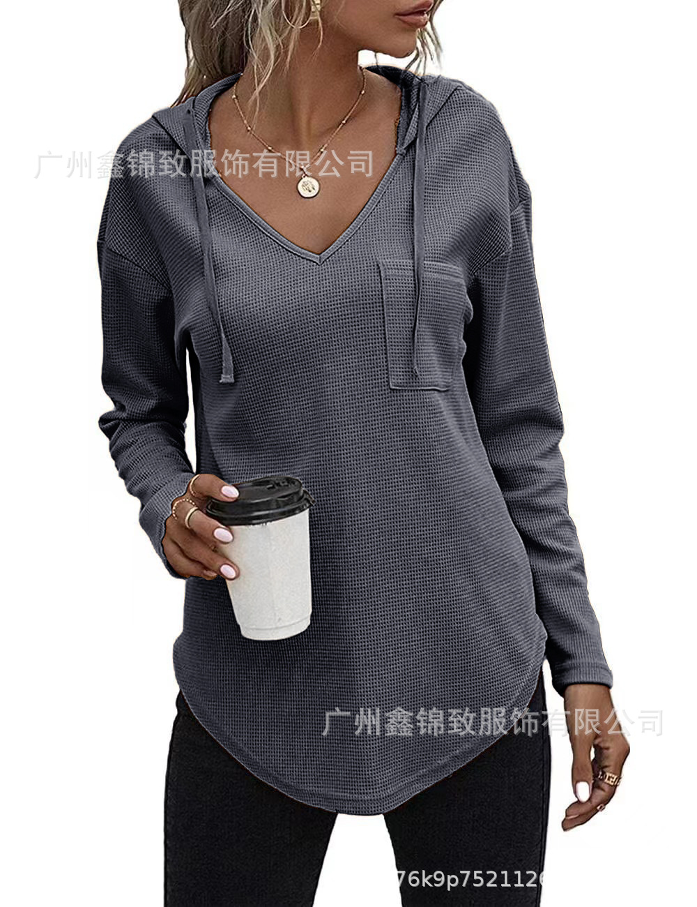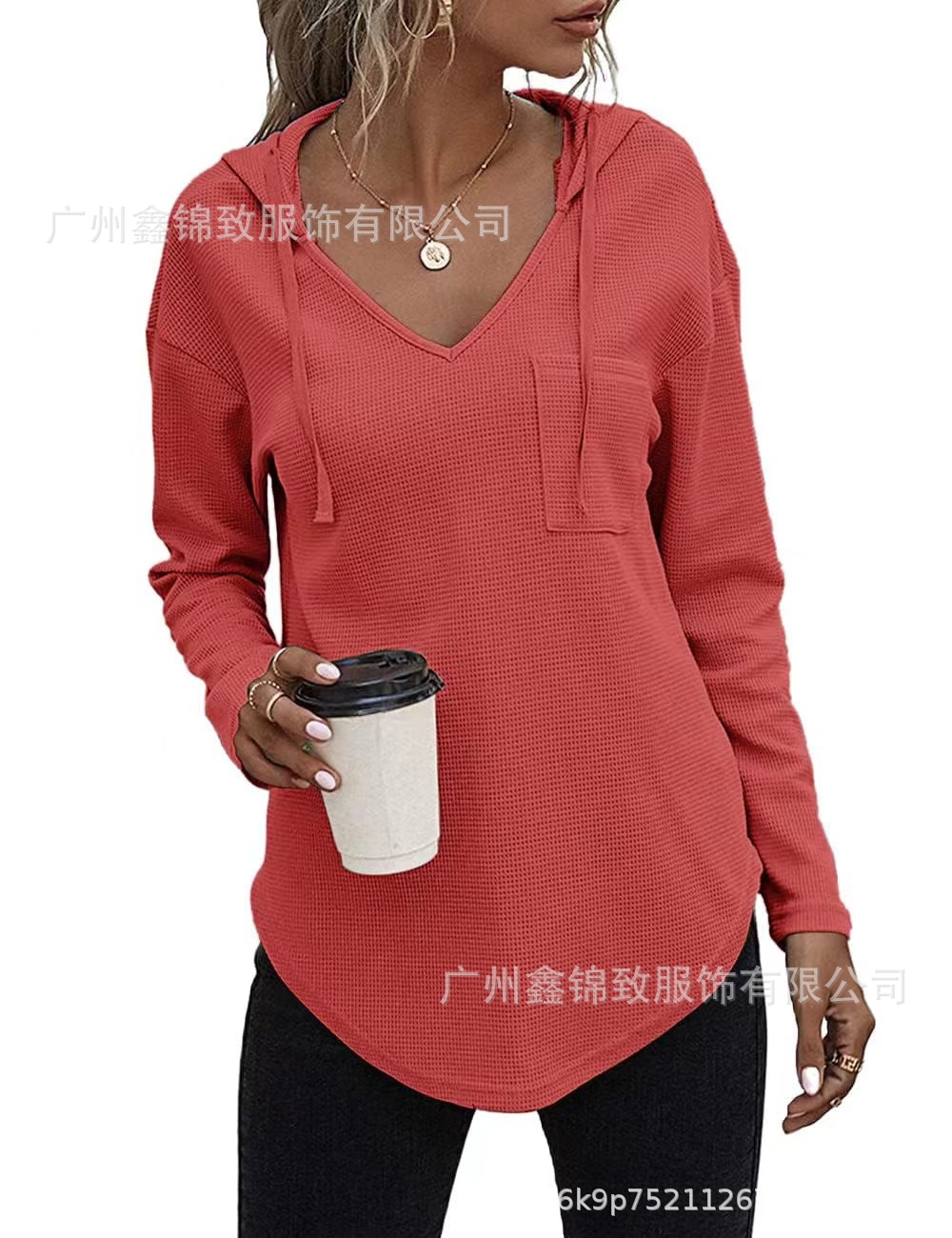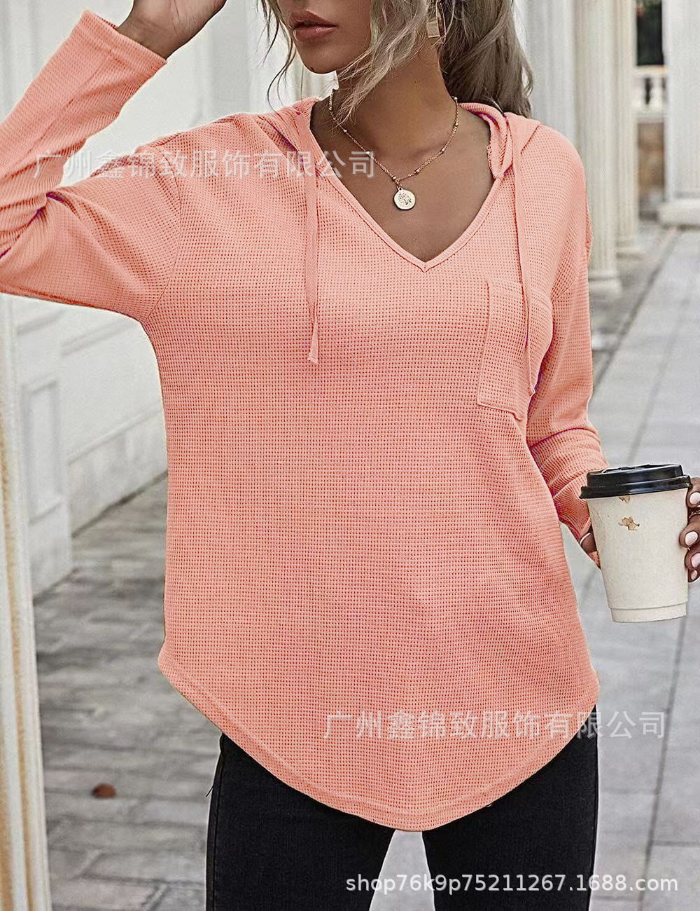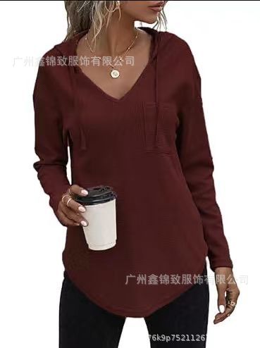 아마존 독립 역 새로운 여성용 V-넥 긴 소매 까마귀 와플 스웨터 여성용 졸라매는 끈 풀오버 탑 포켓