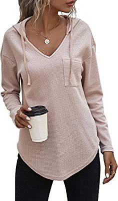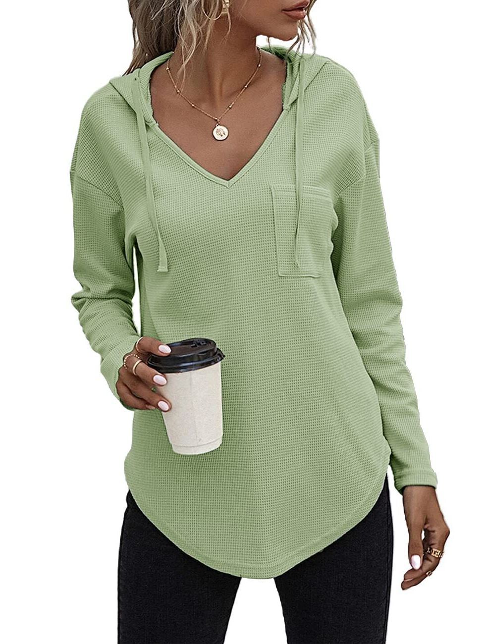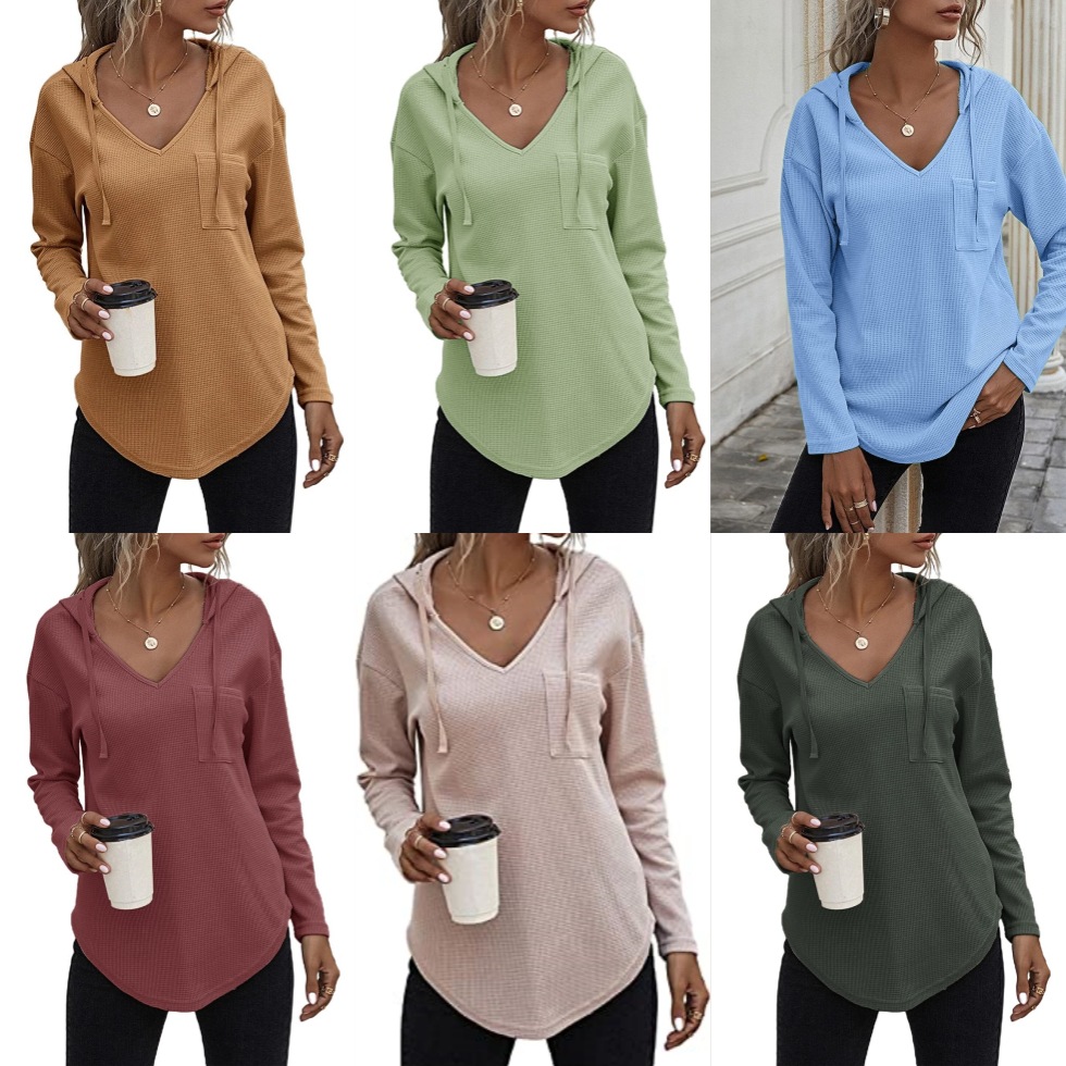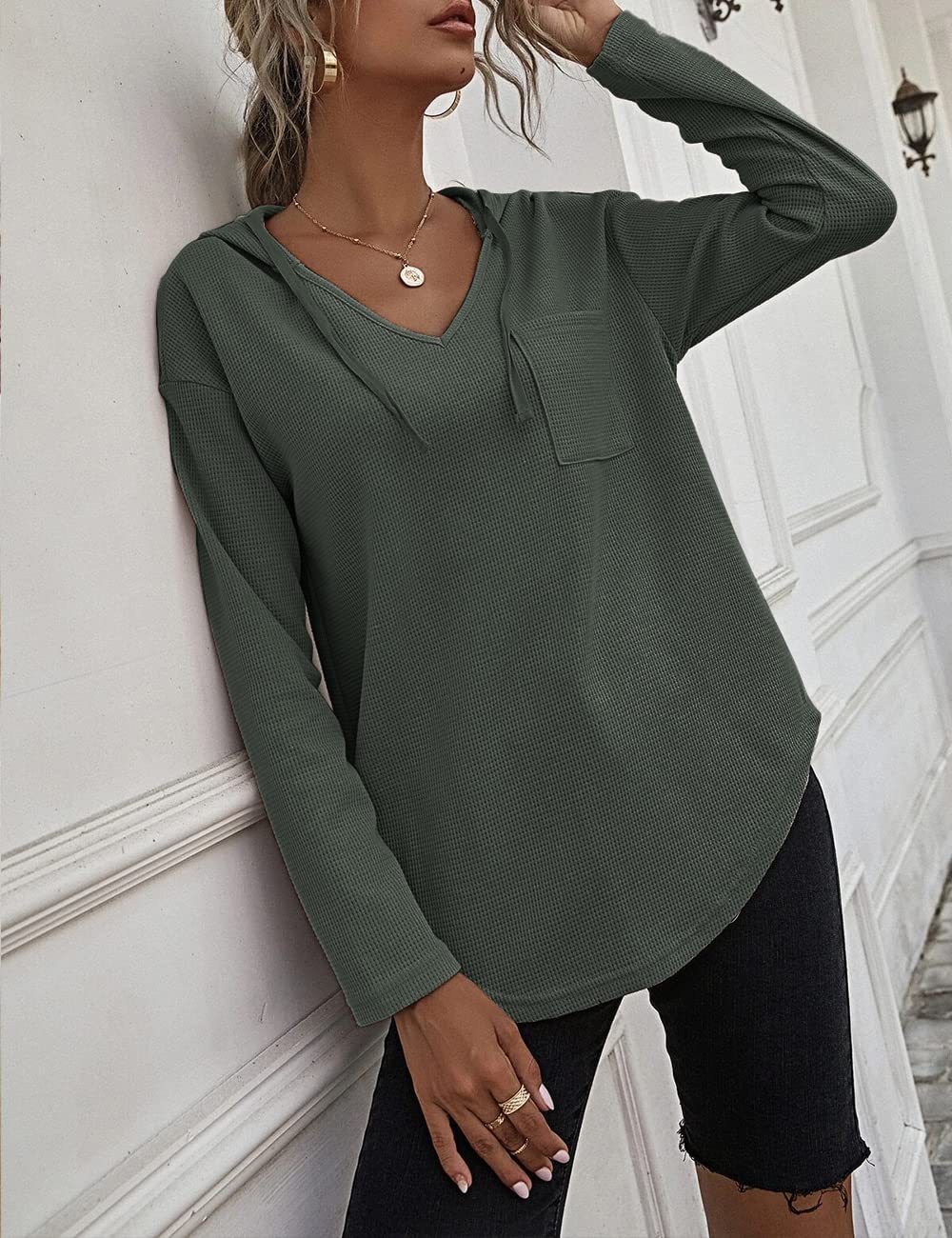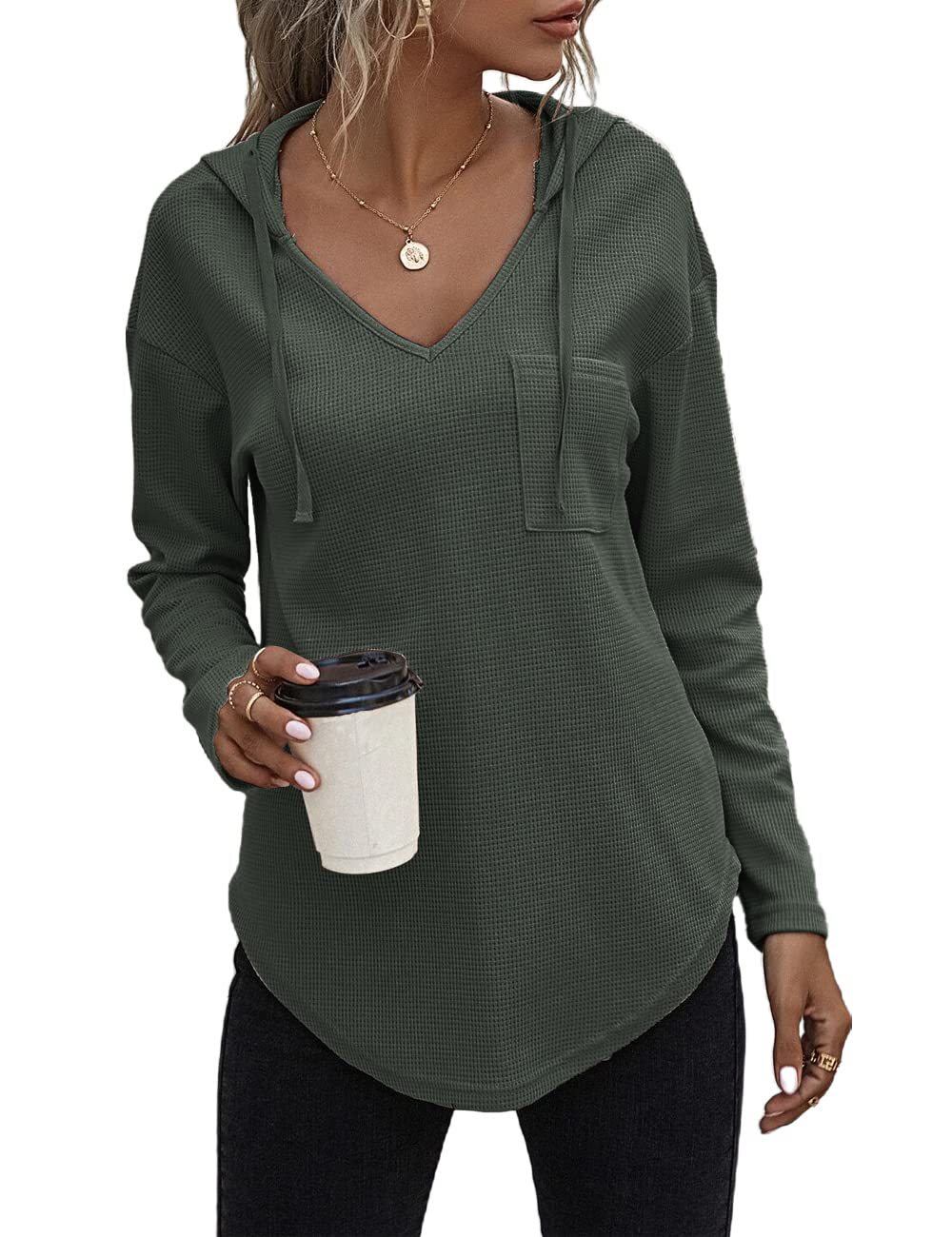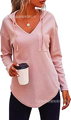 아마존 독립 역 새로운 여성용 V-넥 긴 소매 까마귀 와플 스웨터 여성용 졸라매는 끈 풀오버 탑 포켓스토어 가기