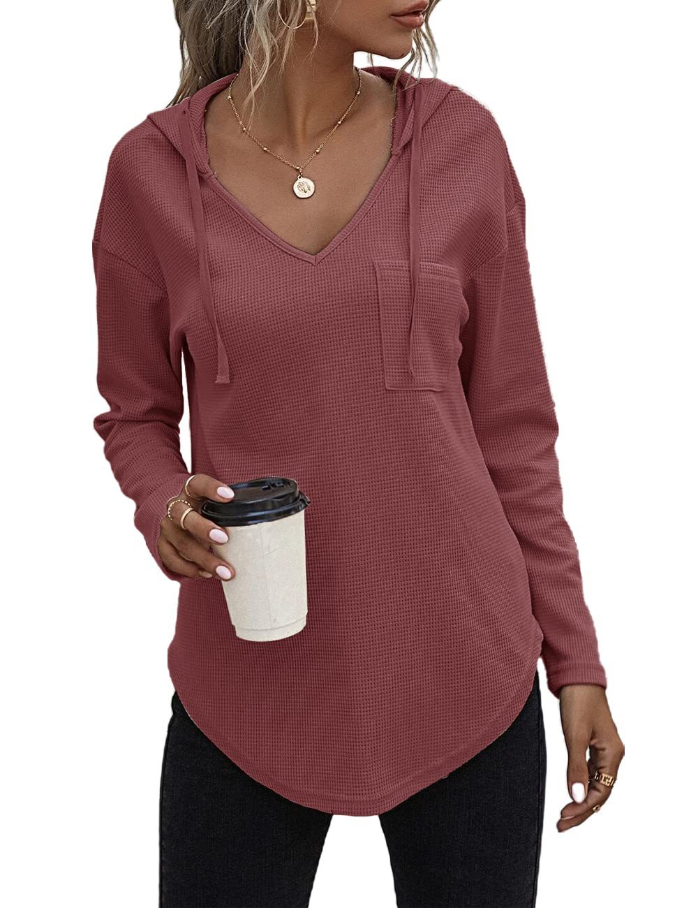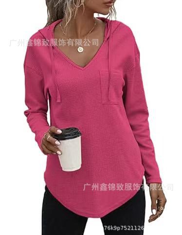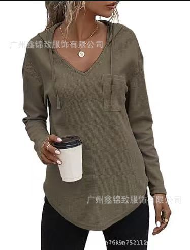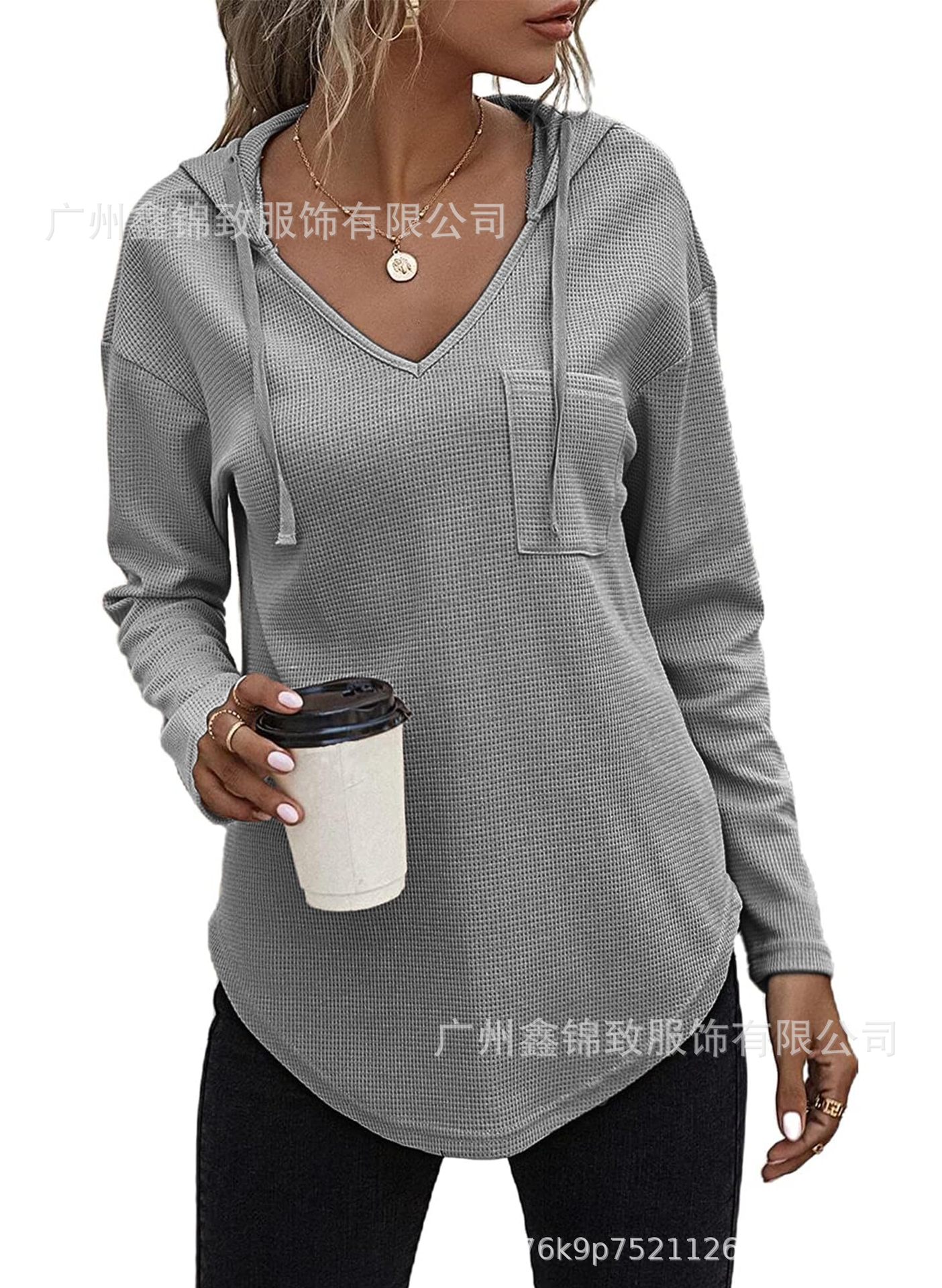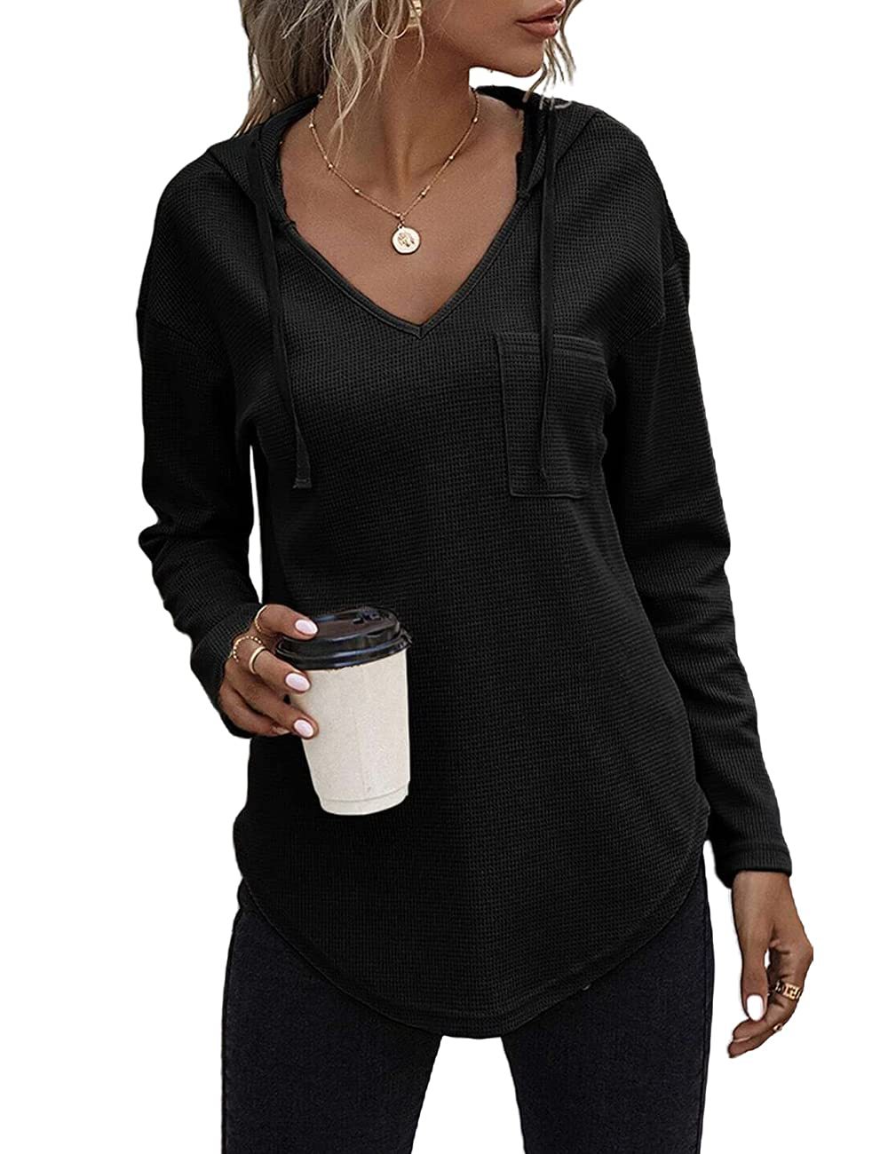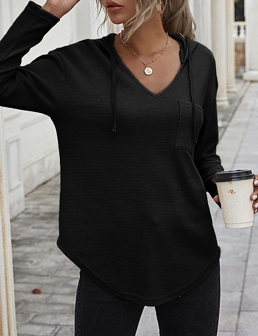아마존 독립 역 새로운 여성용 V-넥 긴 소매 까마귀 와플 스웨터 여성용 졸라매는 끈 풀오버 탑 포켓스토어 가기