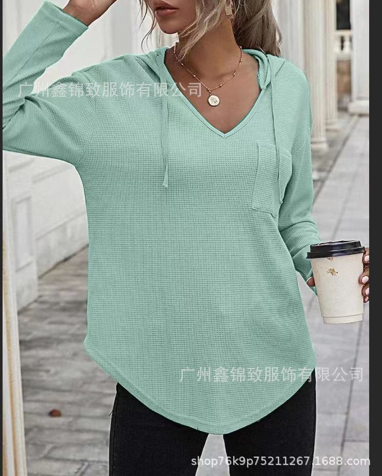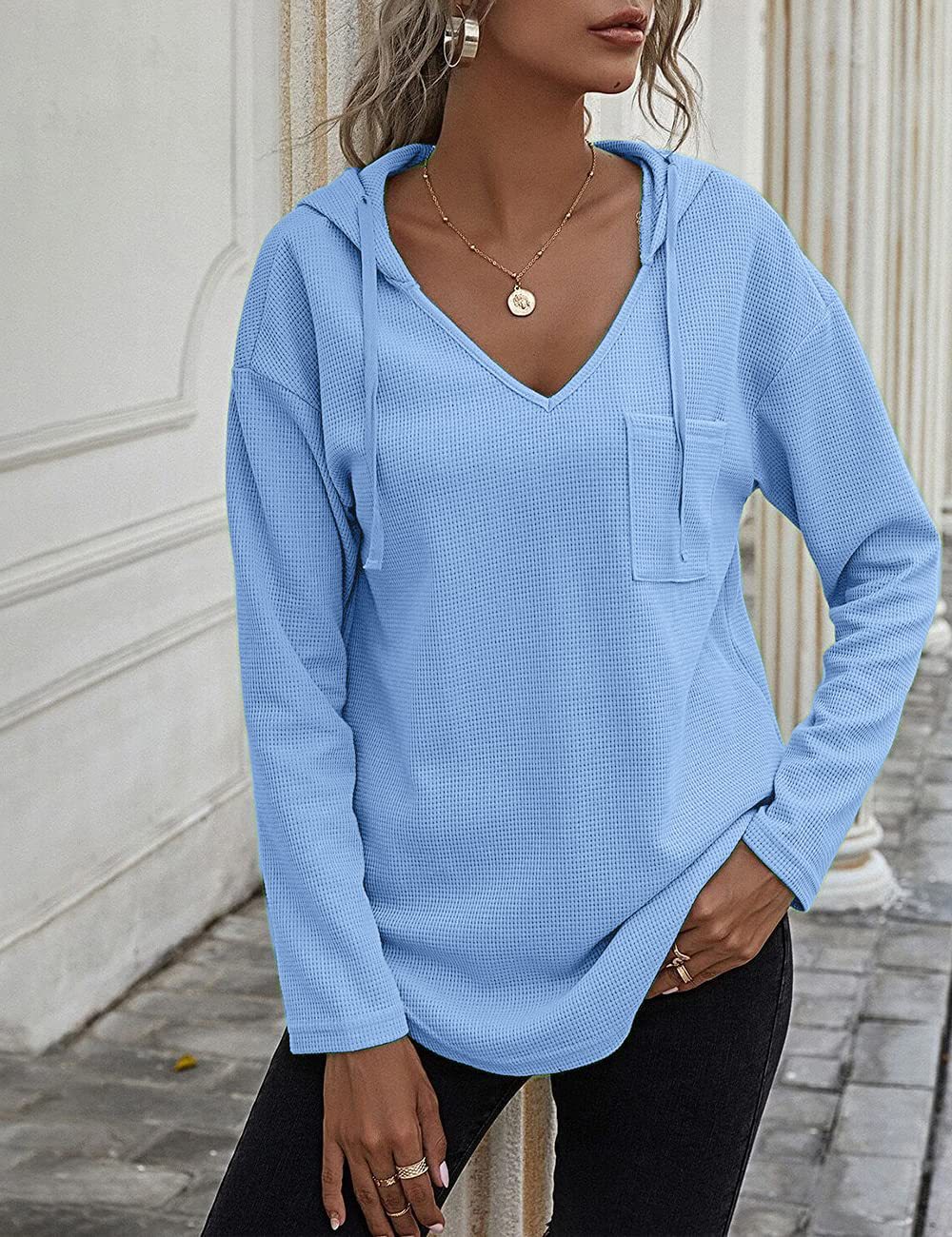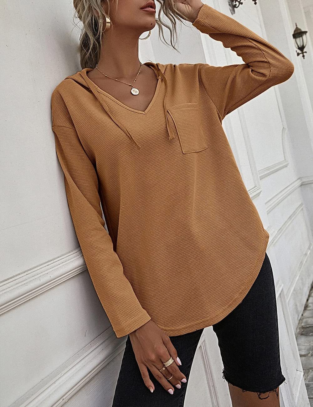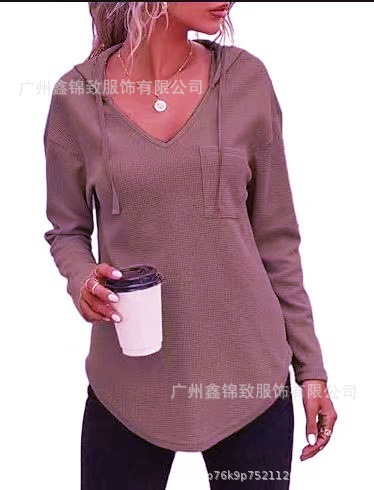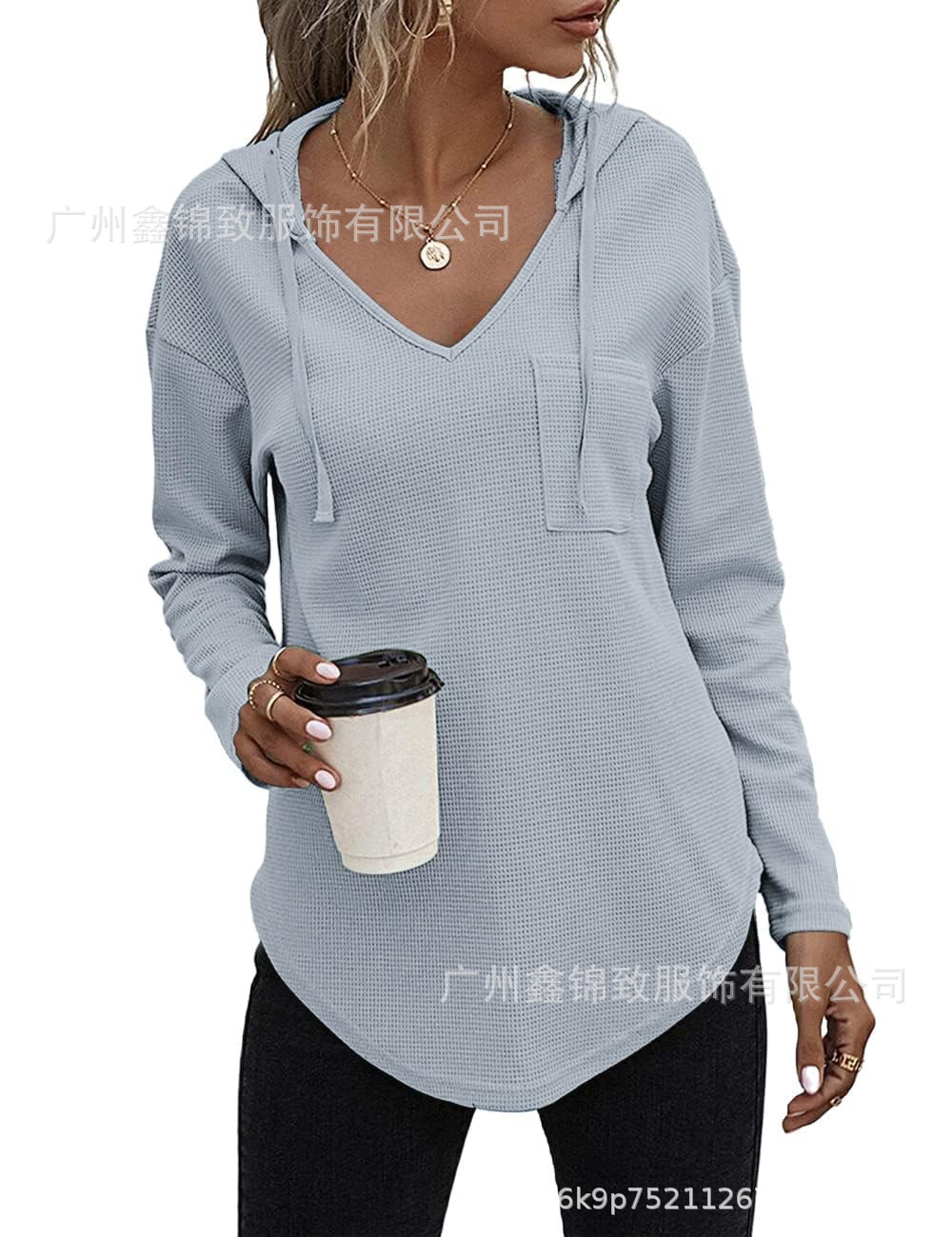 아마존 독립 역 새로운 여성용 V-넥 긴 소매 까마귀 와플 스웨터 여성용 졸라매는 끈 풀오버 탑 포켓스토어 가기