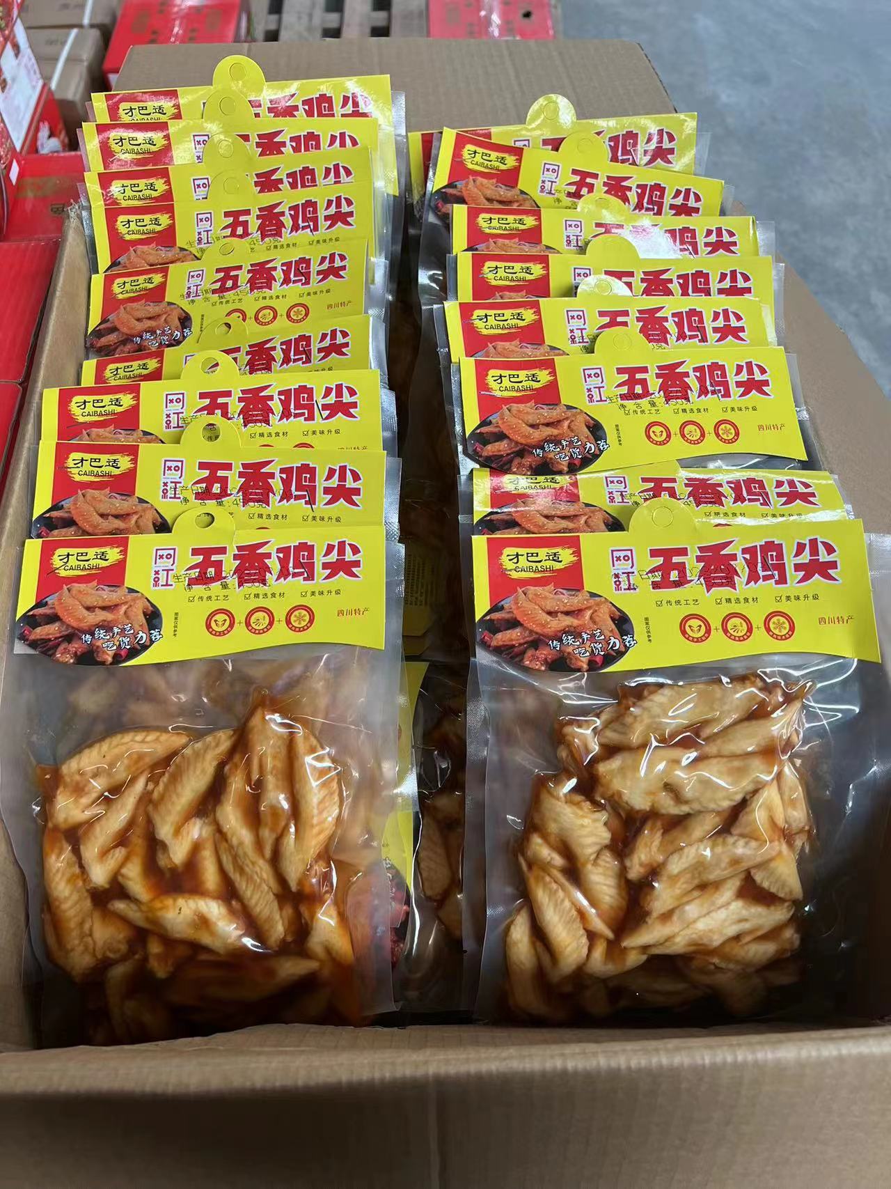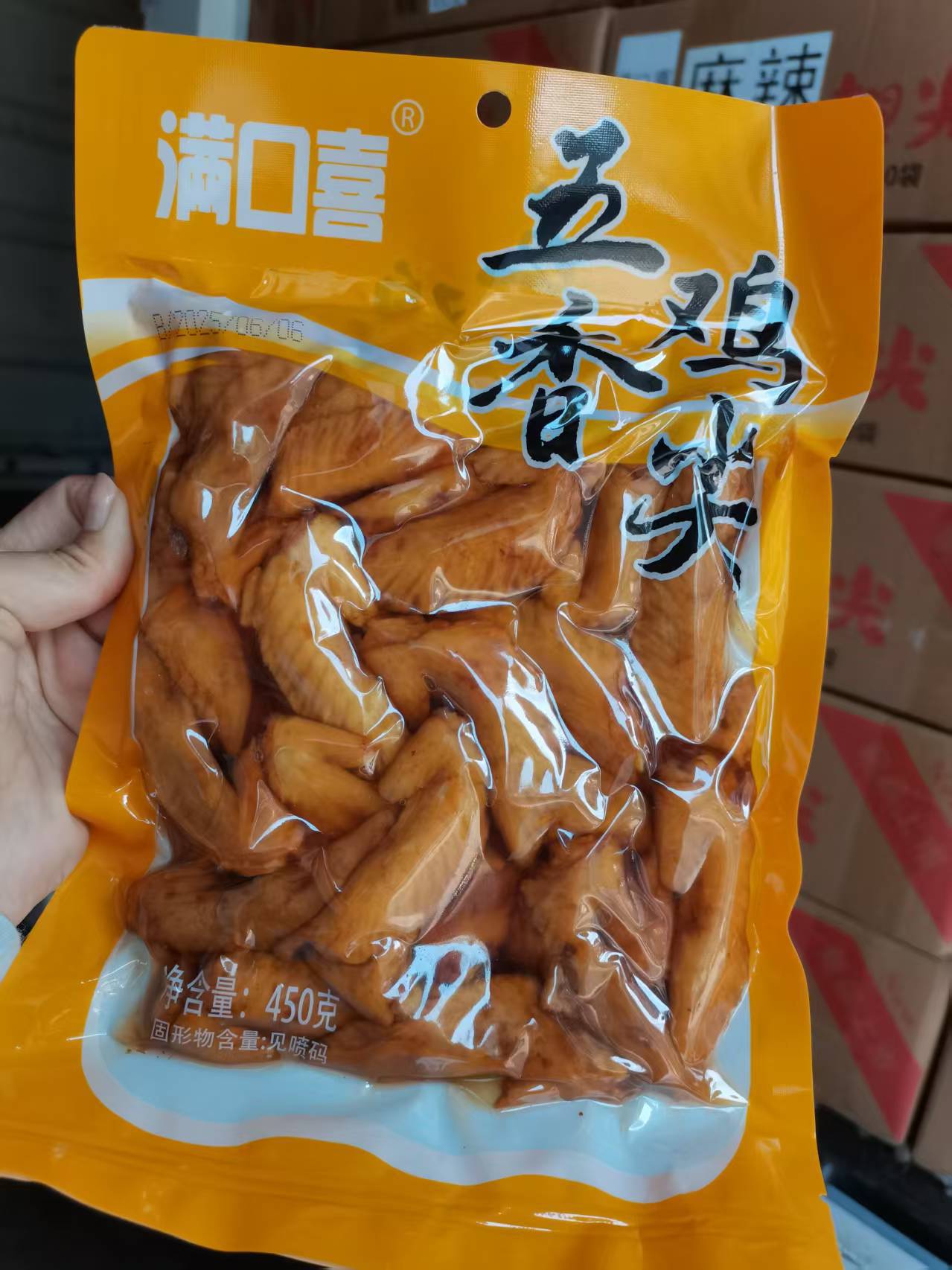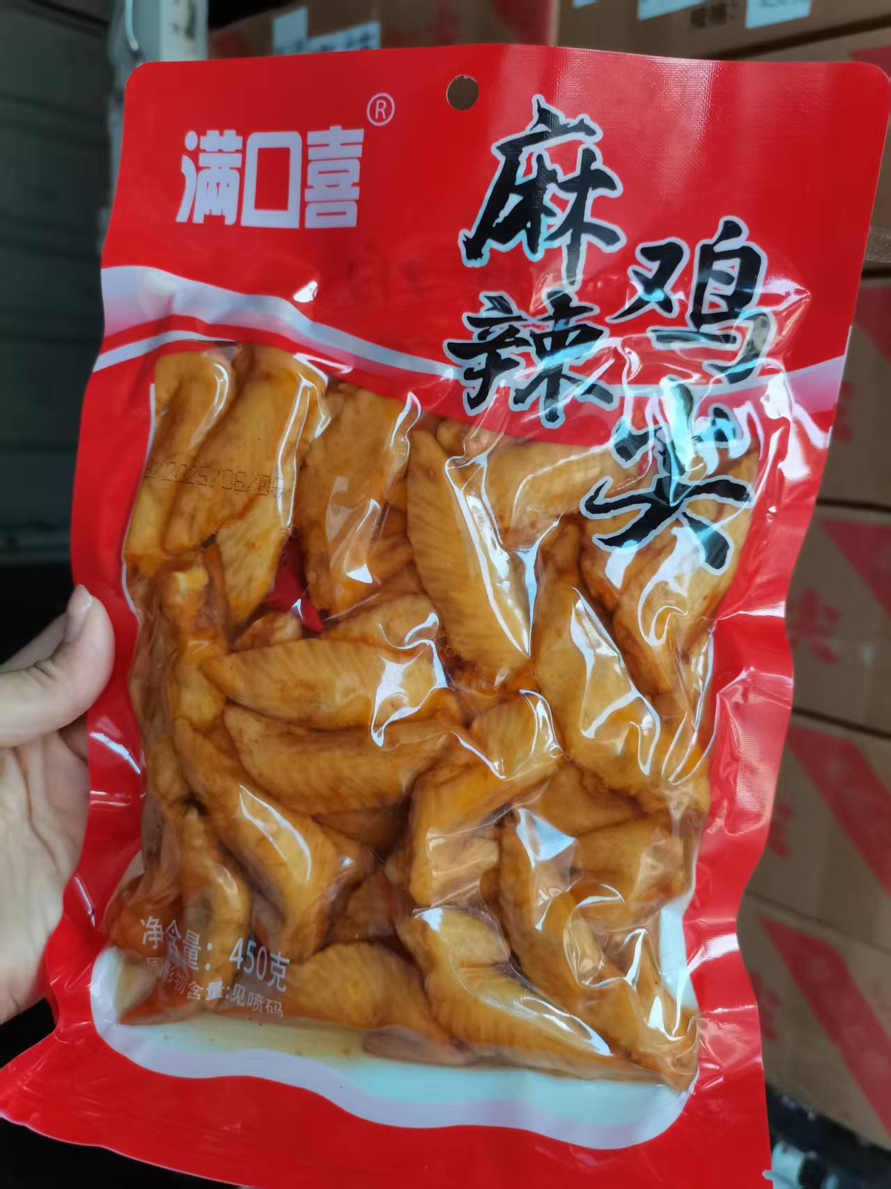 产品介绍:满口喜鸡尖一件30袋,一袋450克,五香味 麻辣味 一件一个味道, 按照30的倍数下单
