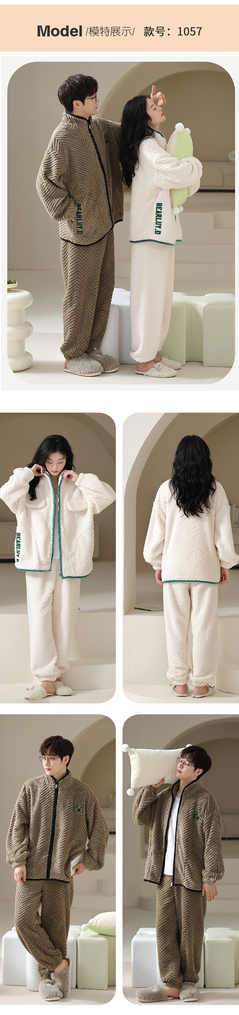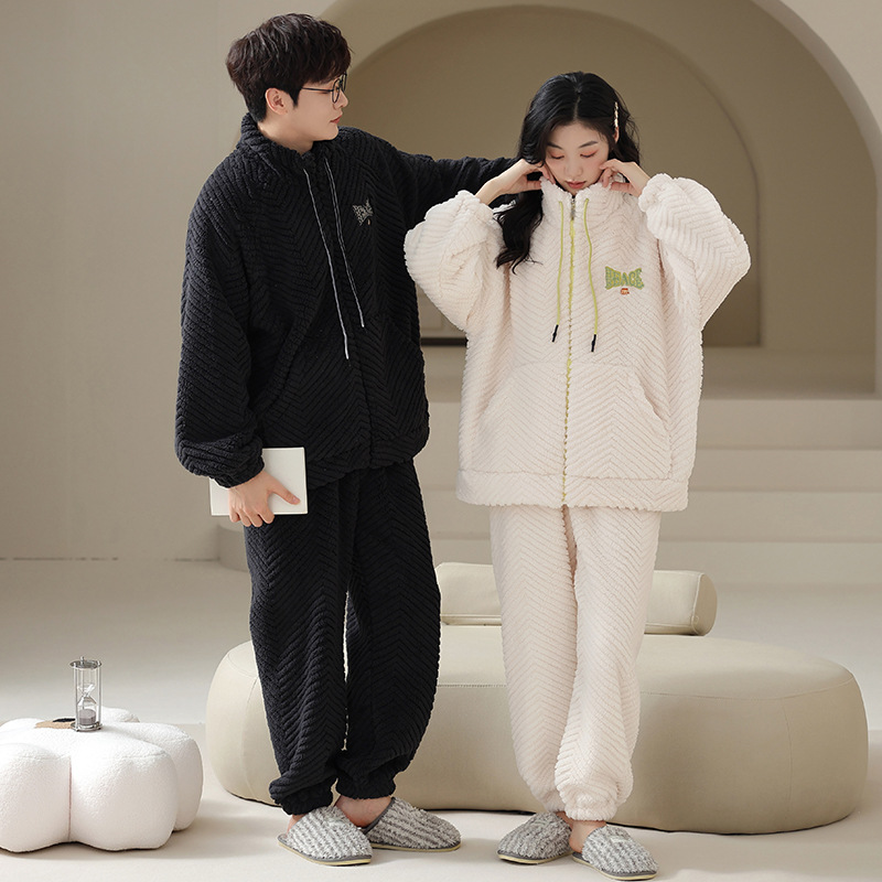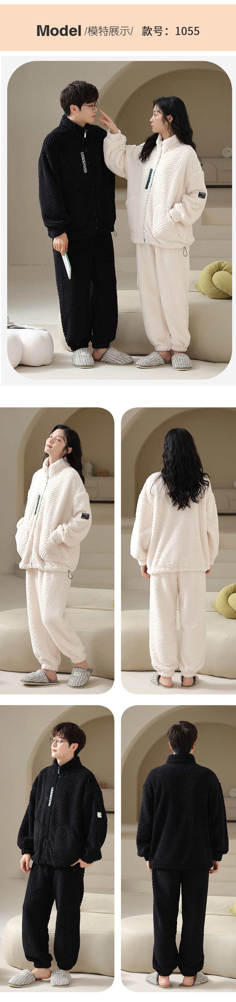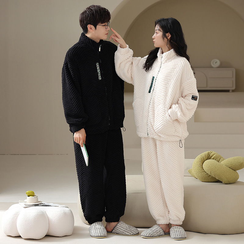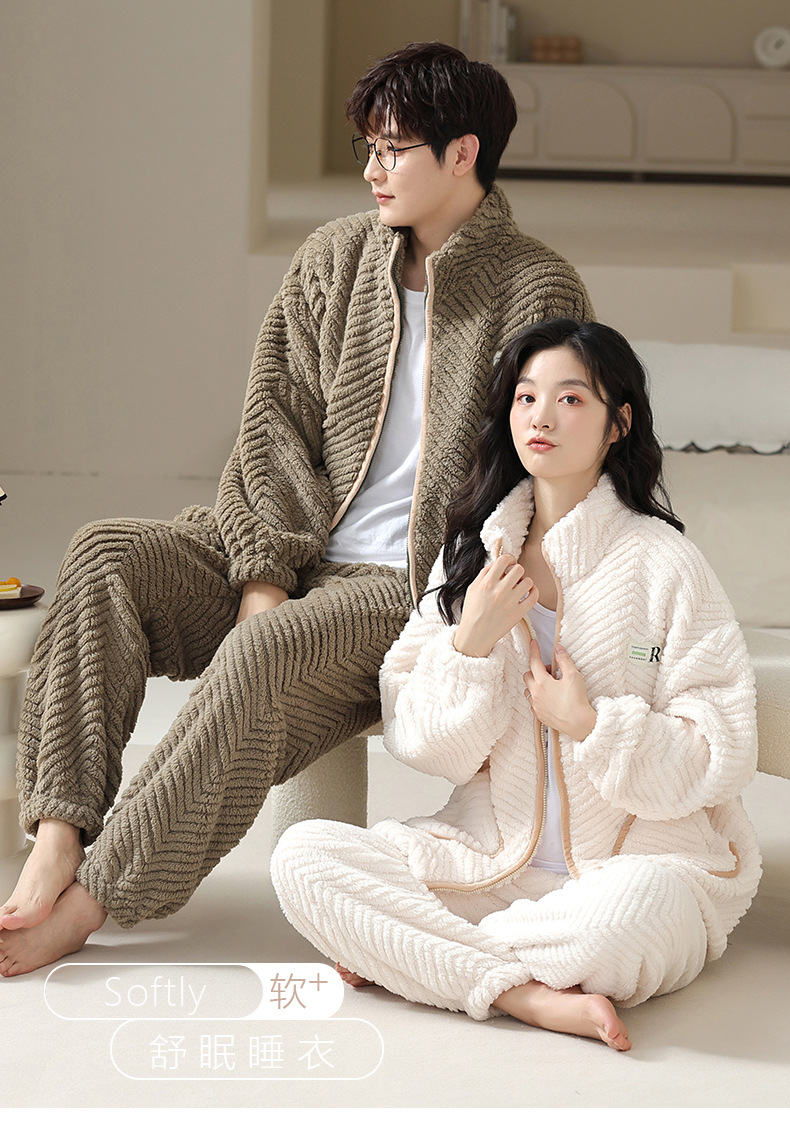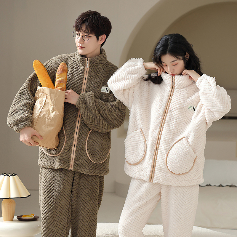 겨울 커플 잠옷 여성용 산호 벨벳 지퍼 심플 긴팔 스탠드 칼라 보온 세트 두꺼운 남성용 홈웨어스토어 가기