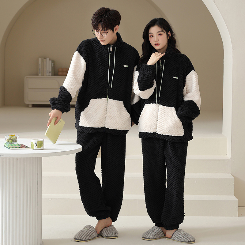 겨울 커플 잠옷 여성용 산호 벨벳 지퍼 심플 긴팔 스탠드 칼라 보온 세트 두꺼운 남성용 홈웨어