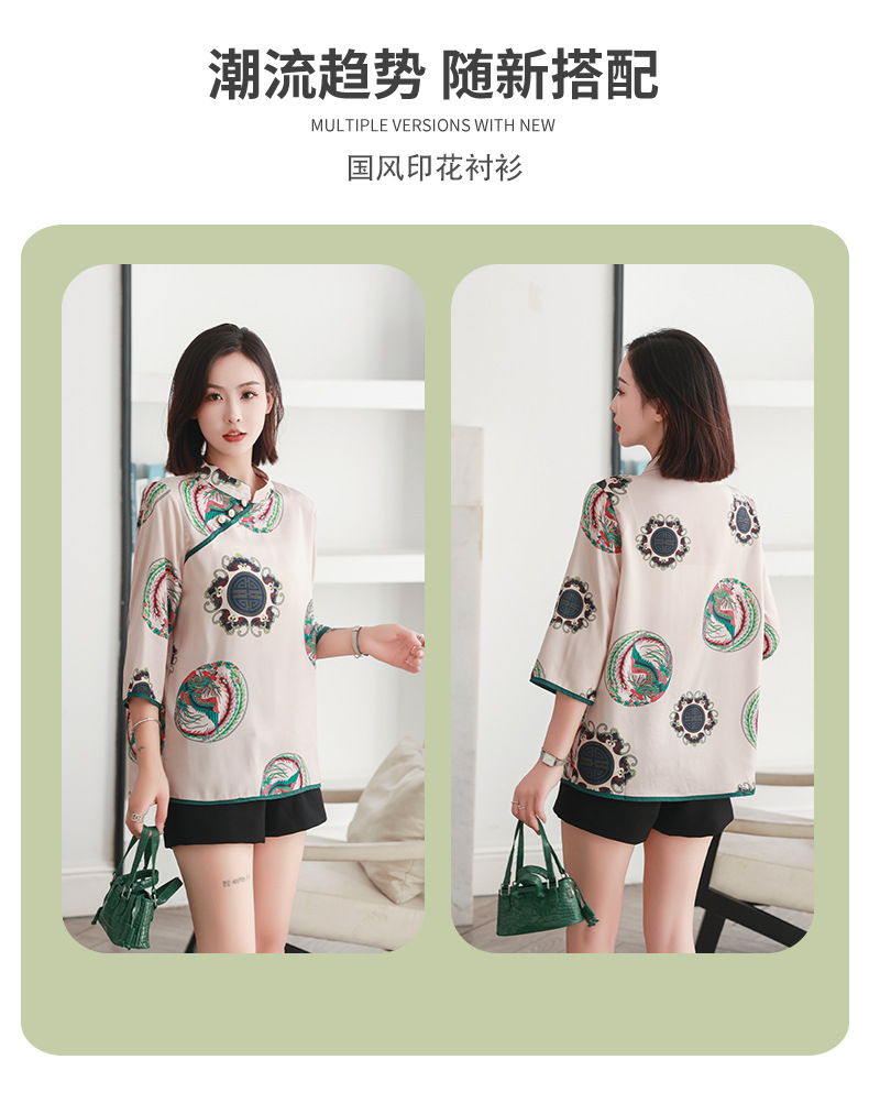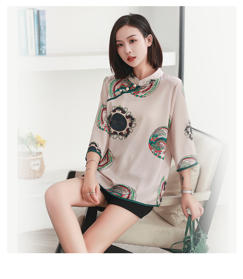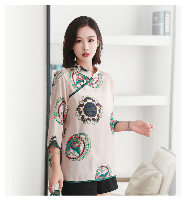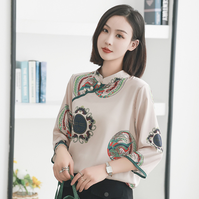 리얼 샷 2023 여름 새로운 복고풍 에스닉 스타일 실크 인쇄 진주 버클 경사 중국 스타일 여성용 림 탑스토어 가기