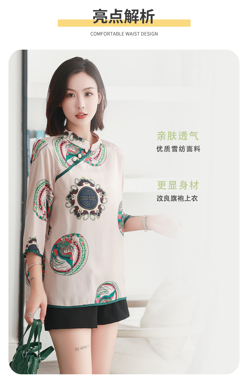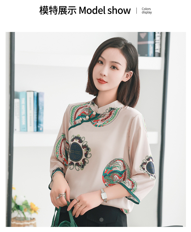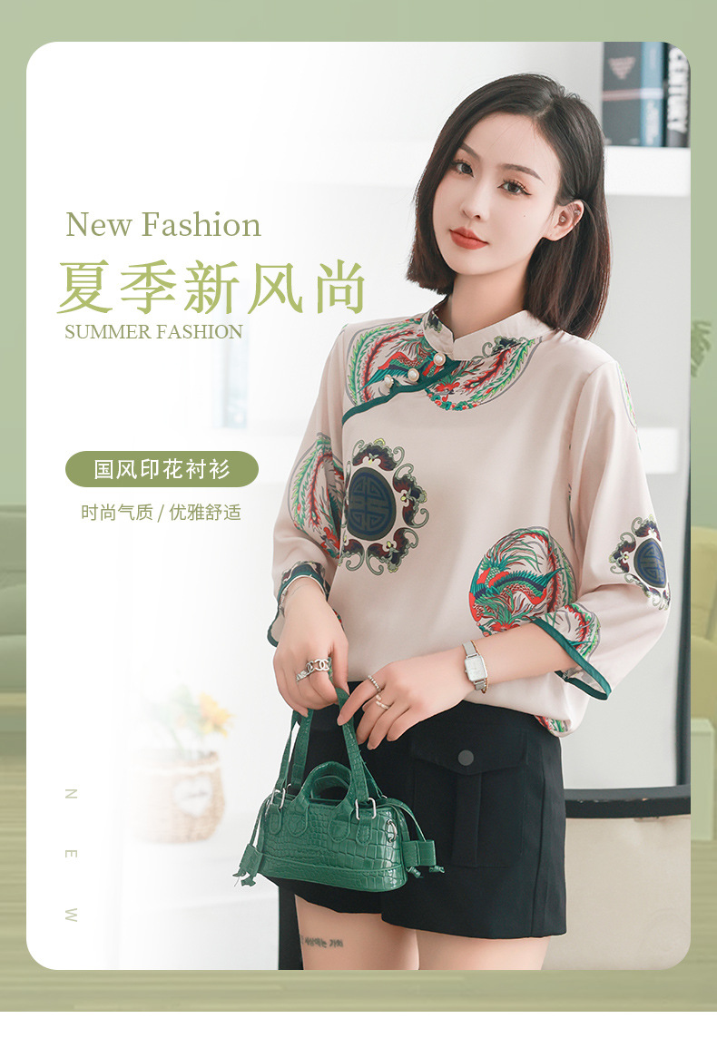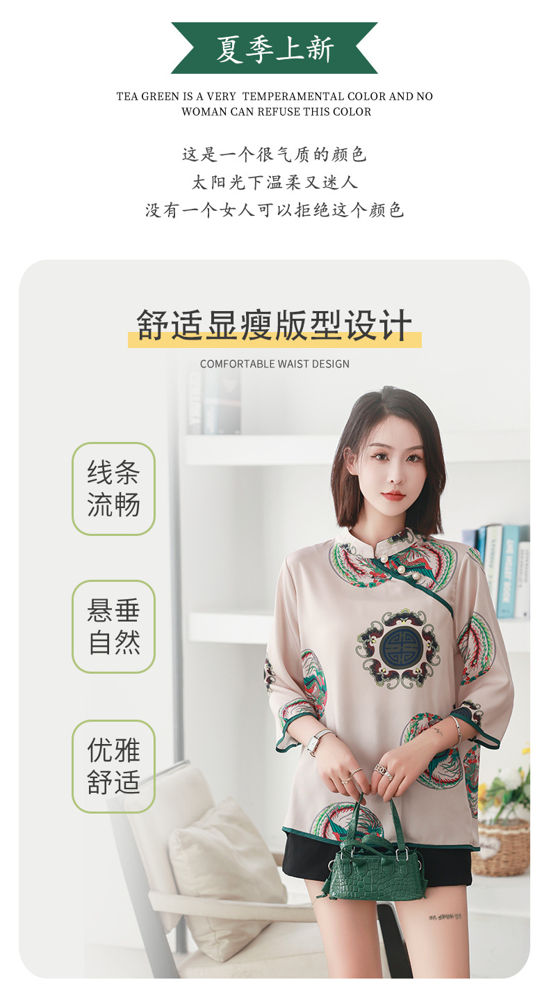 리얼 샷 2023 여름 새로운 복고풍 에스닉 스타일 실크 인쇄 진주 버클 경사 중국 스타일 여성용 림 탑스토어 가기