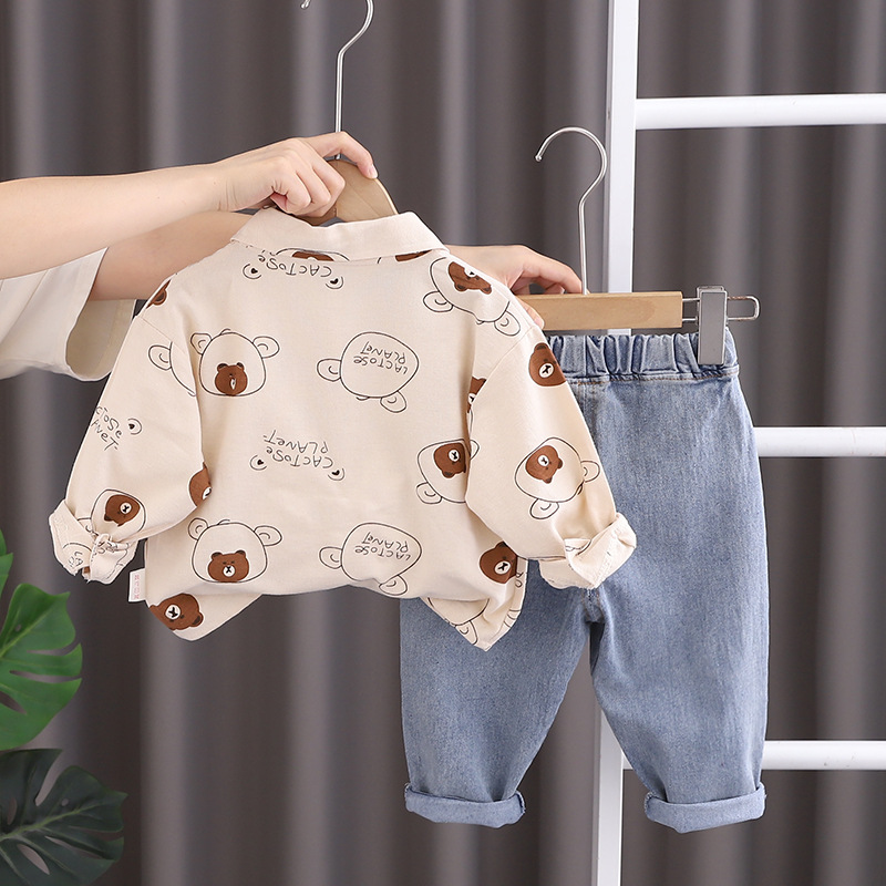소년 가을 의류 제조 업체 도매 2023 봄과 가을 새 아기 옷 어린이 전체 인쇄 곰 긴 소매 셔츠 세트