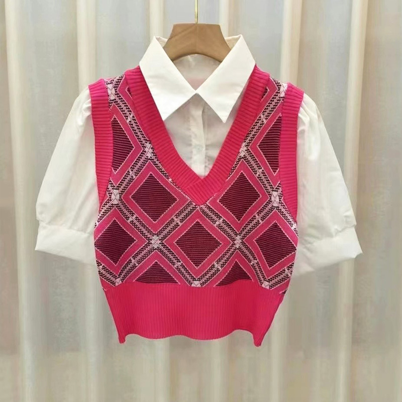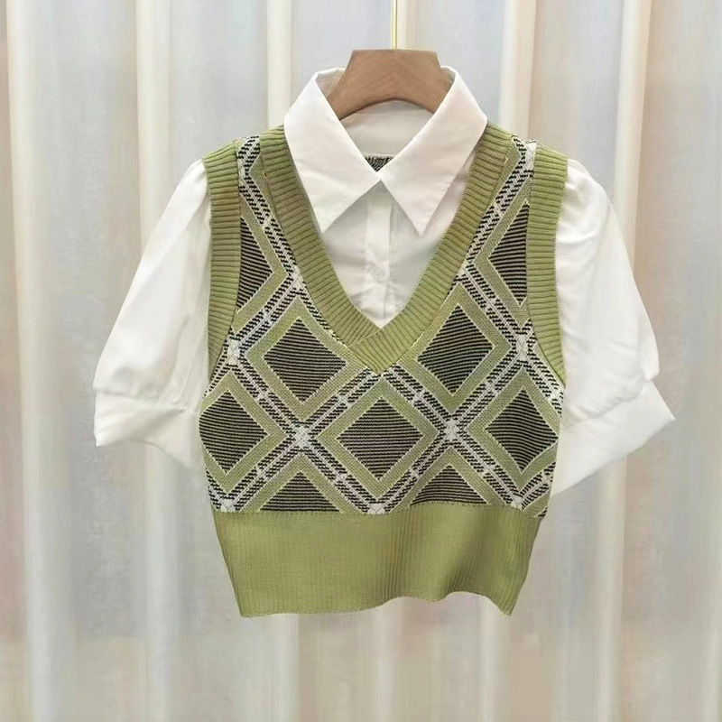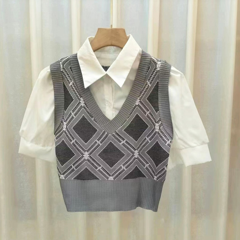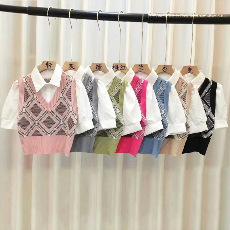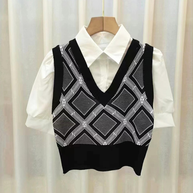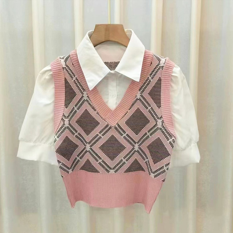 빈티지 폴로 칼라 스트라이프 니트 반팔 티셔츠 여성용 여름 새로운 슬림핏 셔츠 짧은 가짜 투피스 탑