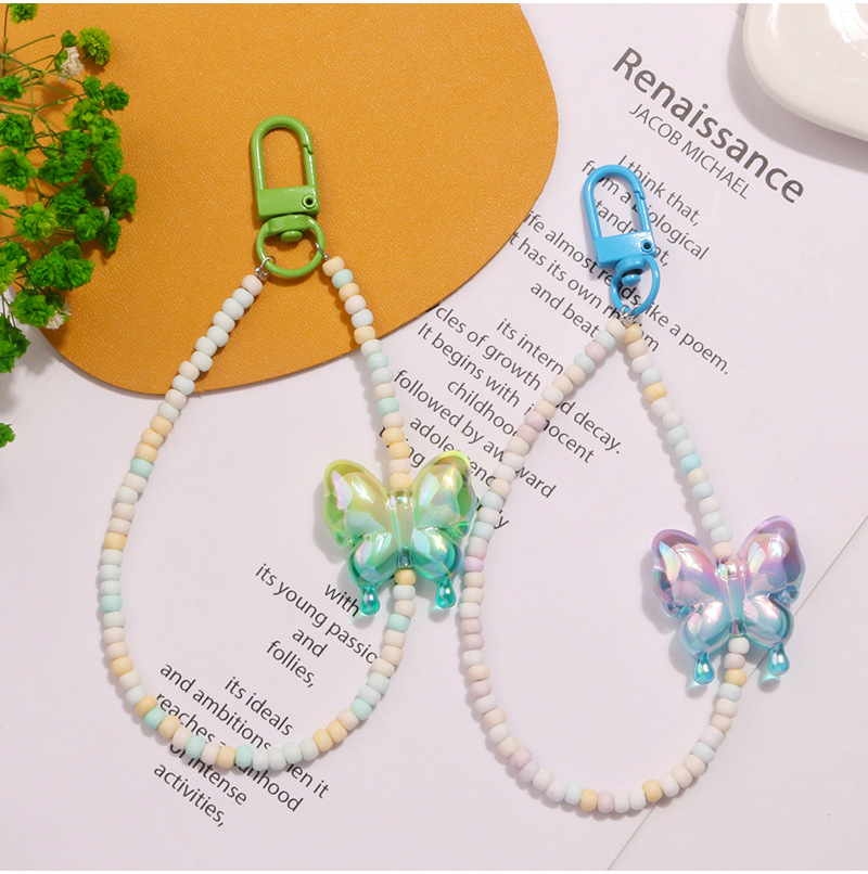 새로운 아크릴 그라디언트 나비 키 체인 펜던트 귀여운 색상 쌀 구슬 체인 액세서리 헤드셋 가방 장식