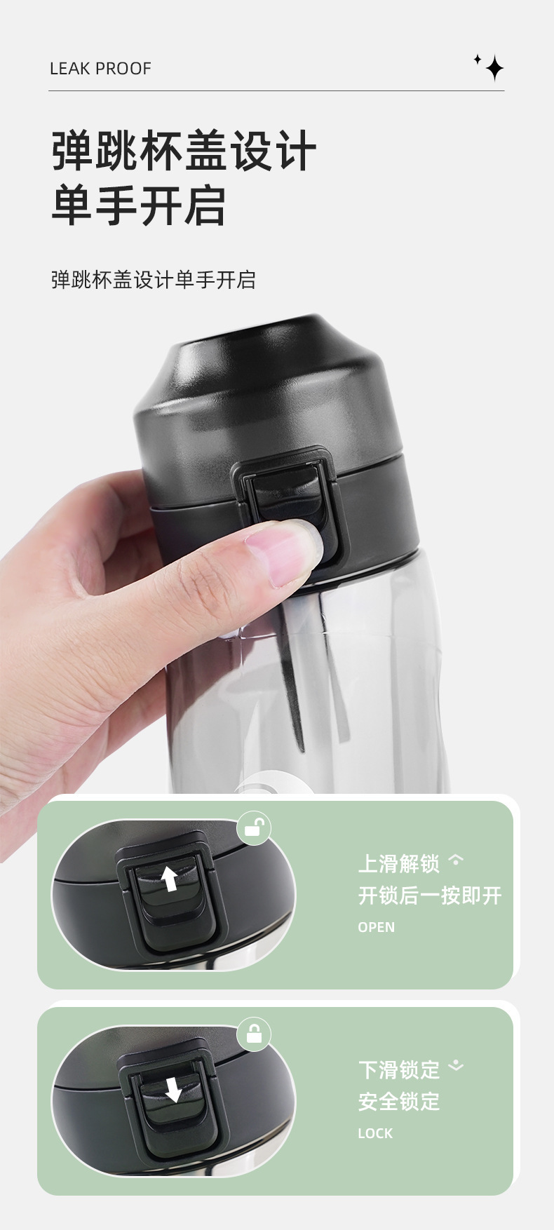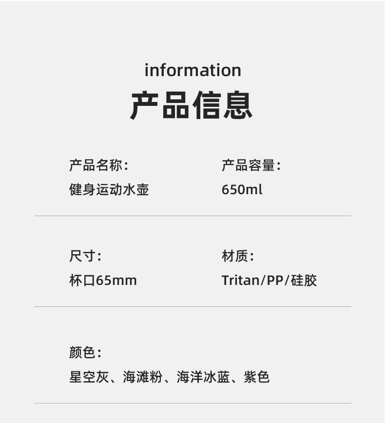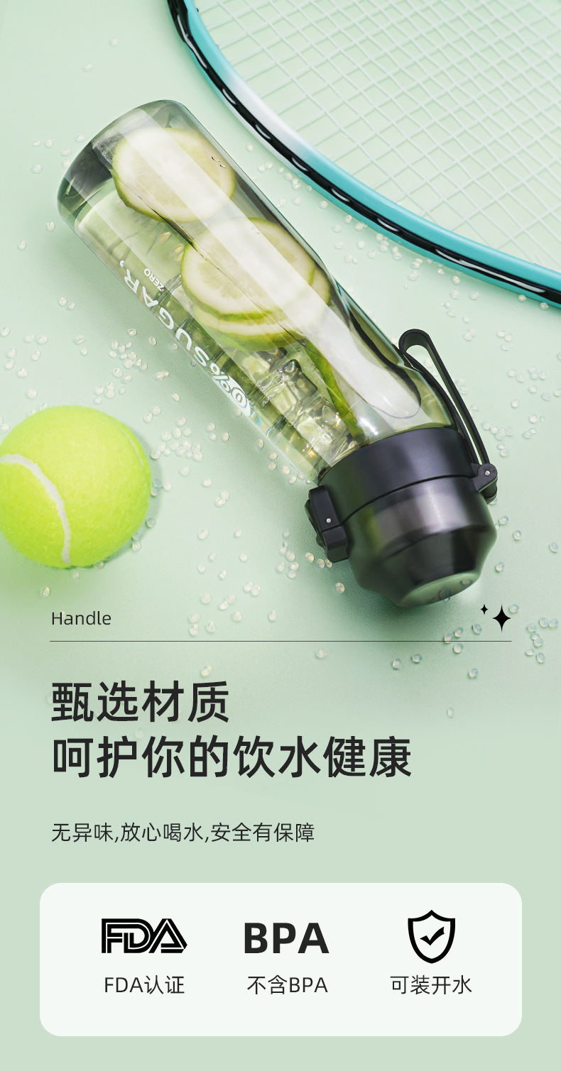 产品材质:瓶身Tritan ,不含BPA,盖子:PP,杯嘴吸管:硅胶