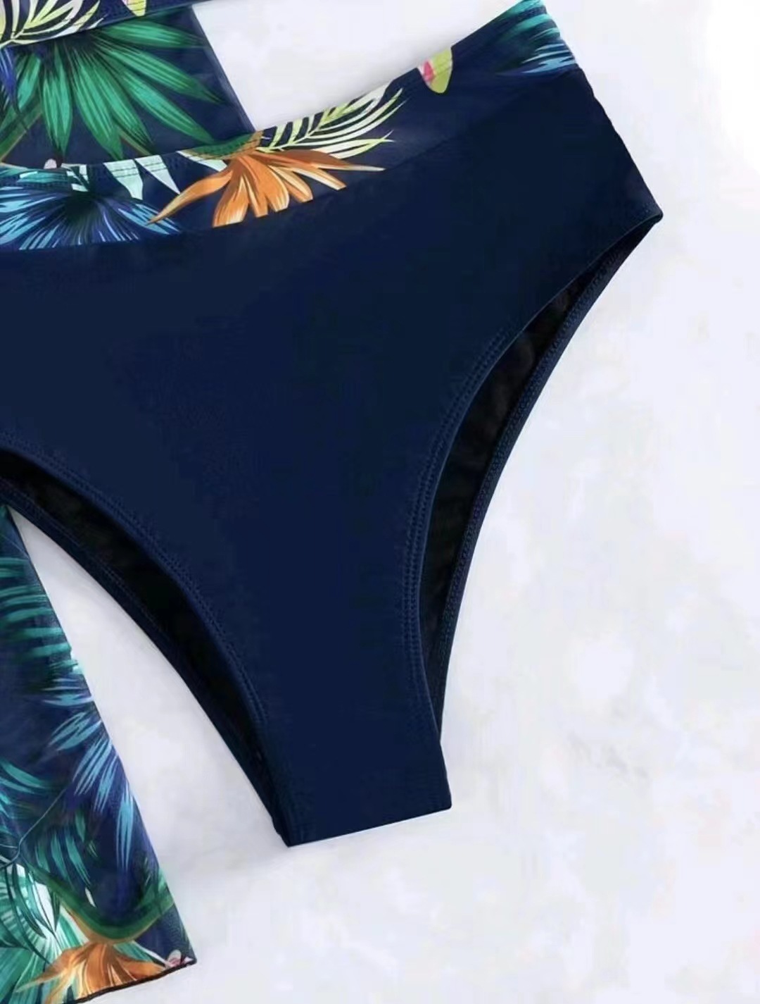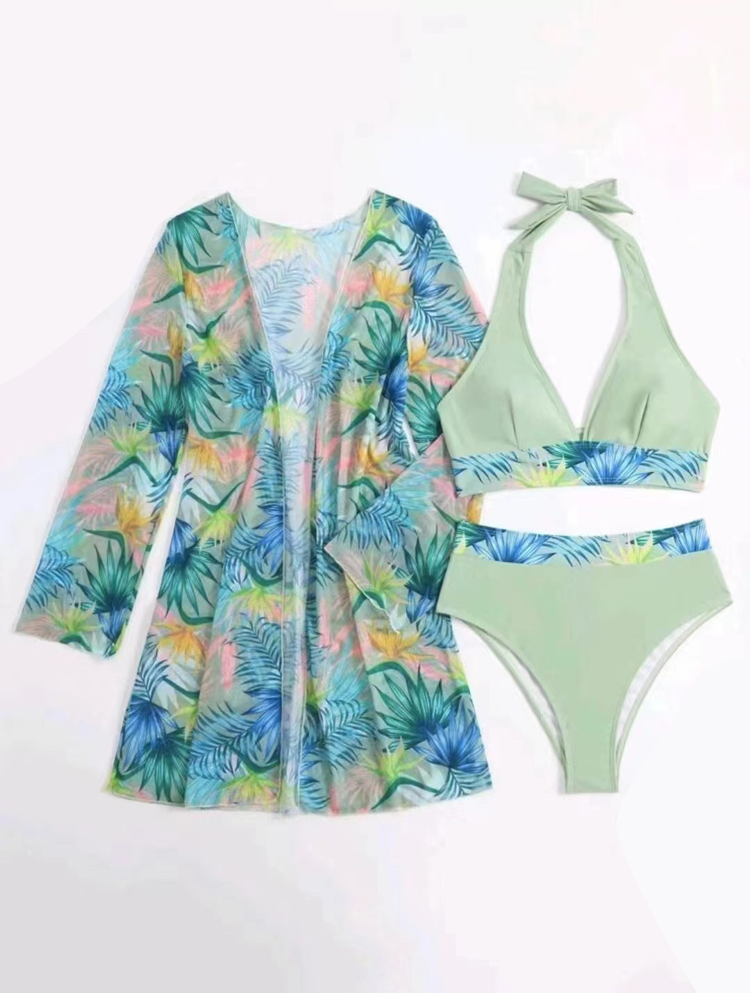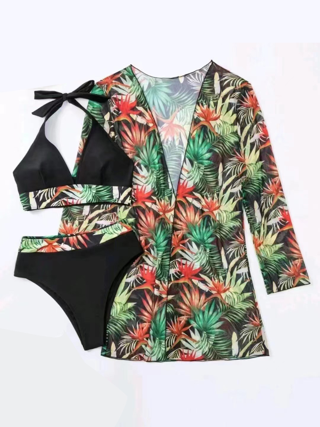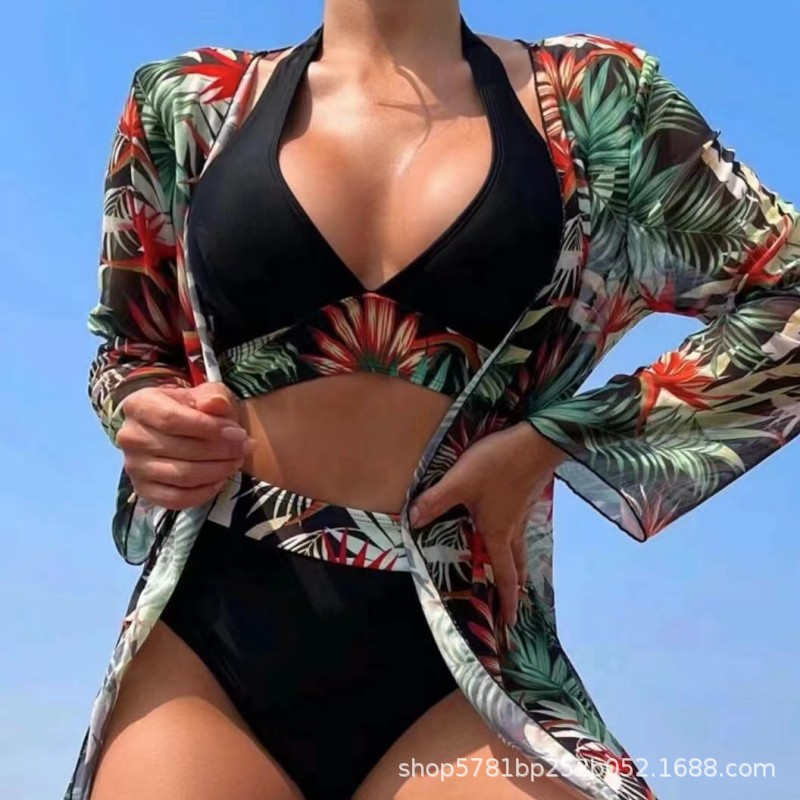 2023 새로운 크로스 보더 유럽과 미국의 섹시한 비키니 메쉬 3 피스 세트 아마존 푸시 업 스플릿 프린트 수영복 여성용스토어 가기