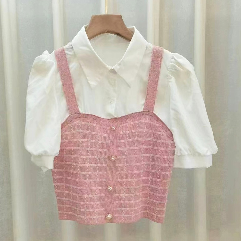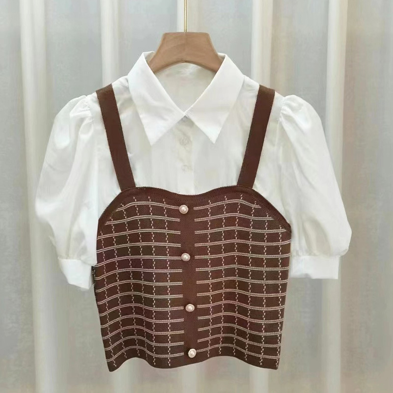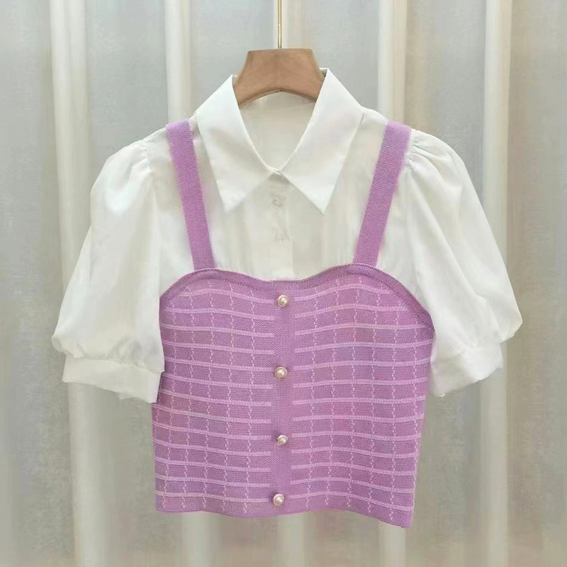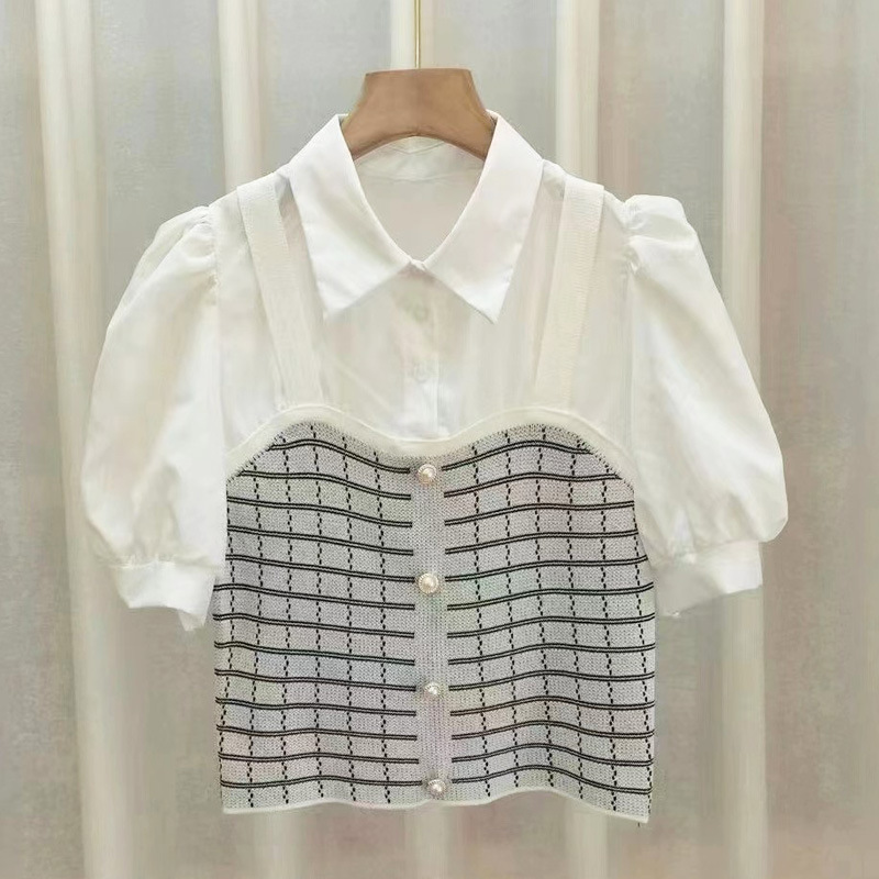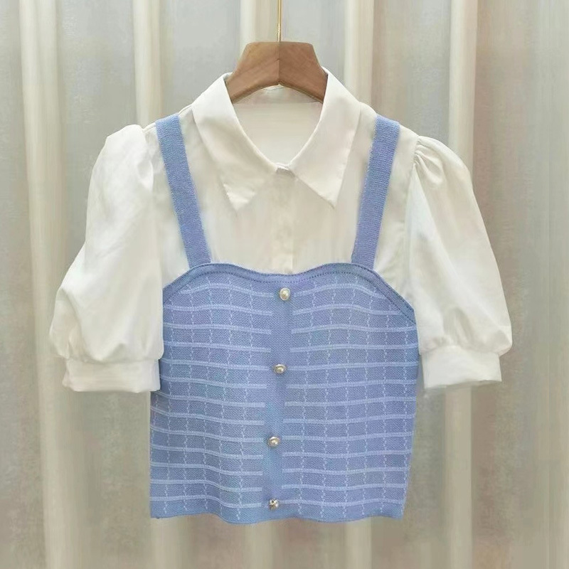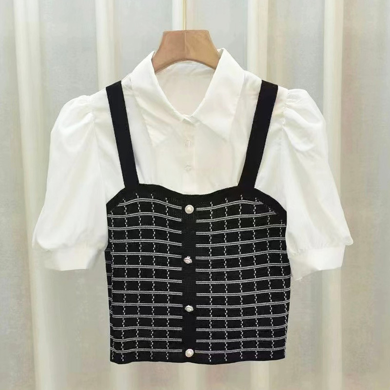 여름 새로운 나이 감소 스티치 니트 페이크 투피스 올매치 리프 헴 슬림핏 여성용 퍼프 반팔 셔츠