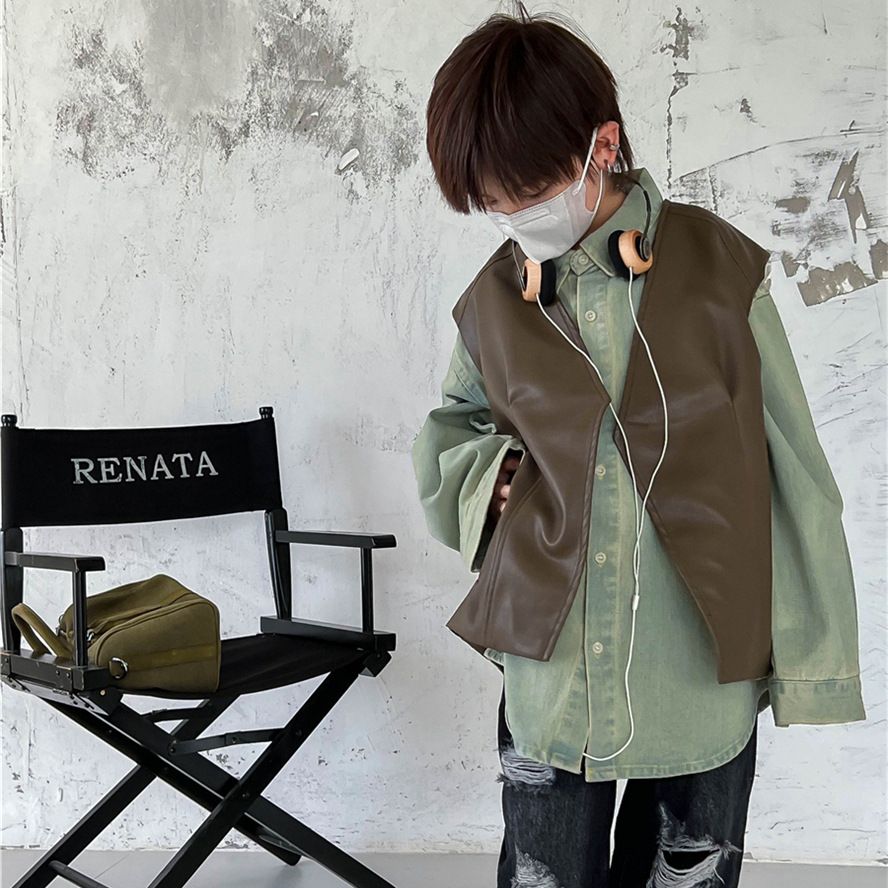 가을 2023 새로운 어린이 가죽 조끼 한국 스타일 복고풍 프로필 어깨 패드 조끼 소년 소녀 가벼운 럭셔리 유행 조끼스토어 가기