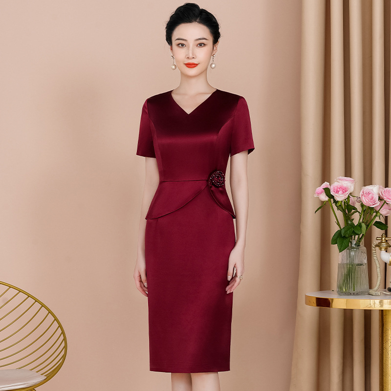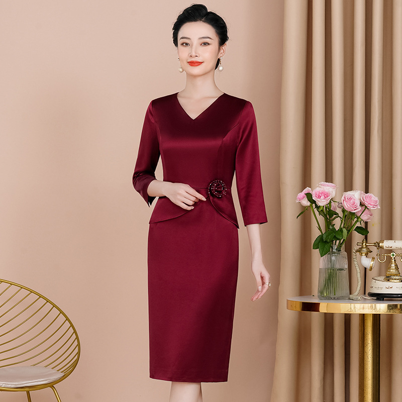 가을 2023 새로운 Demure 우아한 V-넥 배꼽 커버 슬리밍 원피스 젊은 해피 어머니 아세트산 버건디 원피스