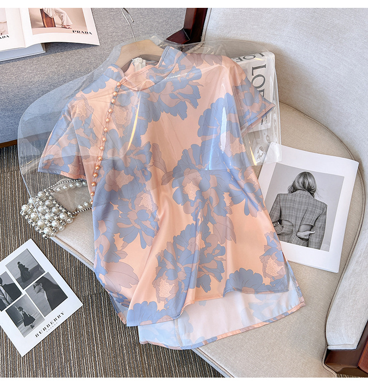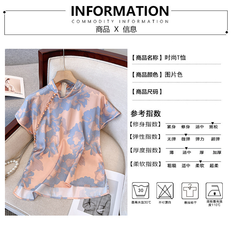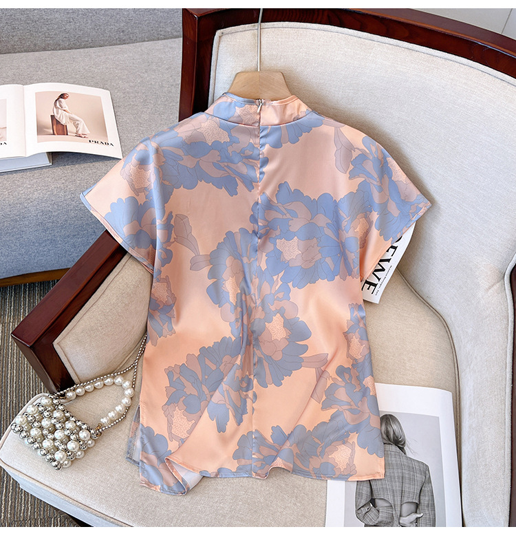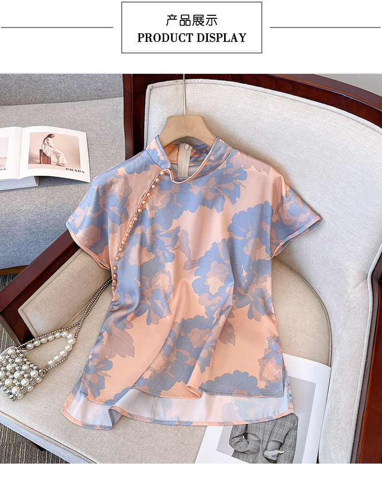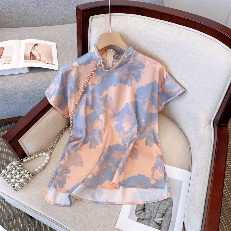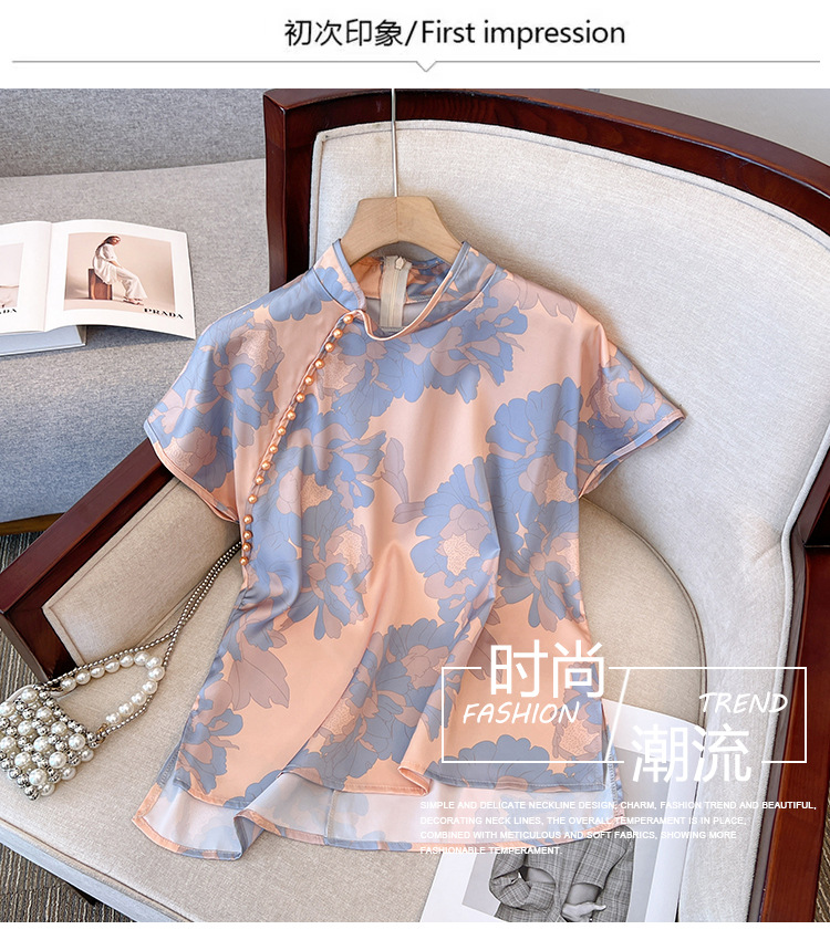 리얼 샷 새로운 중국 빛 Guofeng 실크 반소매 탑 2023 여름 새로운 인쇄 복고풍 풀오버 셔츠