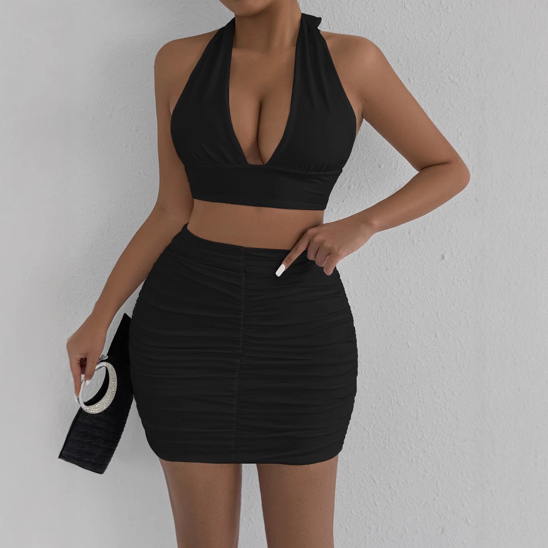 크로스보더 여성용 홀터넥 끈이 달린 힙허깅 스커트 투피스 세트, 유럽 및 미국 스타일의 배꼽 노출 주름 V넥 슬립 스커트, 패셔너블하고 우아한스토어 가기