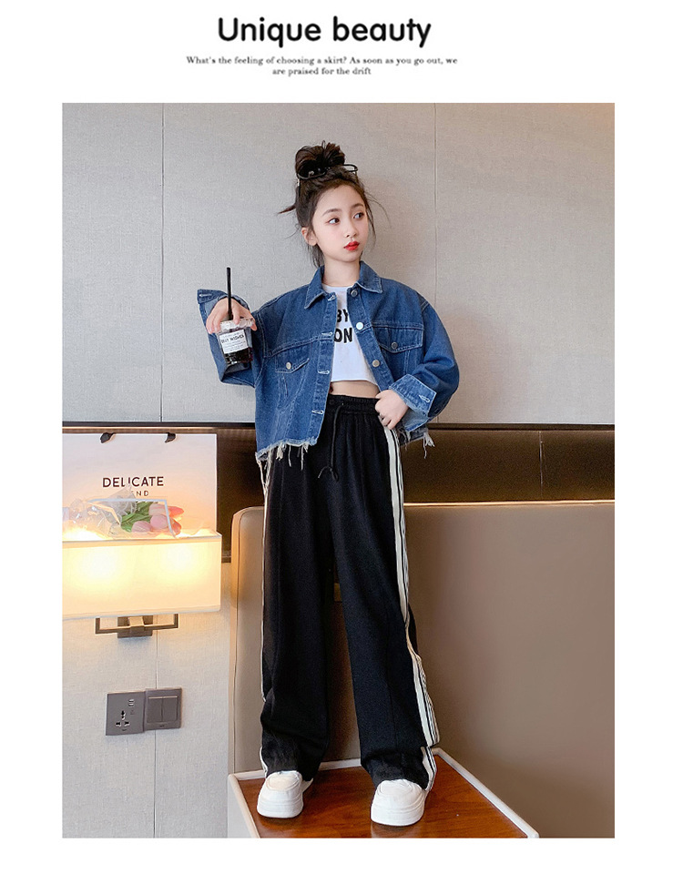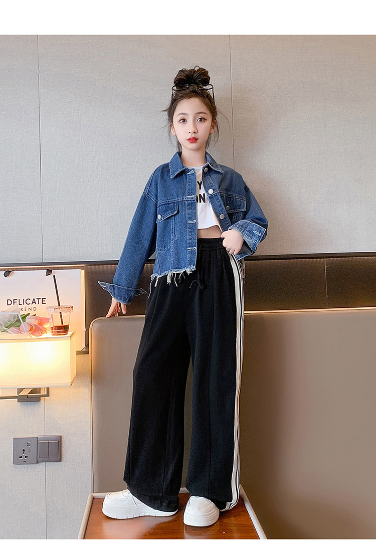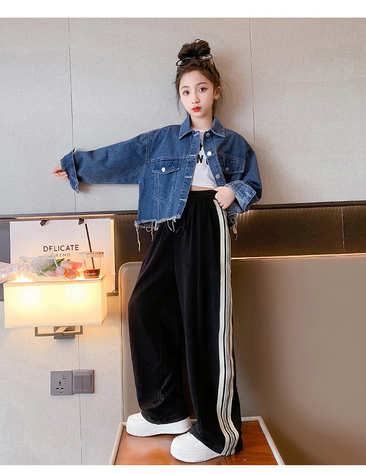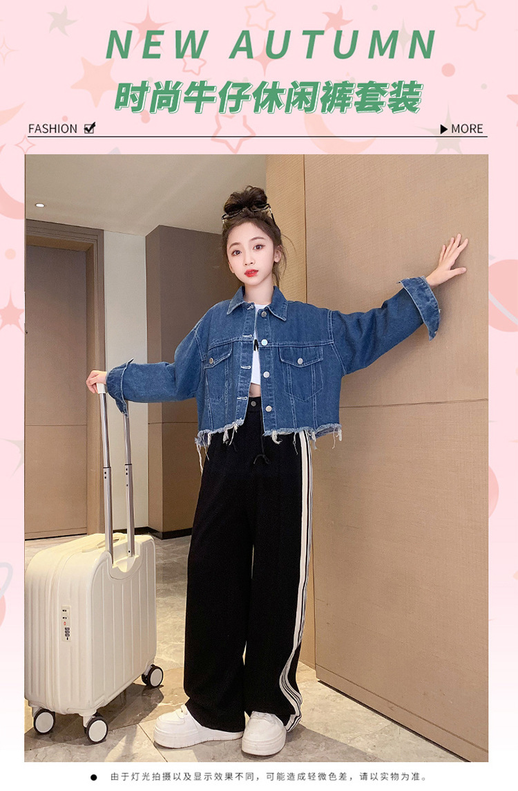 여자 봄과 가을 세트 프라이드 스트리트 외국 스타일 2023 새로운 어린이 데님 코트 바지 큰 어린이를위한 캐주얼 2 종 세트스토어 가기