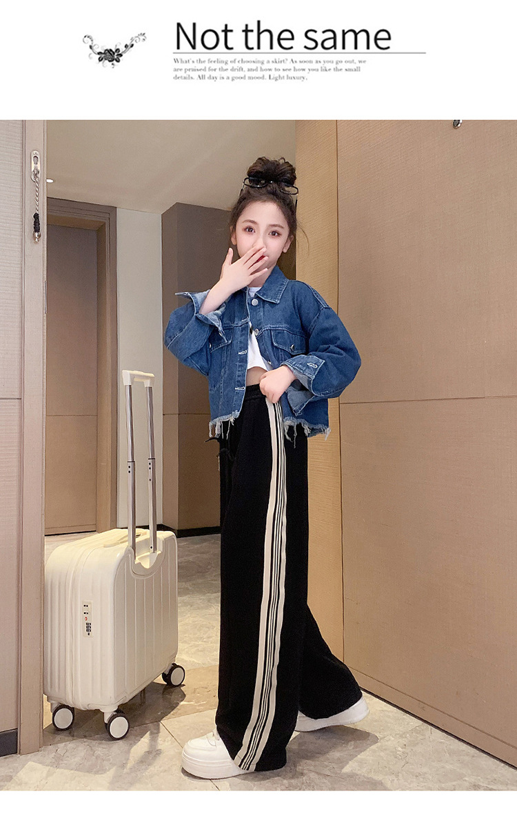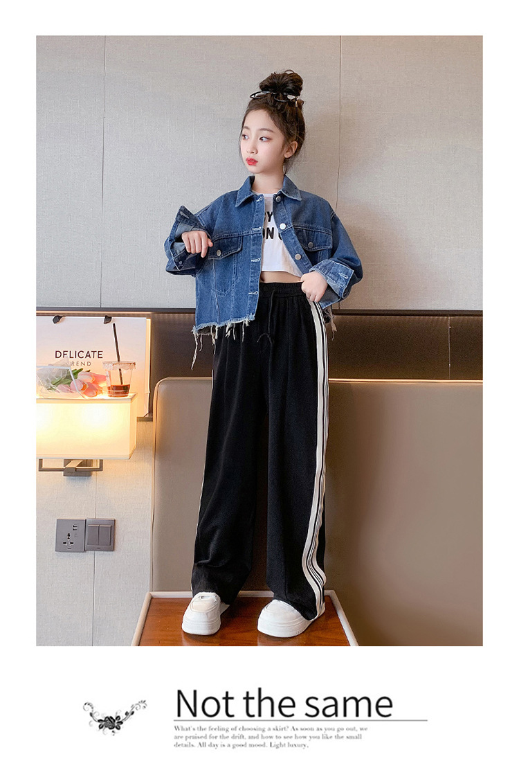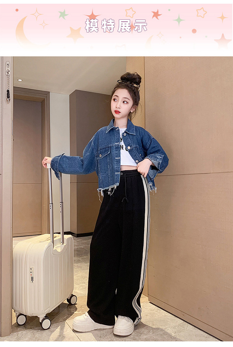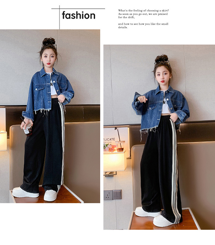 여자 봄과 가을 세트 프라이드 스트리트 외국 스타일 2023 새로운 어린이 데님 코트 바지 큰 어린이를위한 캐주얼 2 종 세트스토어 가기