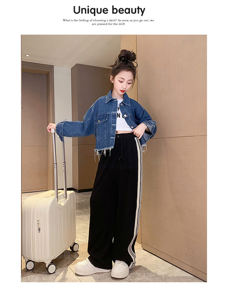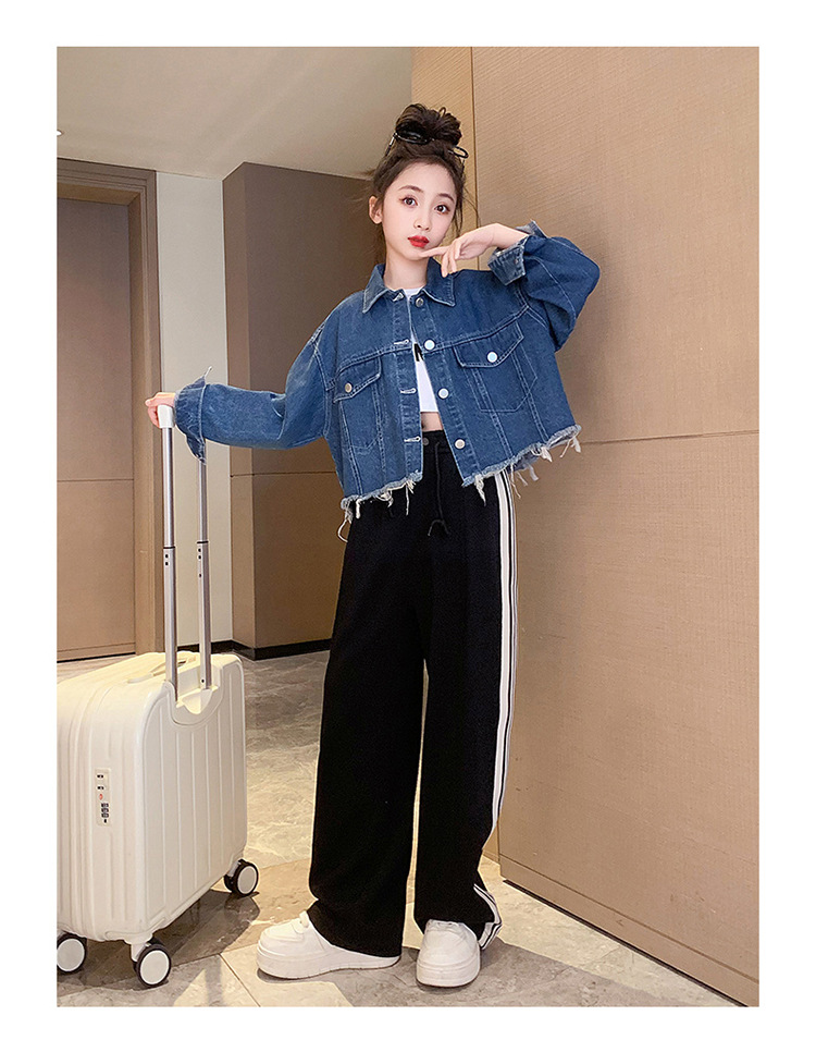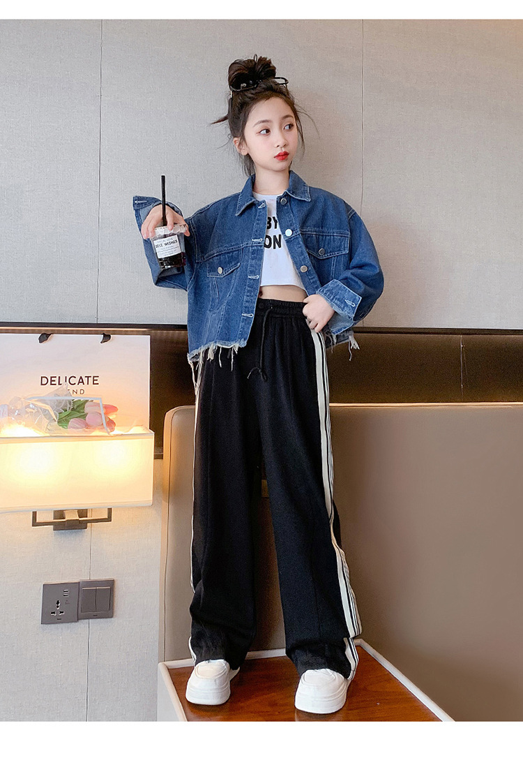 여자 봄과 가을 세트 프라이드 스트리트 외국 스타일 2023 새로운 어린이 데님 코트 바지 큰 어린이를위한 캐주얼 2 종 세트